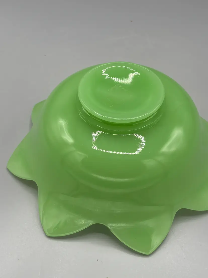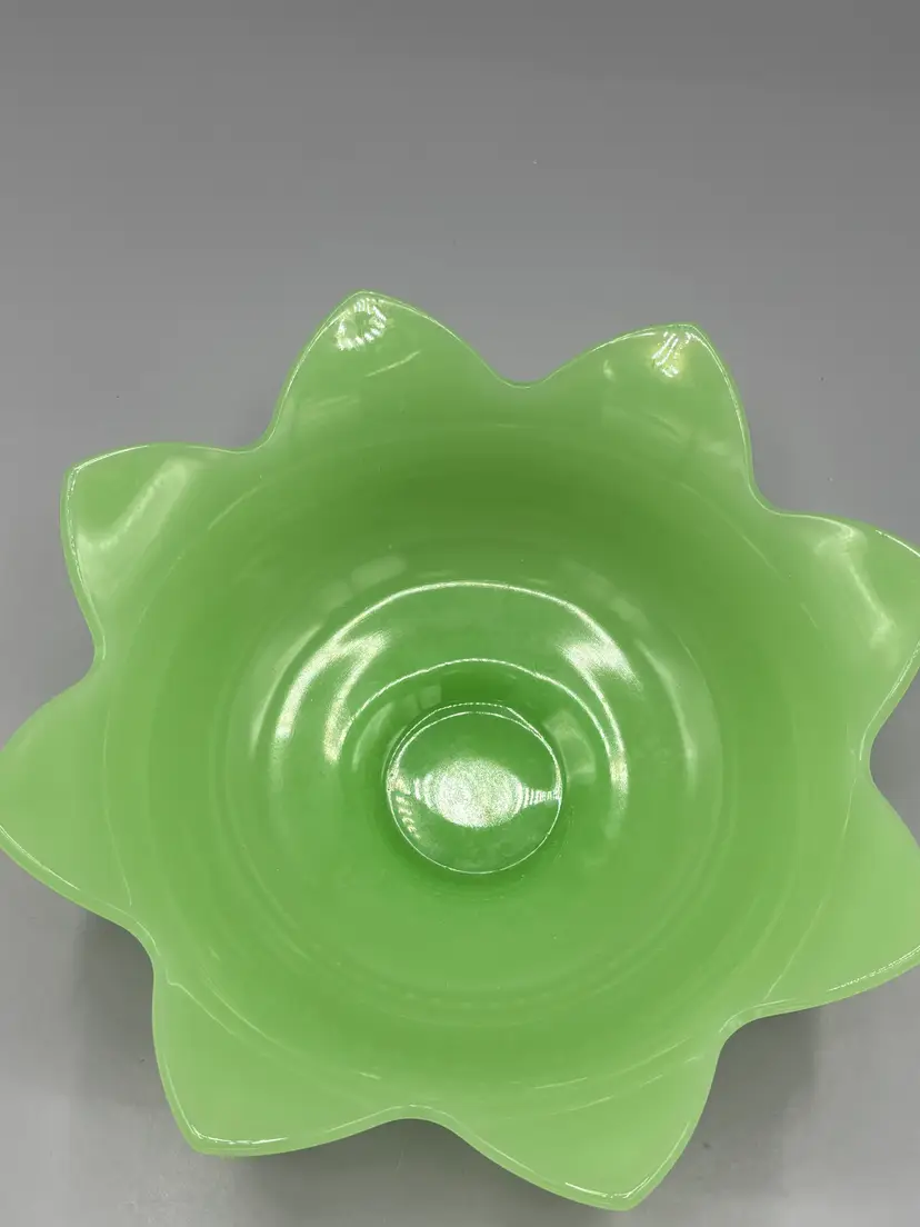 Discover the timeless elegance of this vintage Fenton jadeite console bowl, featuring an exquisite lotus flower design. Crafted in soft, luminous jadeite glass, this decorative piece showcases the artistry Fenton was renowned for. Measuring 8½ inches wide by 3½ inches deep, it's perfectly sized for displaying on a shelf, dresser, or console table. An ideal addition for collectors of vintage glassware and those who appreciate mid-century home décor.