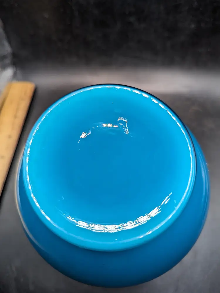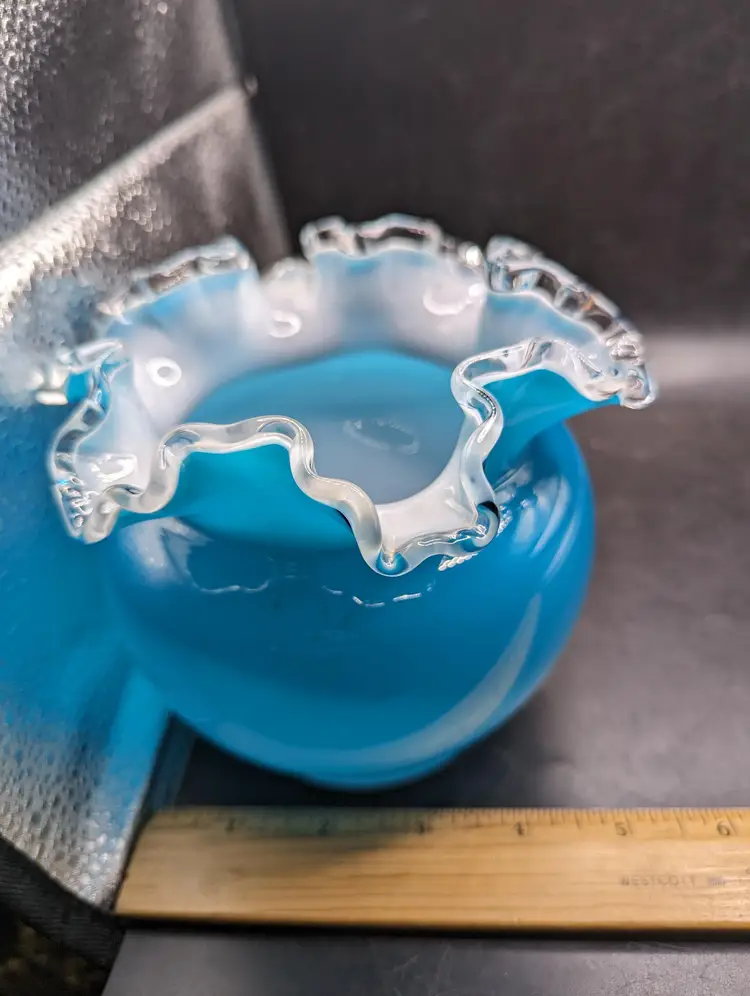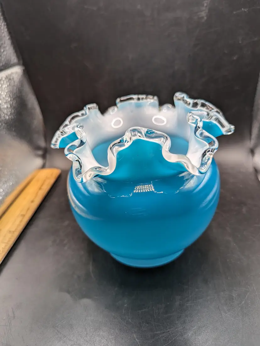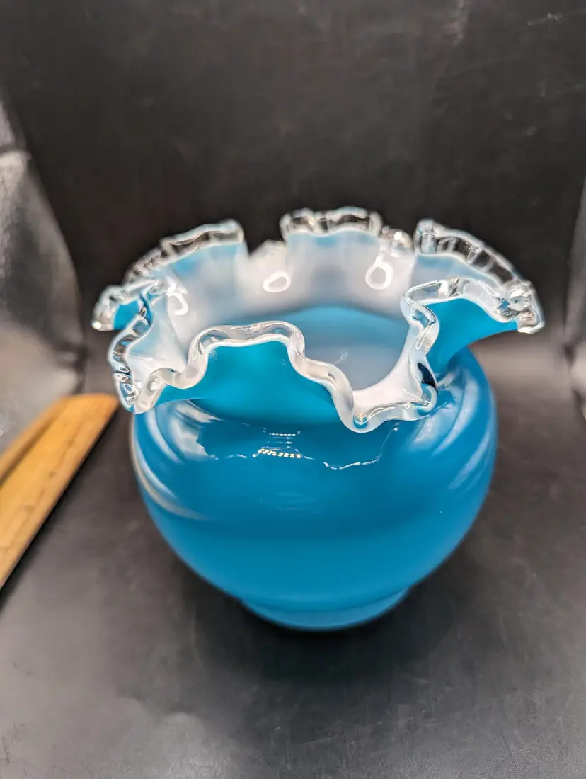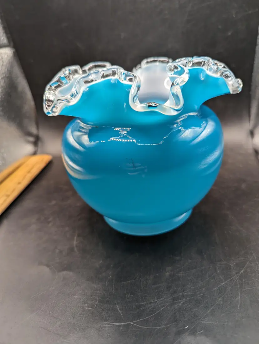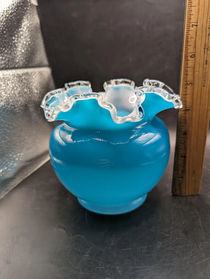 Add a pop of color to your decor with this vintage blue Fenton glass vase featuring a charming ruffled edge. Perfect for displaying flowers or as a standalone piece. Please see all photos for details and condition.