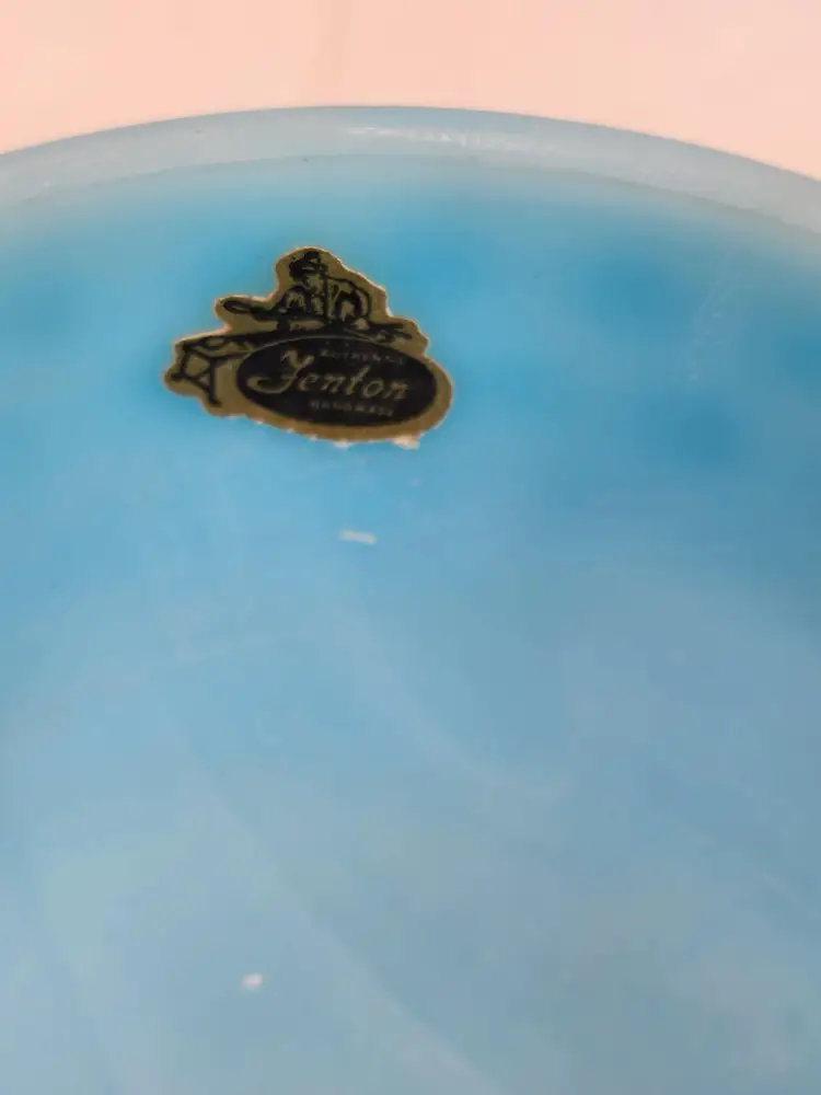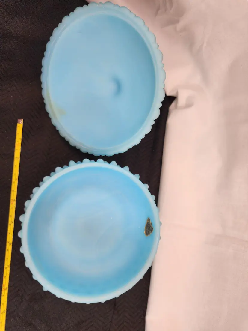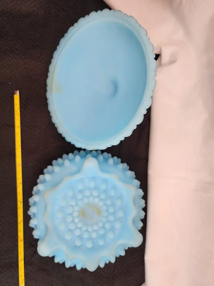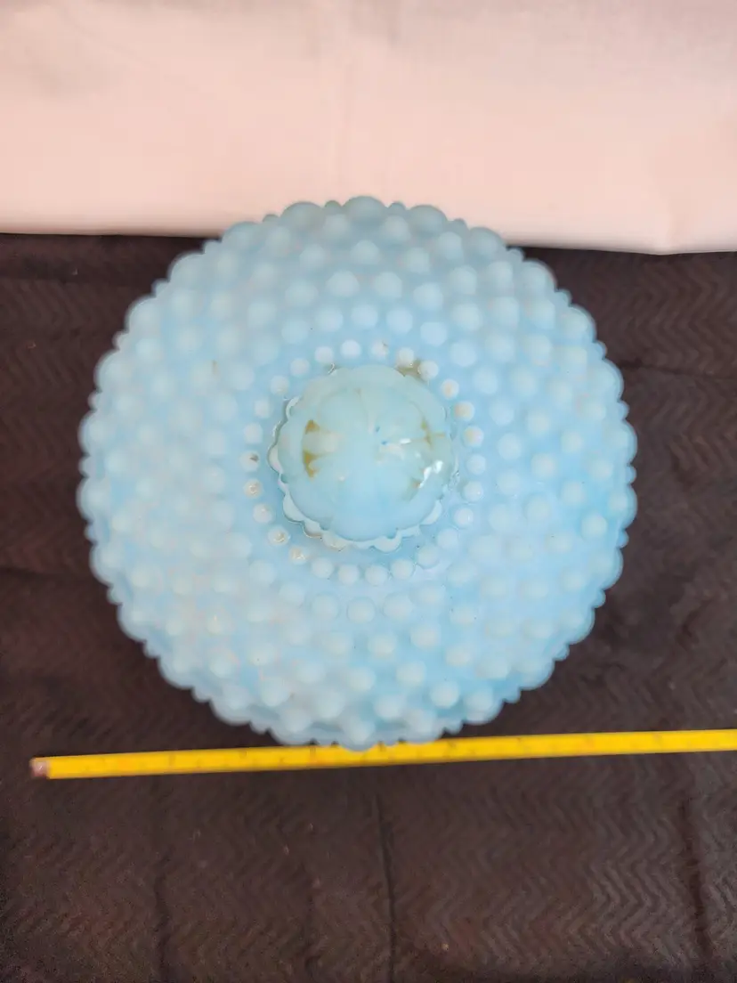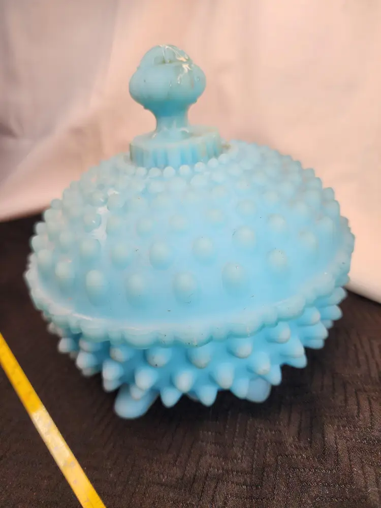 Vintage Fenton Light Turquoise Blue Hobnail Milk Glass Footed Lidded Candy Dish- As-is Condition due to staining. No cracks/chips