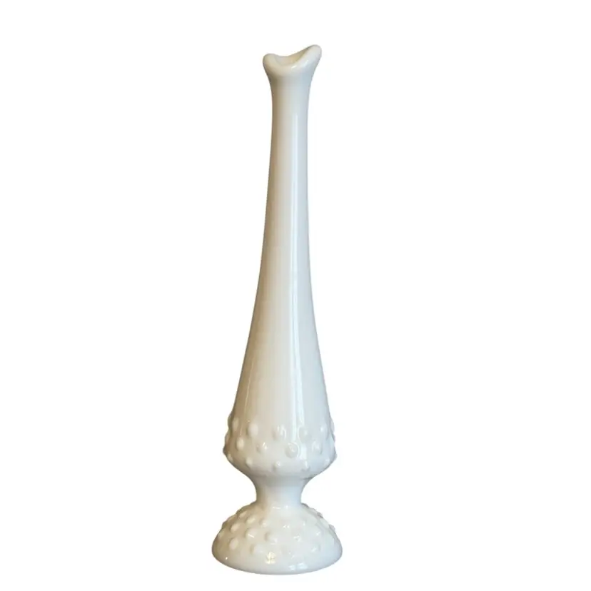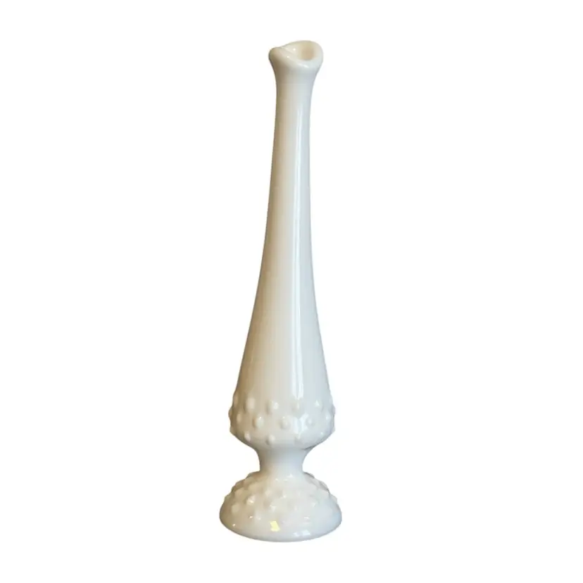 Vintage Fenton Hobnail Milk Glass Bud Vase. Swung Hand Blown Vase. White. Measures approximately 9”H. Inside bottom has rust stain from water. Otherwise Excellent Vintage Condition.