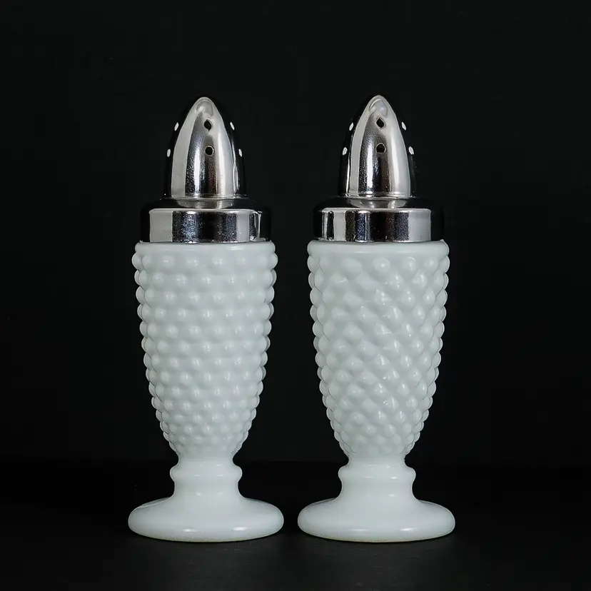 Add a touch of retro elegance to your kitchen or collectibles shelf with this classic Fenton-style milk glass salt and pepper shakers. Featuring a crisp white hobnail body and a smooth pedestal base, this shaker blends timeless texture with mid-century charm.