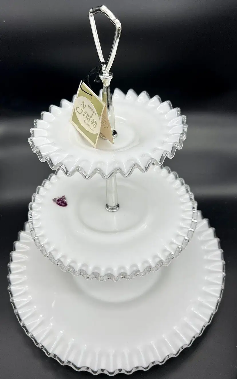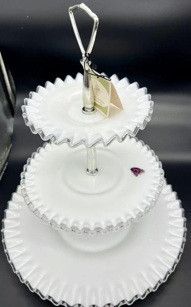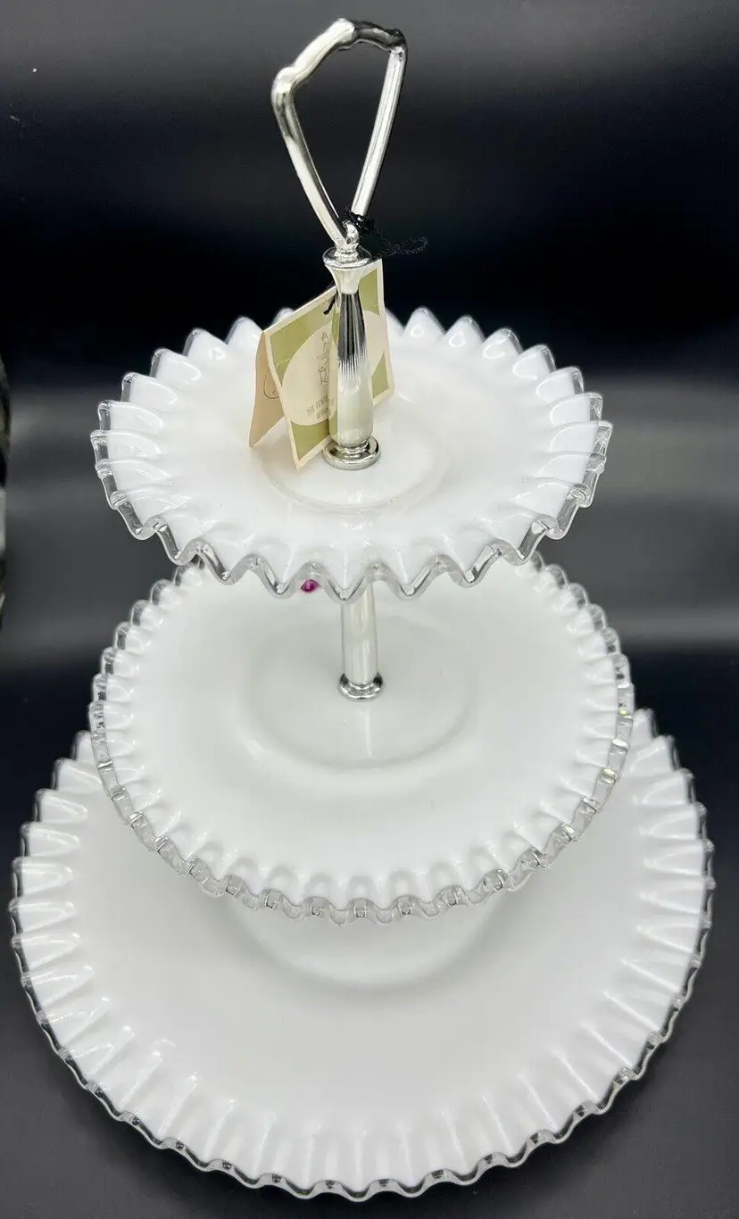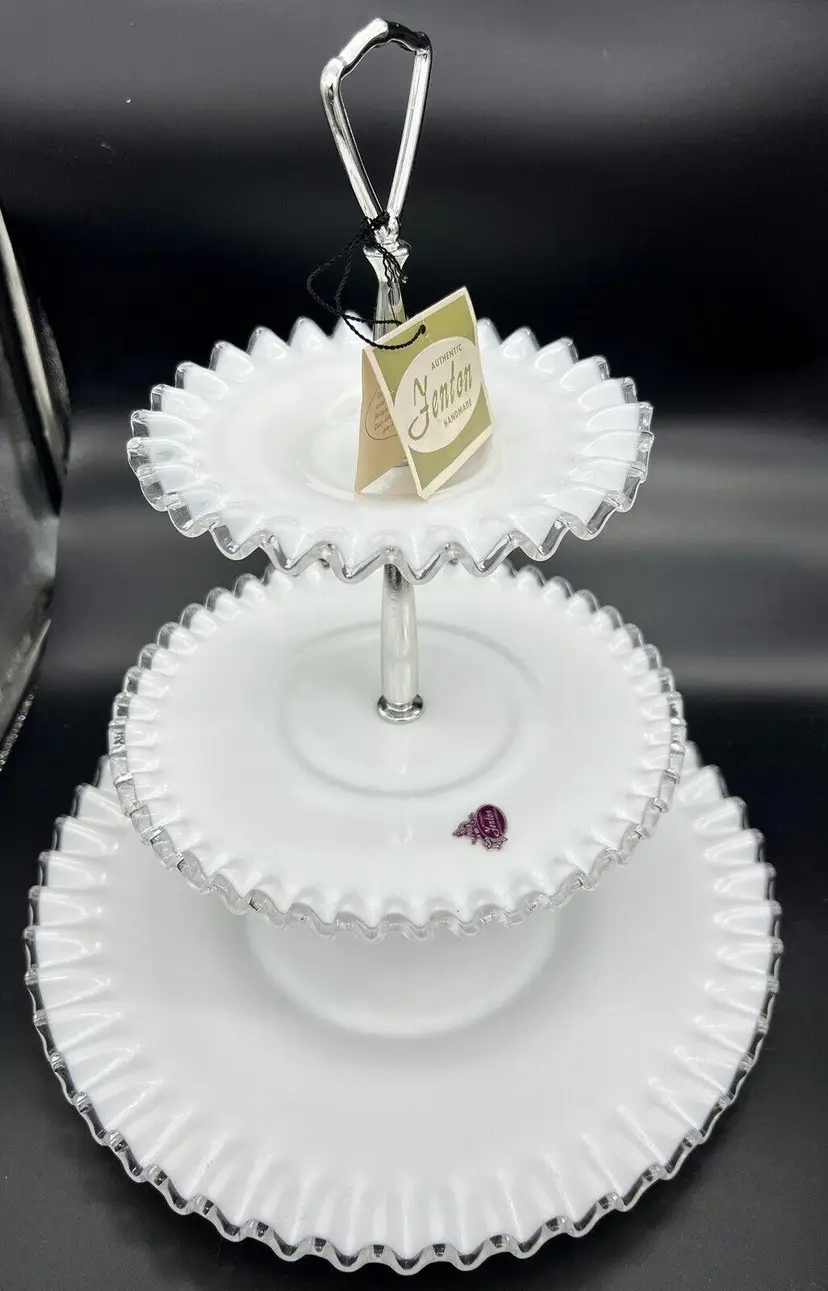 Vintage mid-century Fenton 3 tier tidbit serving tray White milk glass with clear Silvercrest ruffled edges Silvertone handle Approximately 14.5” The tiered plates are approximately: 12.5”, 8.5” and 6” in diameter. Includes original foil sticker and original paper hang tag. No chips or cracks. Bottom has some shelf wear.