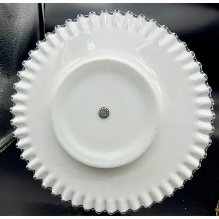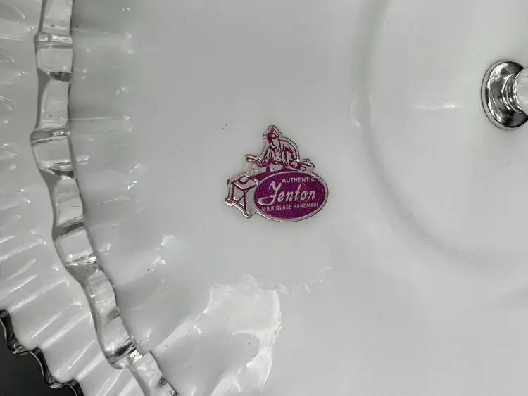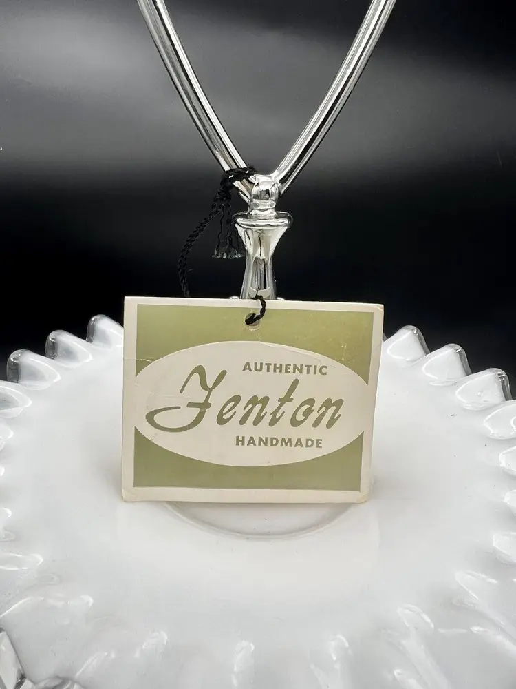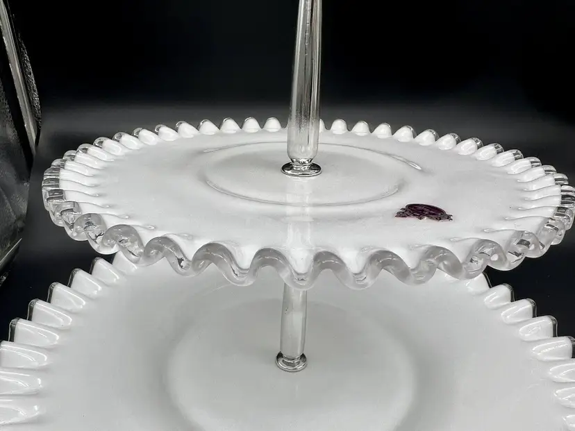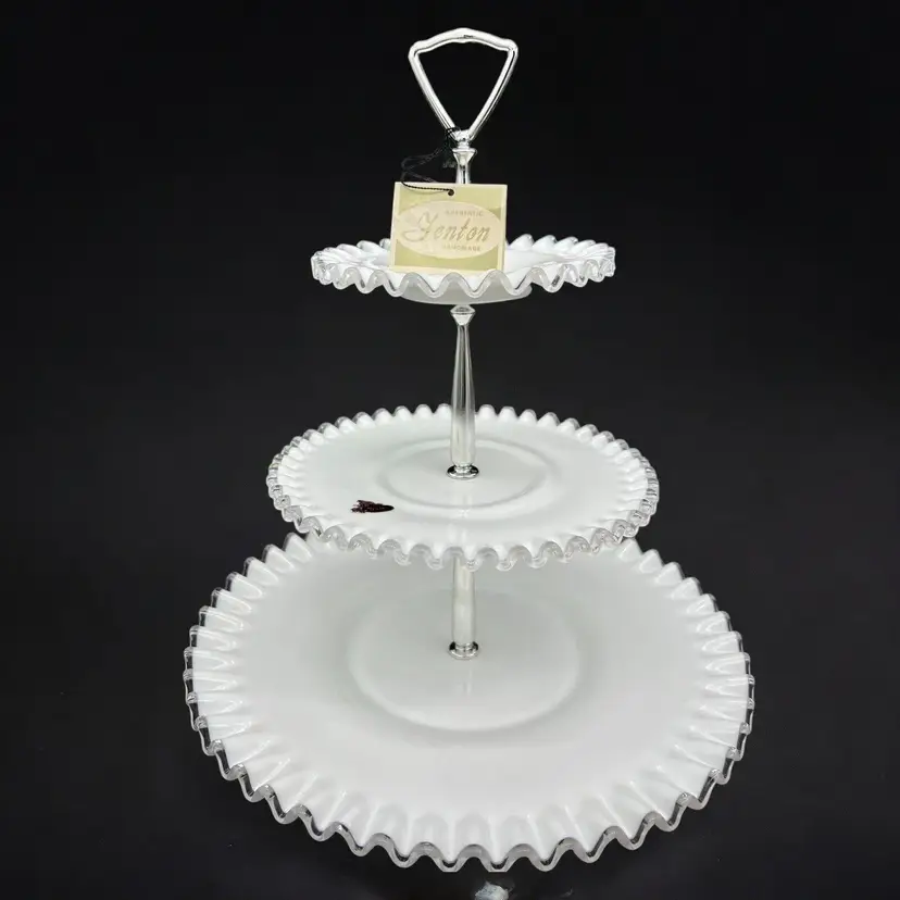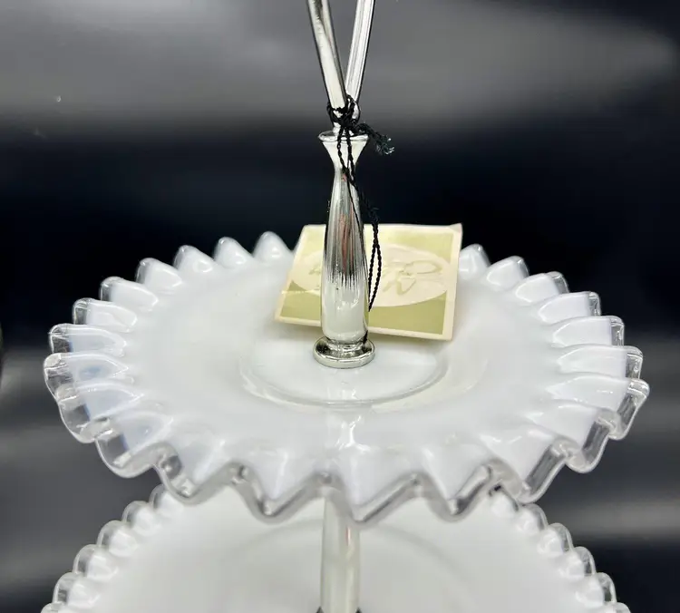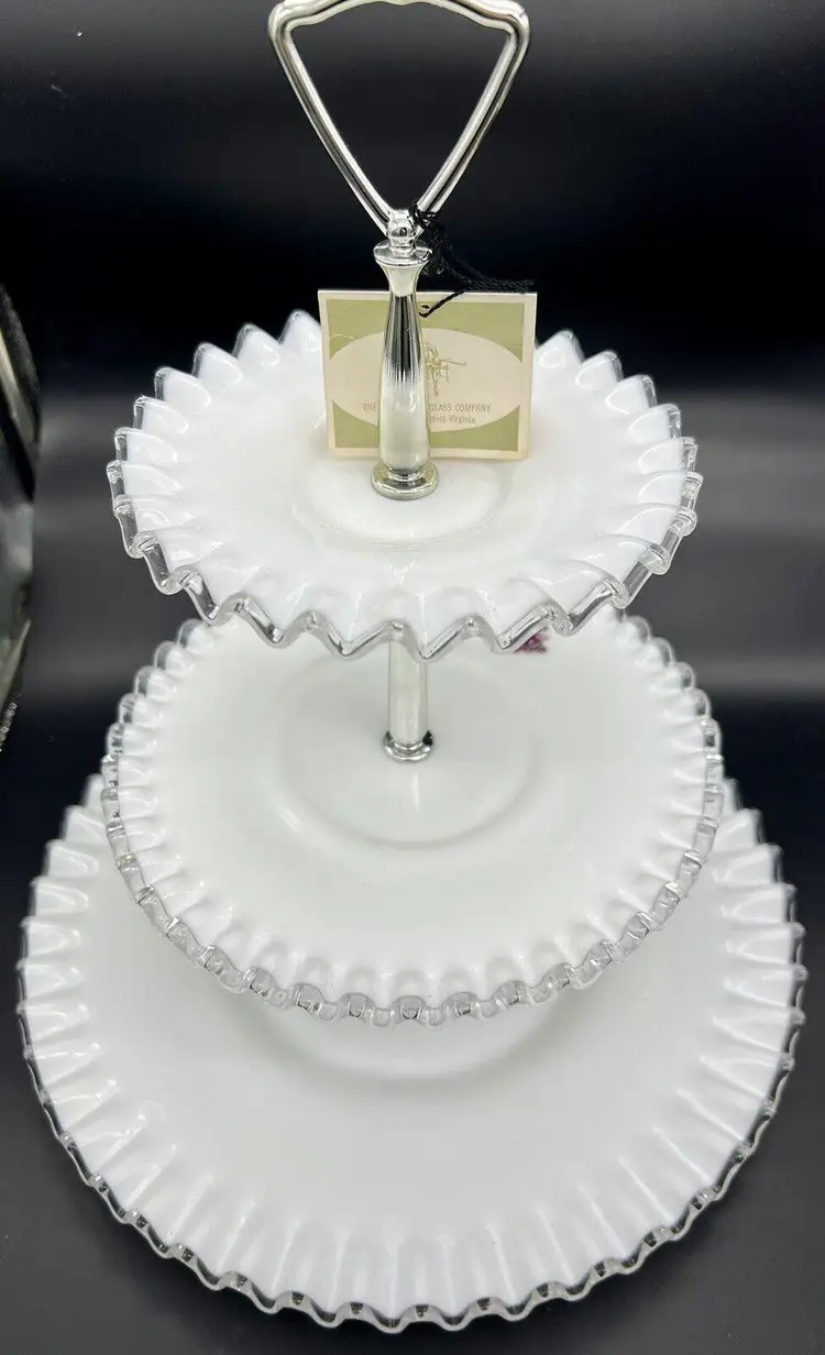 Vintage mid-century Fenton 3 tier tidbit serving tray White milk glass with clear Silvercrest ruffled edges Silvertone handle Approximately 14.5” The tiered plates are approximately: 12.5”, 8.5” and 6” in diameter. Includes original foil sticker and original paper hang tag. No chips or cracks. Bottom has some shelf wear.