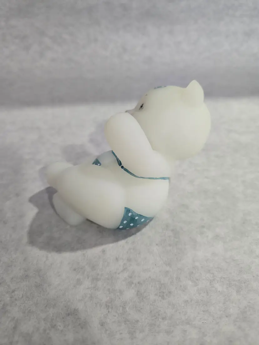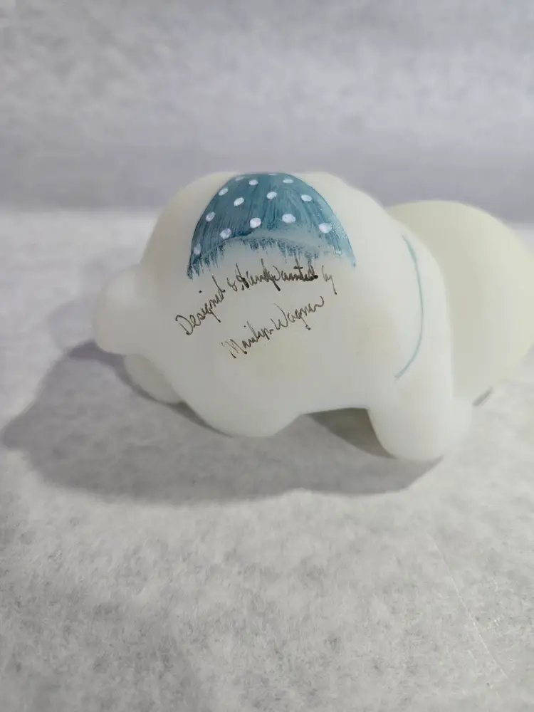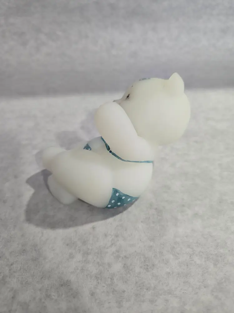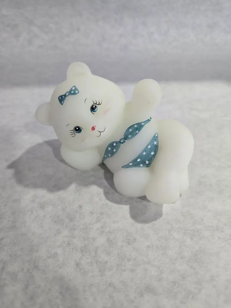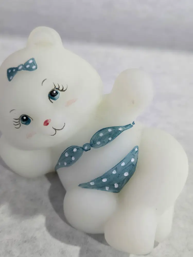 This adorable little bear from Fenton is in a reclining position. Hand painted by Marilyn Wagner, this bear is beach ready in a cute little blue polka dot bikini!