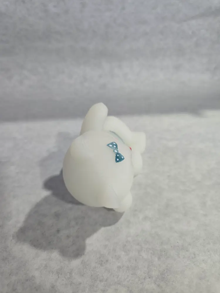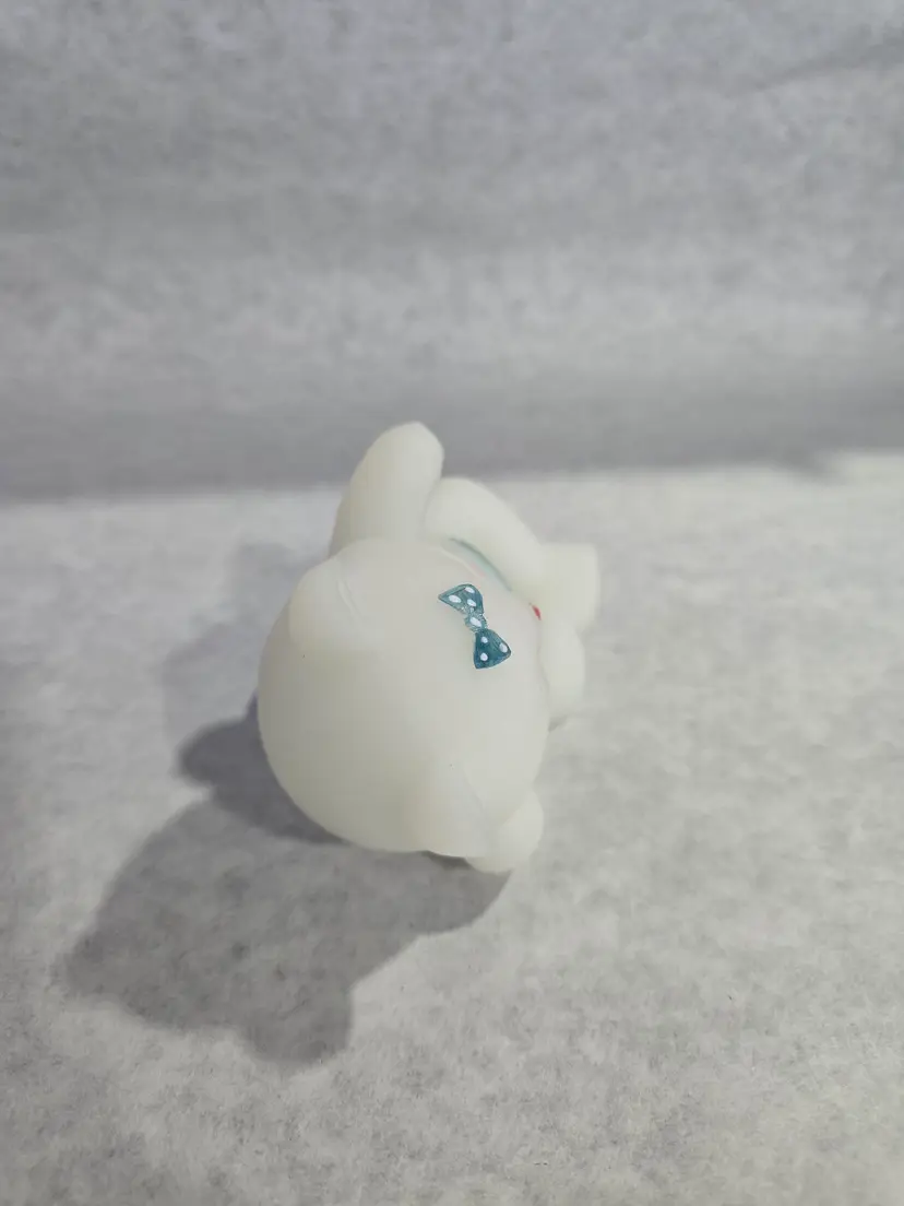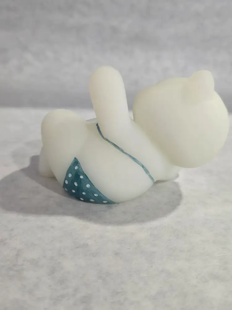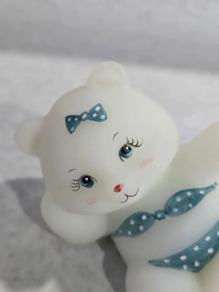 This adorable little bear from Fenton is in a reclining position. Hand painted by Marilyn Wagner, this bear is beach ready in a cute little blue polka dot bikini!
