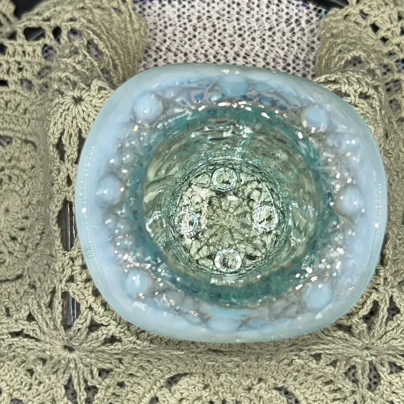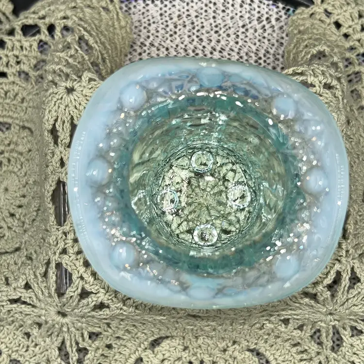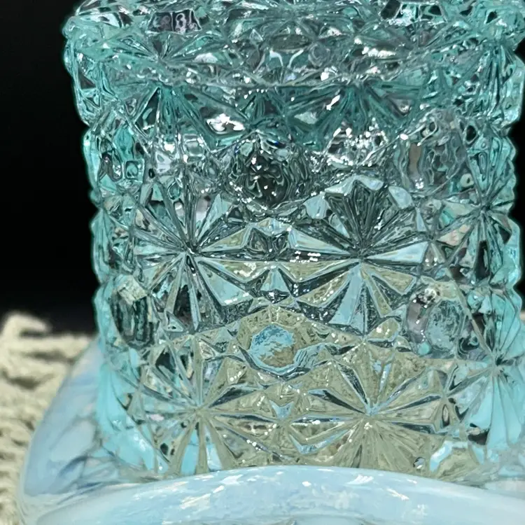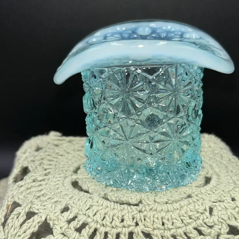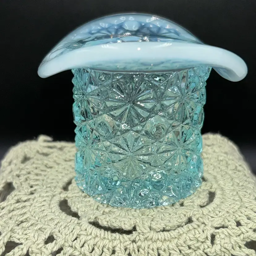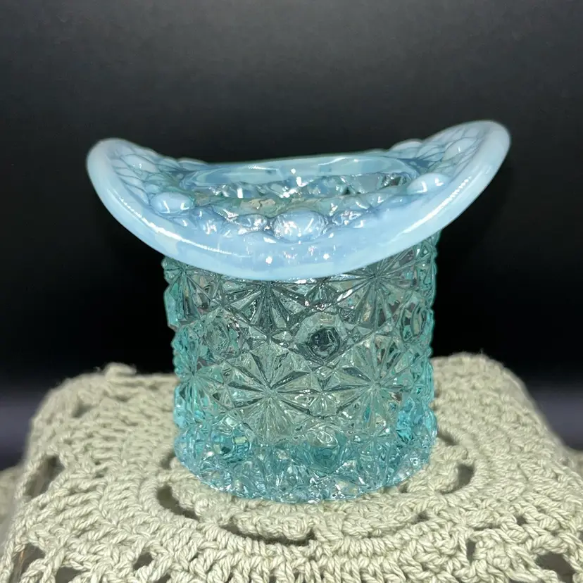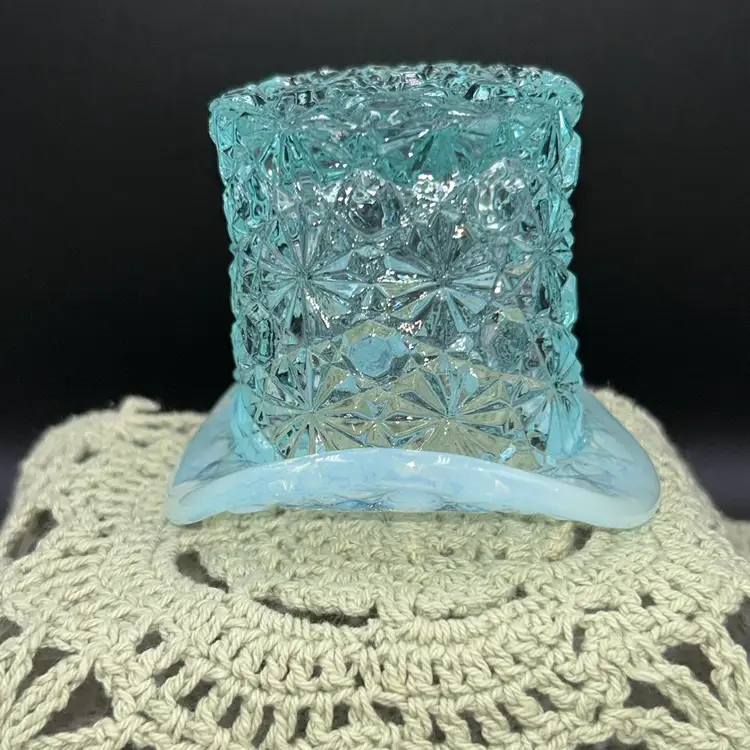 Pressed glass. 2.25” tall, 3” across widest part of hat, 1.75” diameter opening.