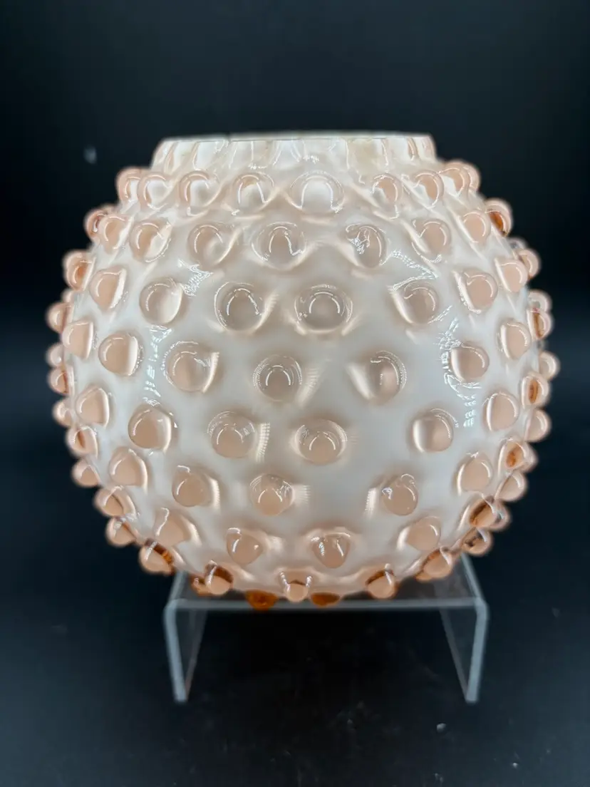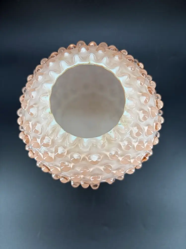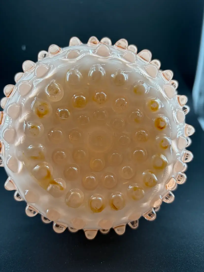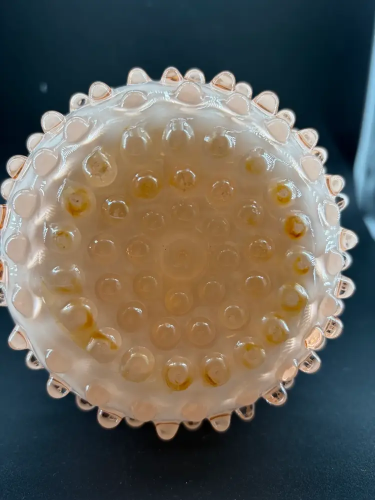 This is another beautiful vase made by the Fenton Glass Co. It is peach in color and in the hobnail pattern. There is small discoloration on the base that I could not remove. See pictures. Other than that there are no other condition issues. It stands about 5 inches tall and 5 inches wide.