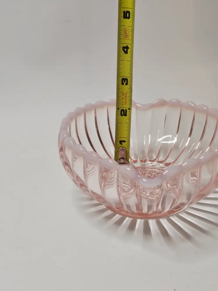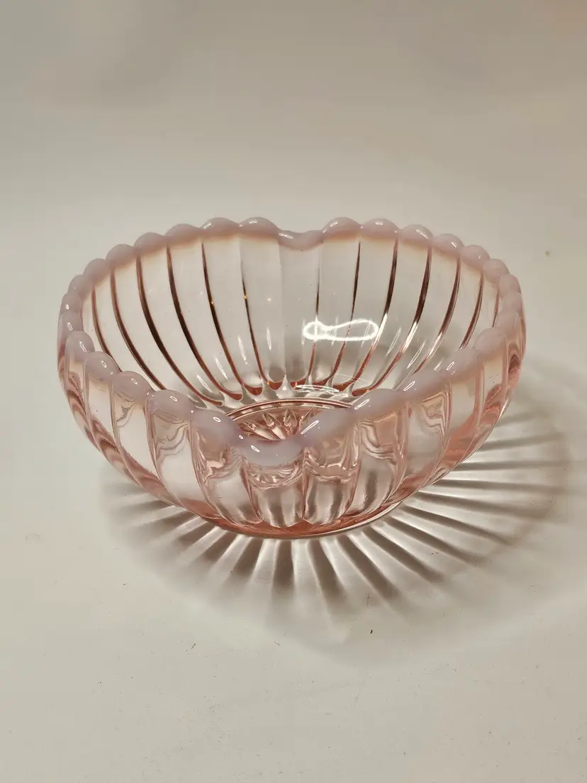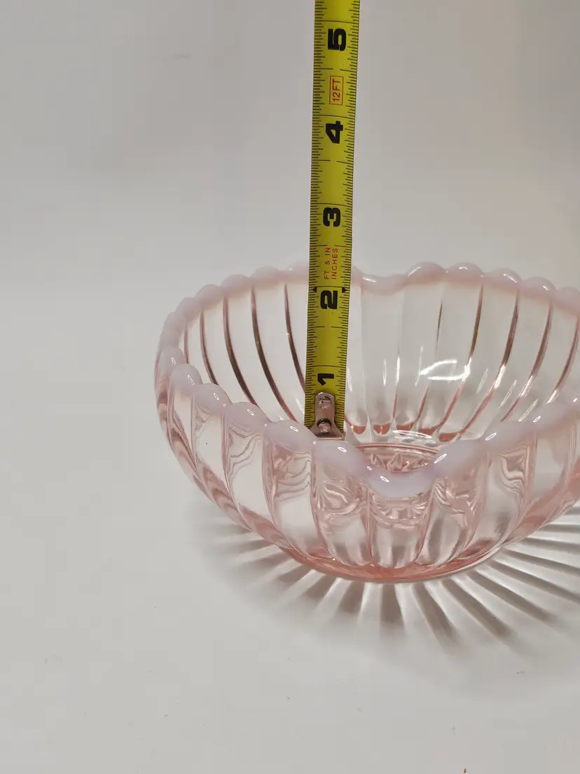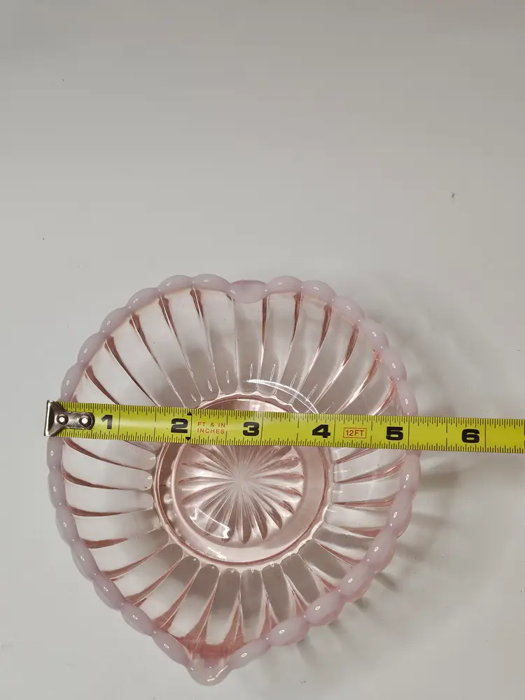 This Vintage Fenton Pink & White Opalescent Ribbed Heart Shaped Candy Dish Bowl is a beautiful and sentimental piece of North American art glass. With its decorative ribbed pattern and heart-shaped design, it is perfect for special occasions like Valentine's Day, Mother's Day, or anniversaries. Made of glass with a lovely pink color, this original Fenton piece exudes a theme of love and romance, making it a thoughtful gift for a loved one or a charming addition to any home decor.