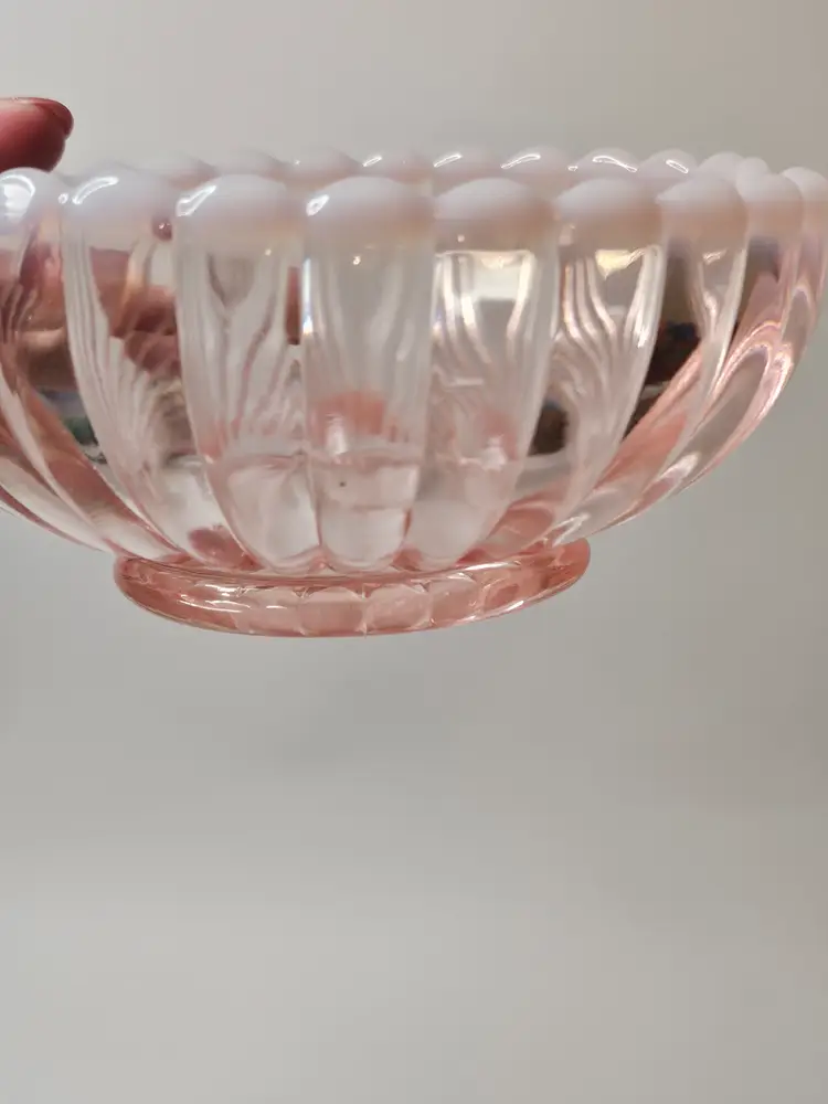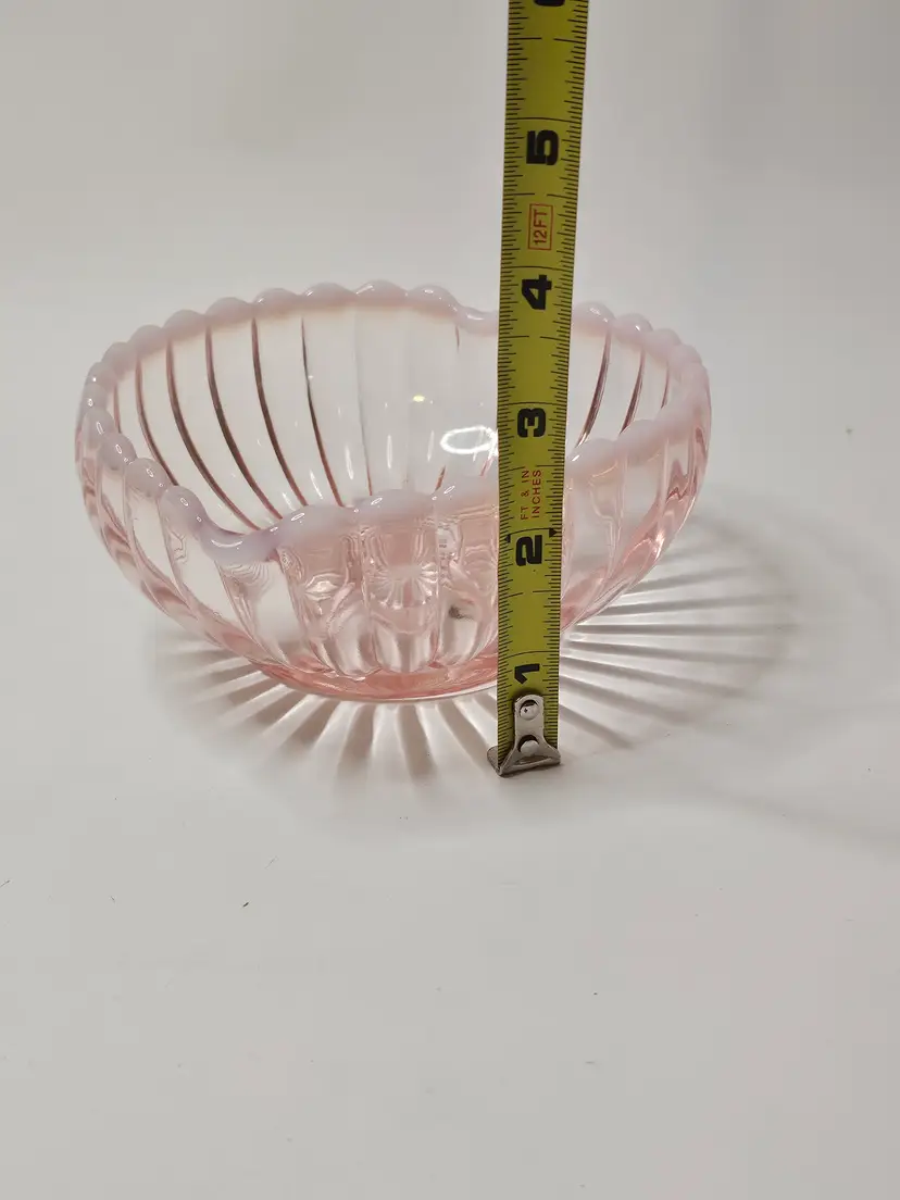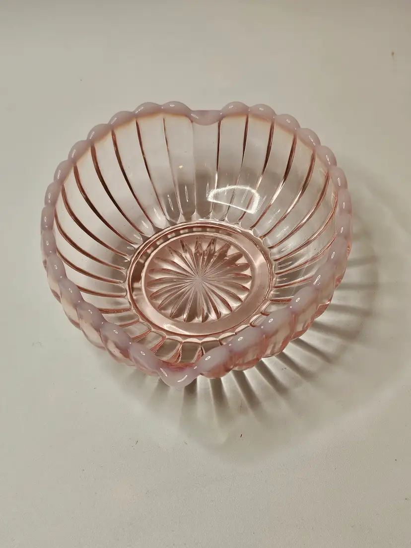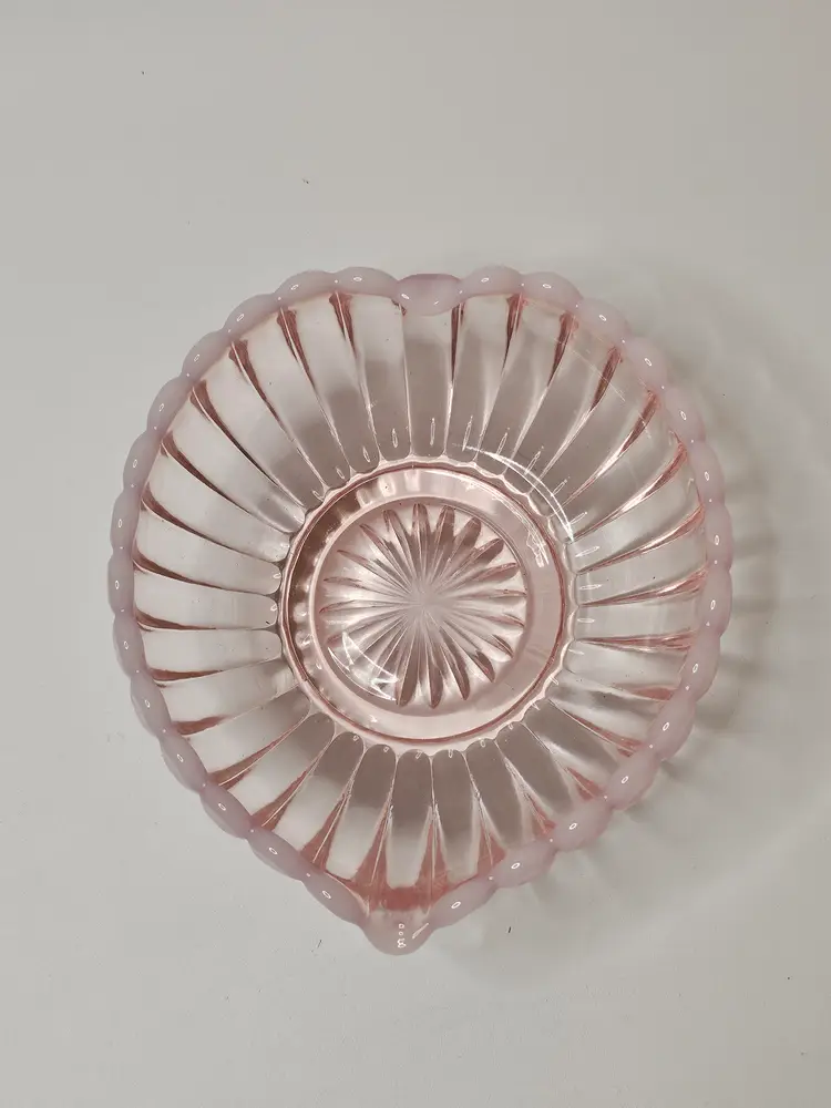 This Vintage Fenton Pink & White Opalescent Ribbed Heart Shaped Candy Dish Bowl is a beautiful and sentimental piece of North American art glass. With its decorative ribbed pattern and heart-shaped design, it is perfect for special occasions like Valentine's Day, Mother's Day, or anniversaries. Made of glass with a lovely pink color, this original Fenton piece exudes a theme of love and romance, making it a thoughtful gift for a loved one or a charming addition to any home decor.