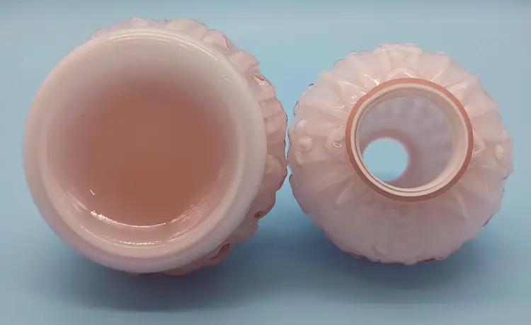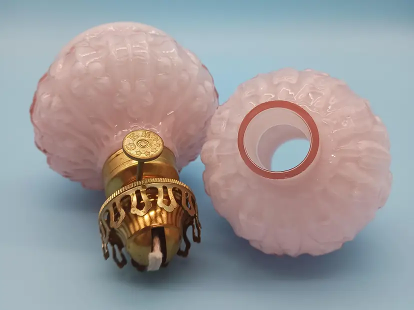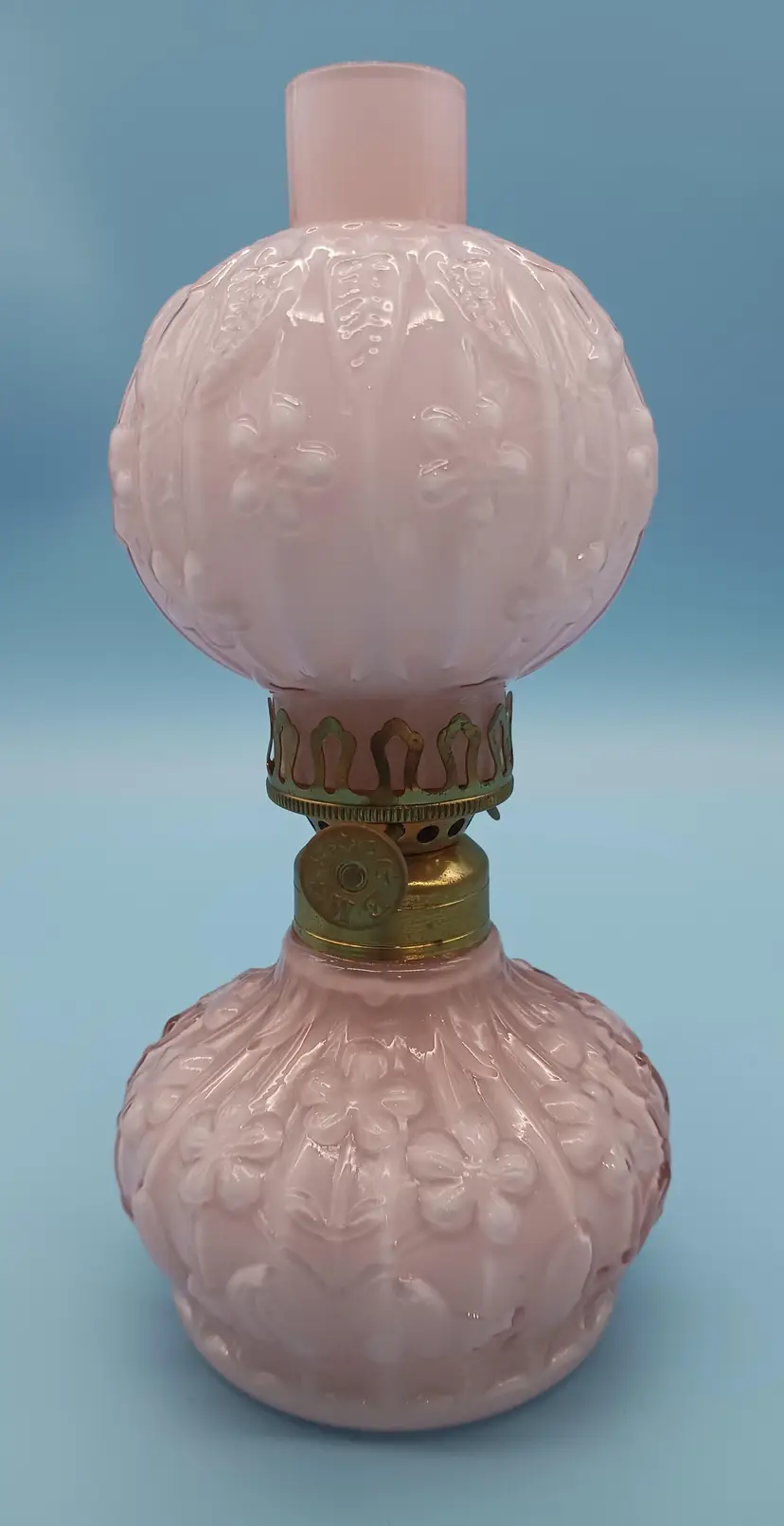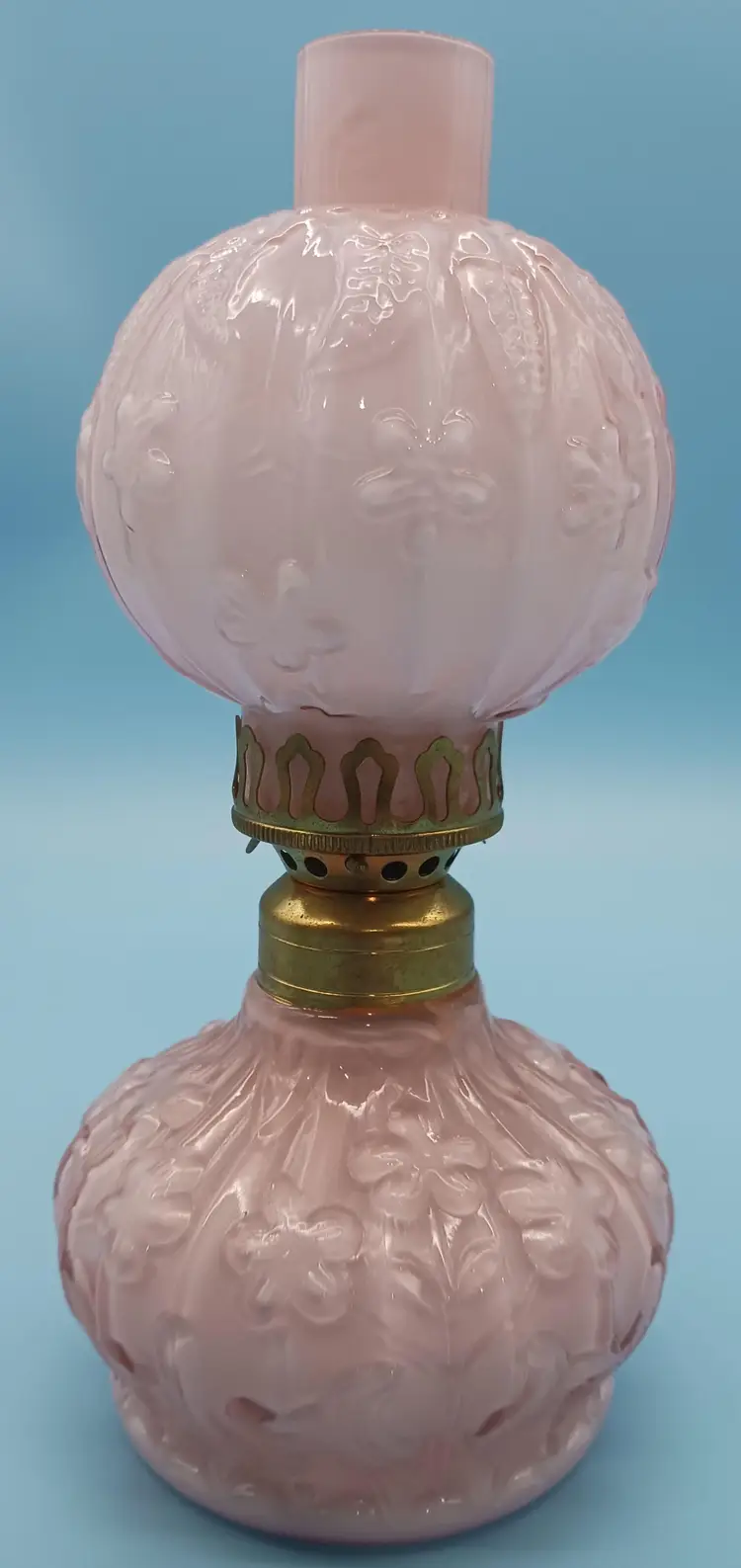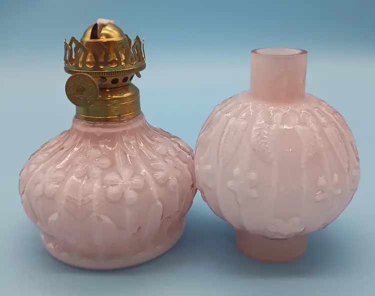Charming Fenton vintage oil lamp featuring a delicate pink embossed glass design is an extremely hard to find piece of Fenton art glass. This elegant piece adds a touch of nostalgia and warmth to any room. Perfect for collectors or as a unique decor item. Measures approximately 12 inches tall.
