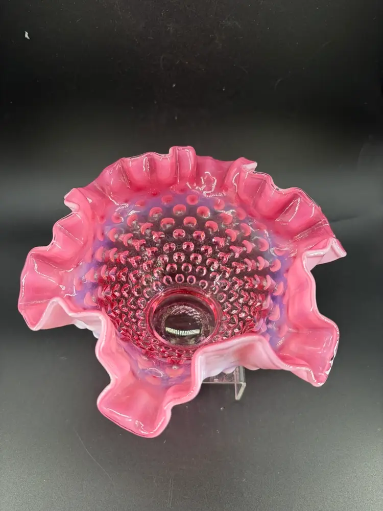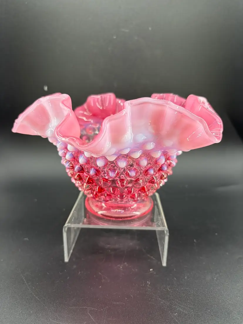 This vintage Fenton pink opalescent hobnail ruffled glass bowl is a beautifully handcrafted piece. Made by renowned brand Fenton, this round bowl features a hobnail pattern and a lustrous pink color and opalescent finish. There are no condition issues. It stands 4 inches tall and 6.5 inches wide.