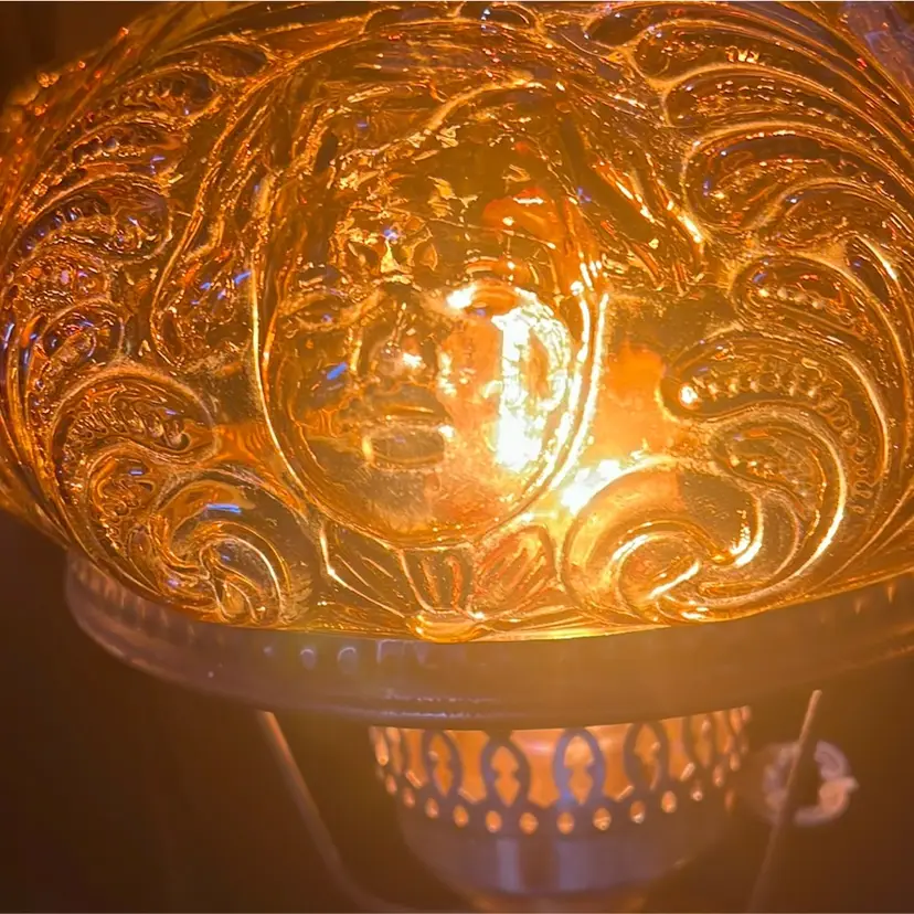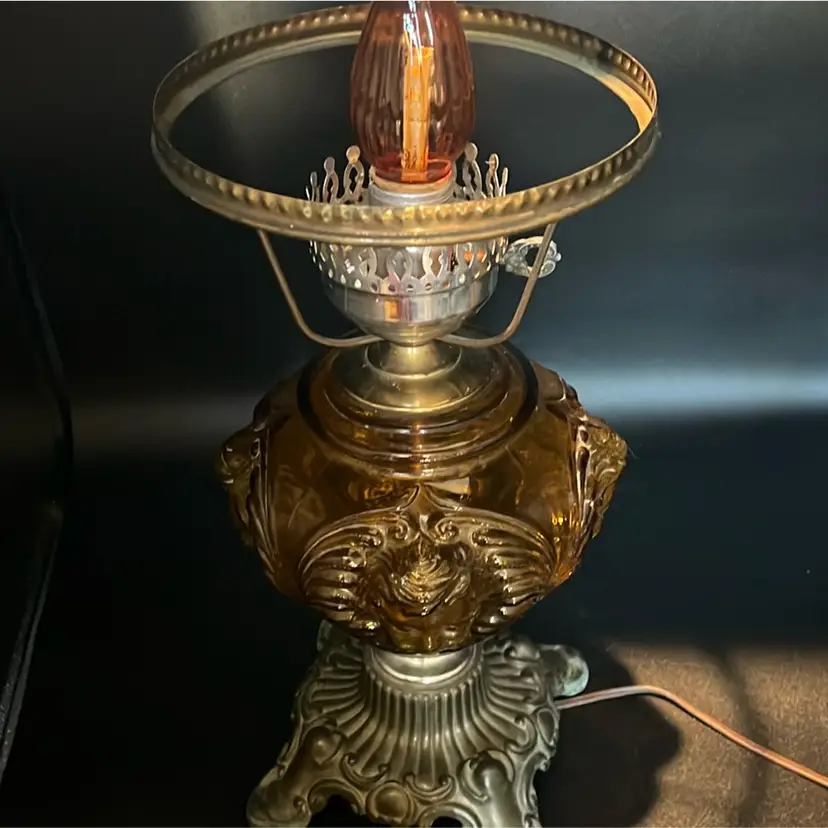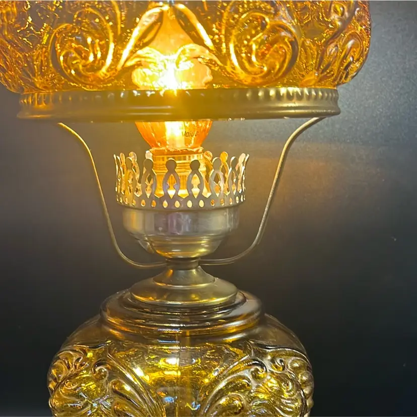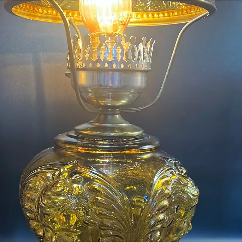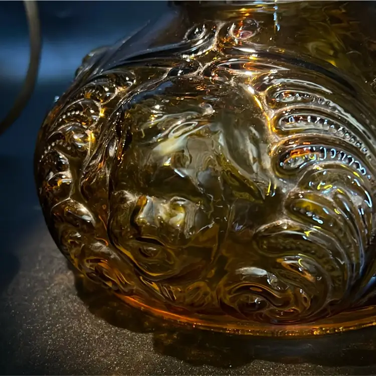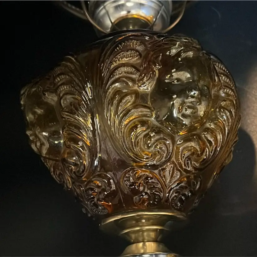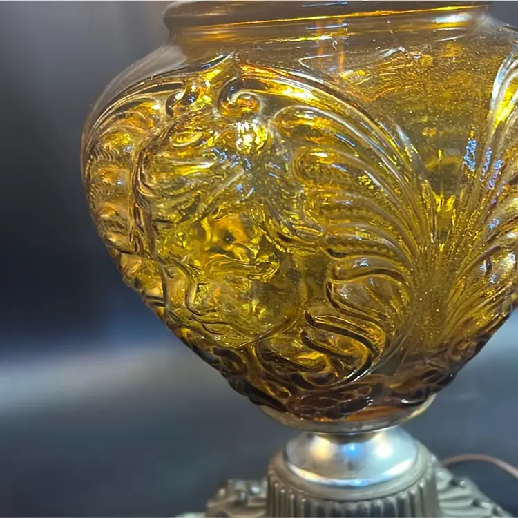 Beautiful Vintage Fenton Amber Butter Scotch Colored Lamp with Embossed Glass & Brass. Gorgues Putti Cherubs Faces on all side off the shade and bottom layer of lamp. Works perfectly. Other than the scratch, maybe manufacture marks but I don’t know…also, can’t feel those marks from the inside at all! (see pics & ask questions if need be), normal wear due to age which adds charm. EVERYTHING NEEDS TO BE TIGHTENED UP AND A GOOD CLEAN (lightbulb not included) 20'' height 9'' diameter weight 5 lbs before shipping