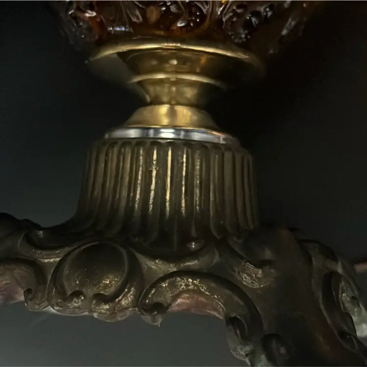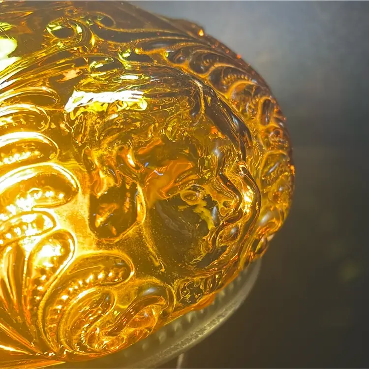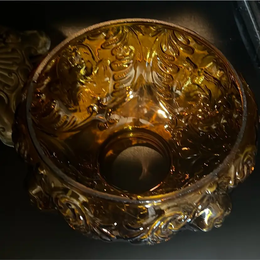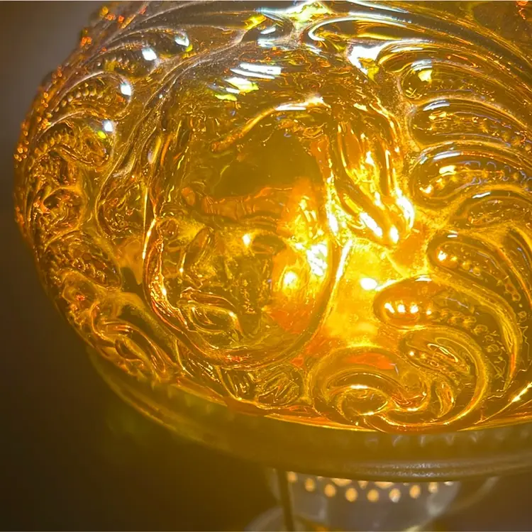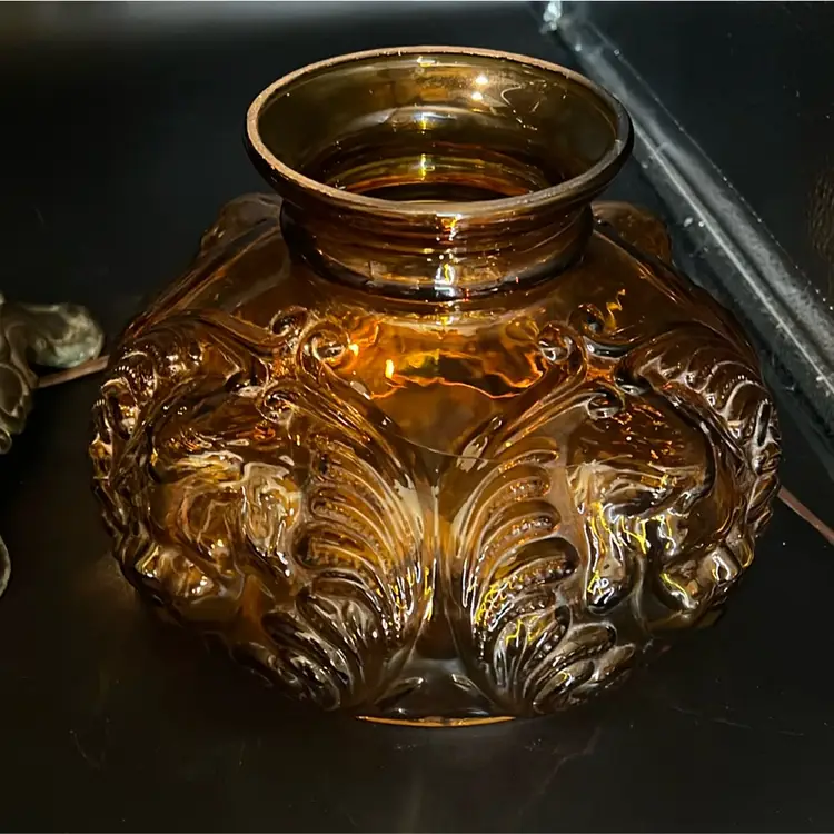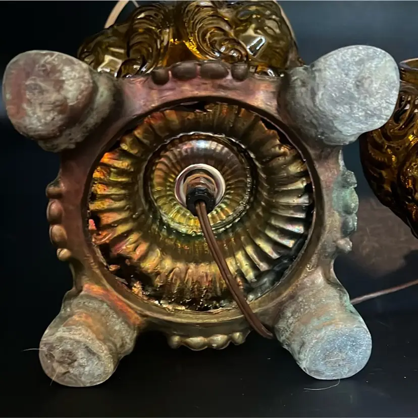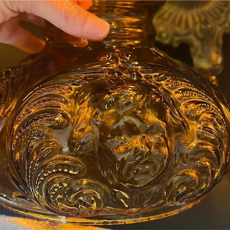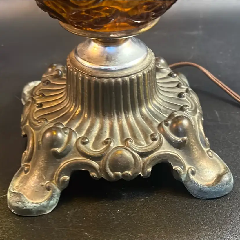 Beautiful Vintage Fenton Amber Butter Scotch Colored Lamp with Embossed Glass & Brass. Gorgues Putti Cherubs Faces on all side off the shade and bottom layer of lamp. Works perfectly. Other than the scratch, maybe manufacture marks but I don’t know…also, can’t feel those marks from the inside at all! (see pics & ask questions if need be), normal wear due to age which adds charm. EVERYTHING NEEDS TO BE TIGHTENED UP AND A GOOD CLEAN (lightbulb not included) 20'' height 9'' diameter weight 5 lbs before shipping