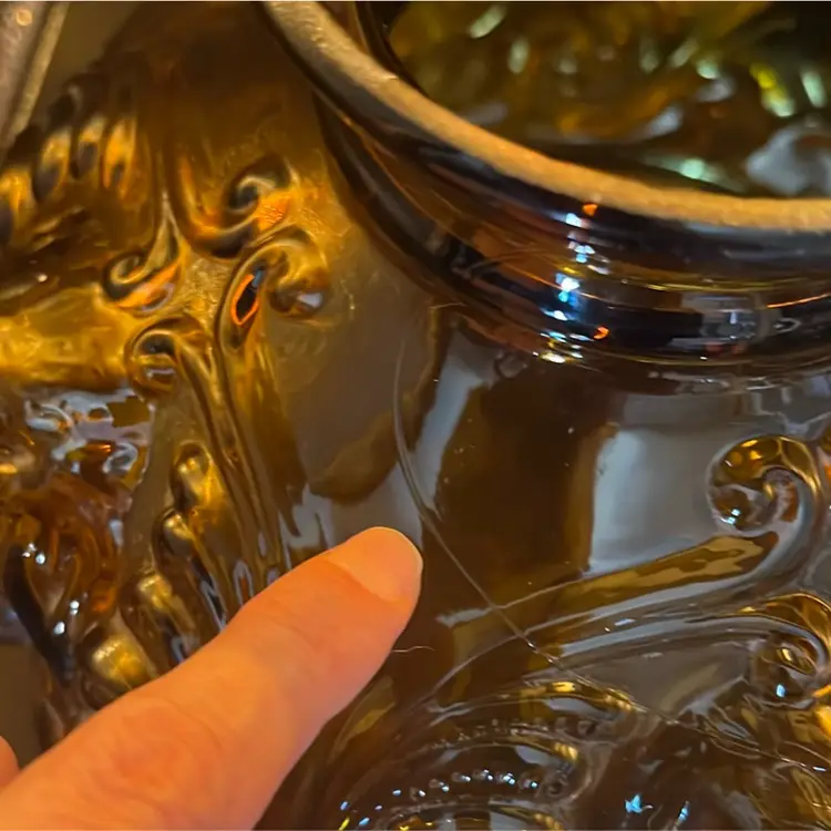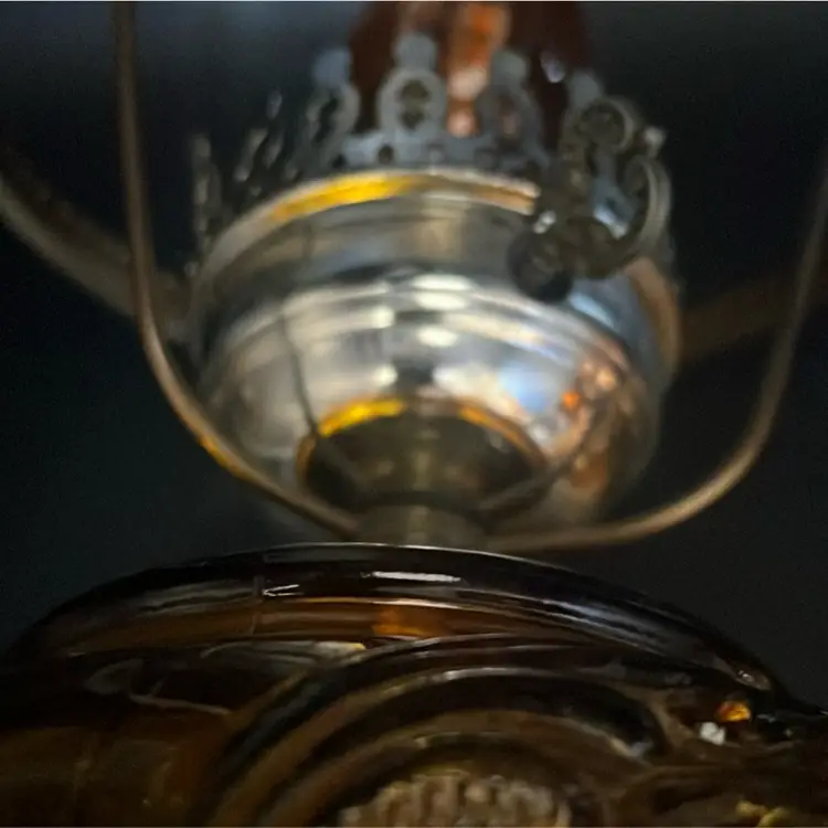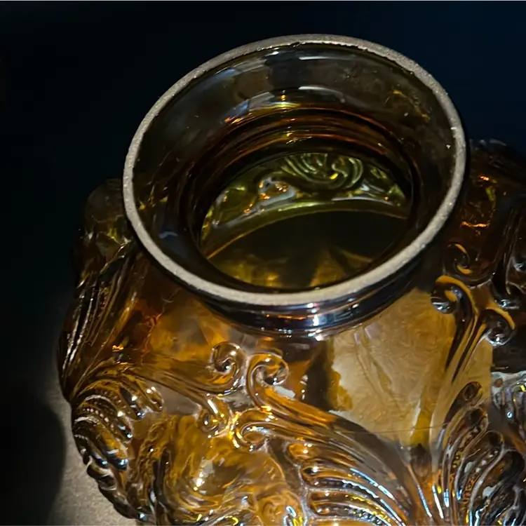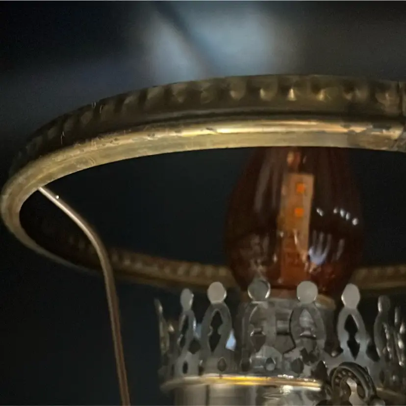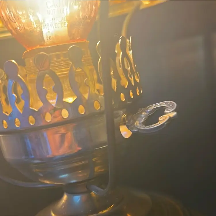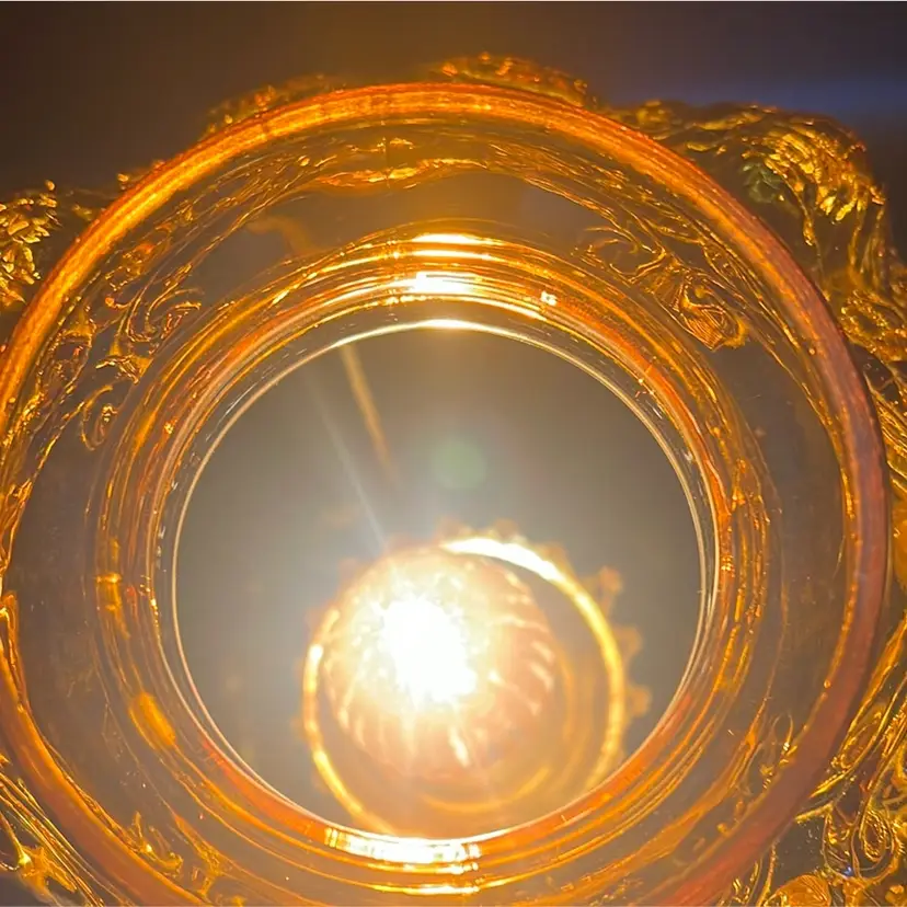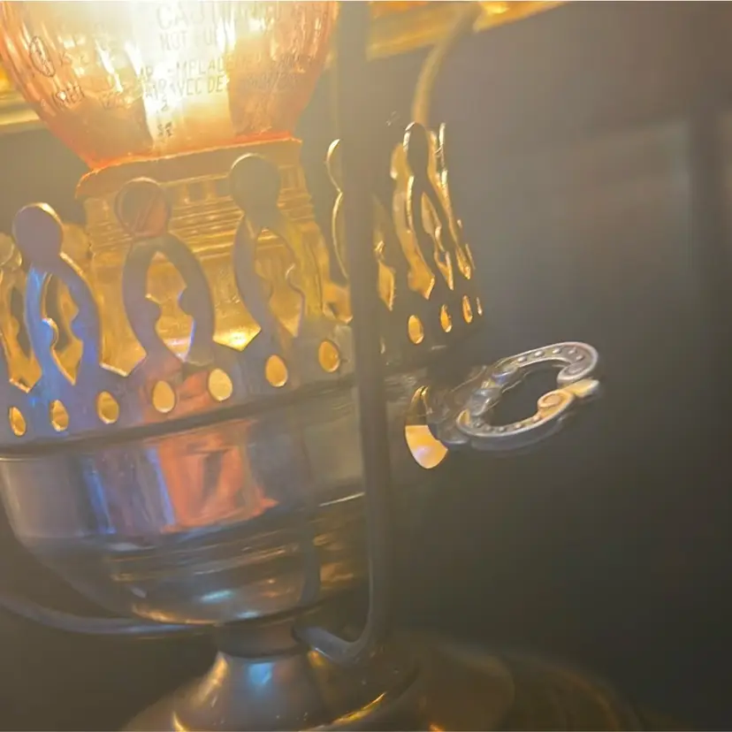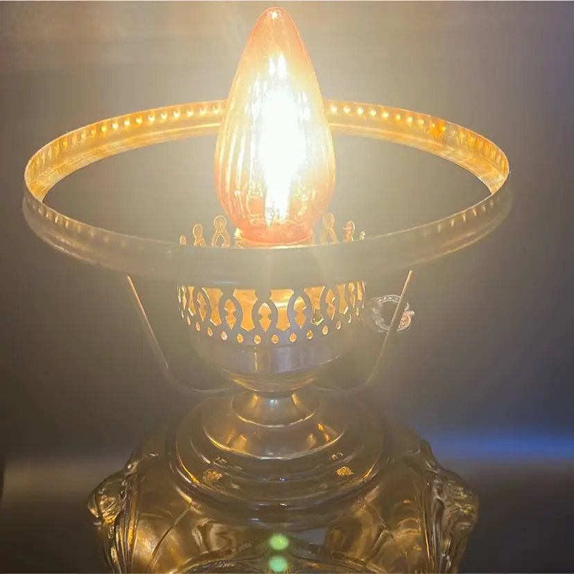 Beautiful Vintage Fenton Amber Butter Scotch Colored Lamp with Embossed Glass & Brass. Gorgues Putti Cherubs Faces on all side off the shade and bottom layer of lamp. Works perfectly. Other than the scratch, maybe manufacture marks but I don’t know…also, can’t feel those marks from the inside at all! (see pics & ask questions if need be), normal wear due to age which adds charm. EVERYTHING NEEDS TO BE TIGHTENED UP AND A GOOD CLEAN (lightbulb not included) 20'' height 9'' diameter weight 5 lbs before shipping