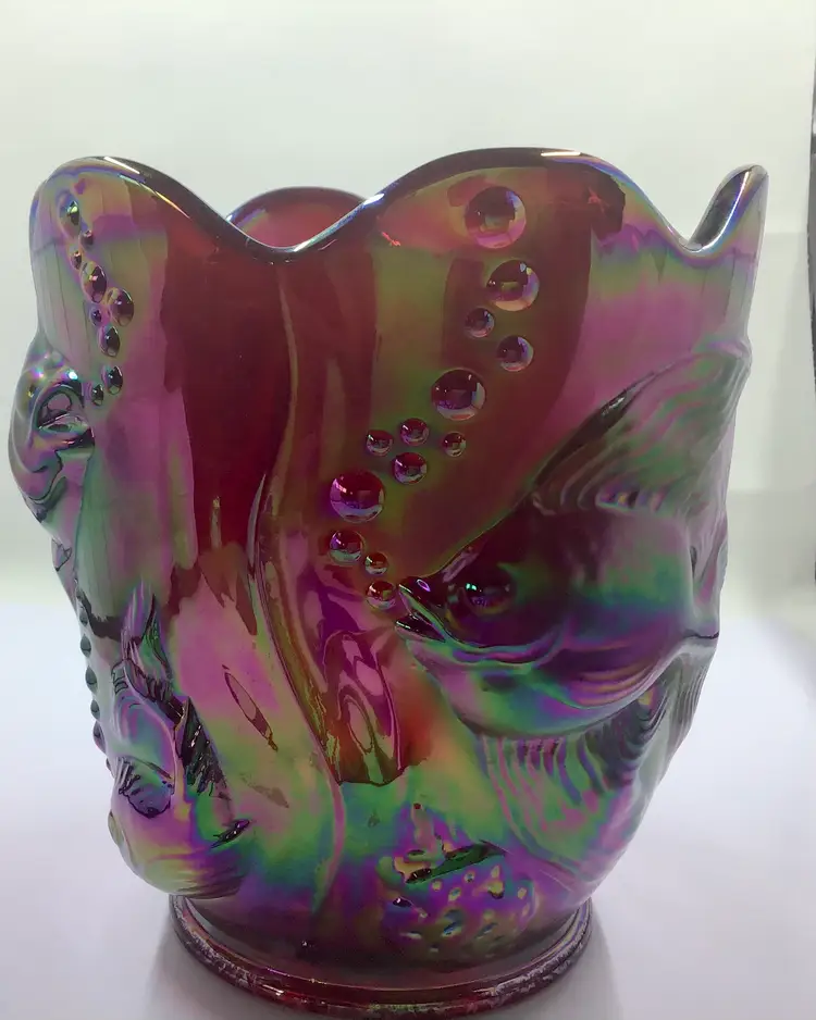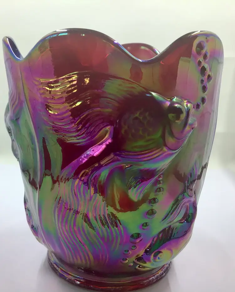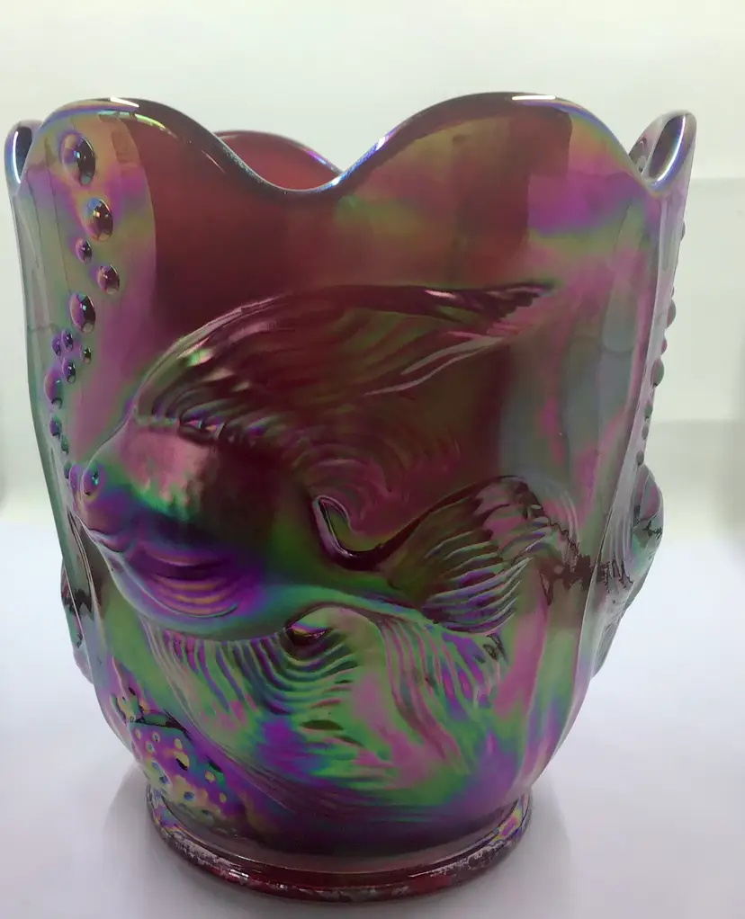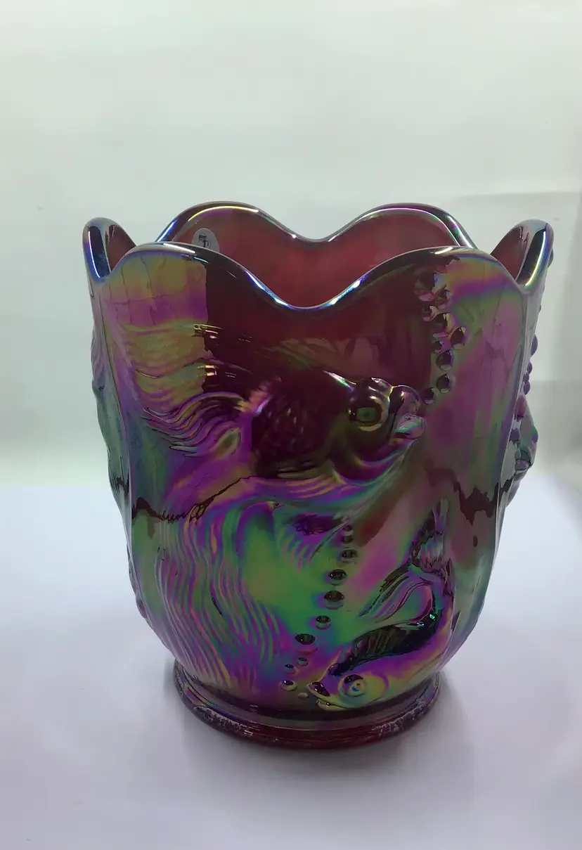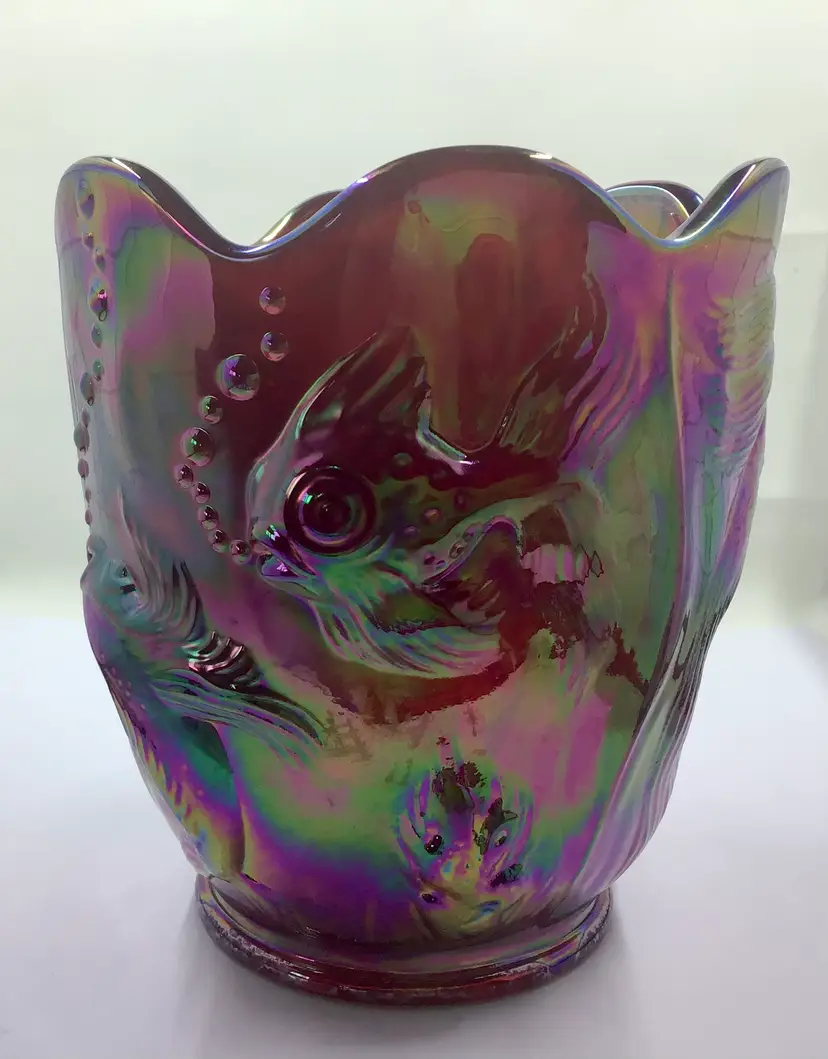 This stunning vintage carnival glass vase features an iridescent finish with intricate fish designs. A unique piece for collectors, it adds a splash of color and charm to any decor.