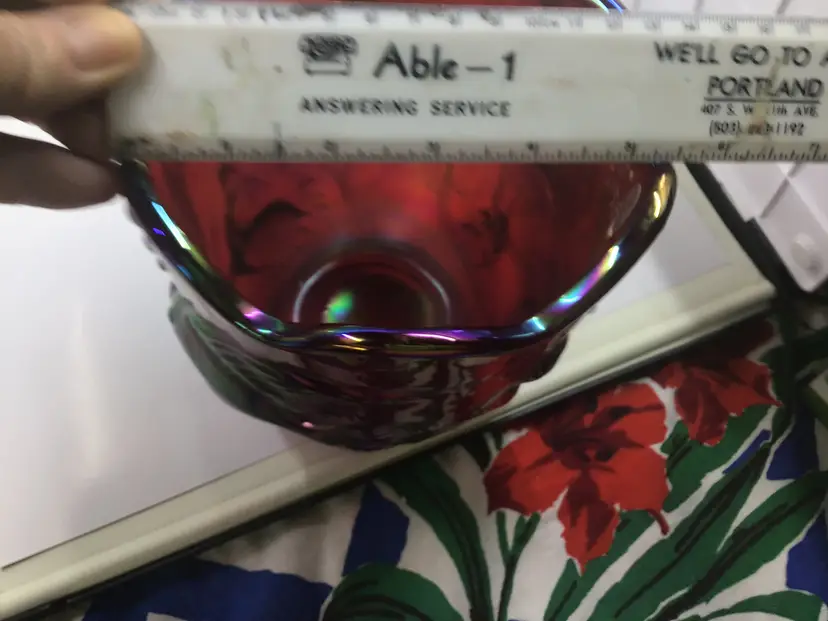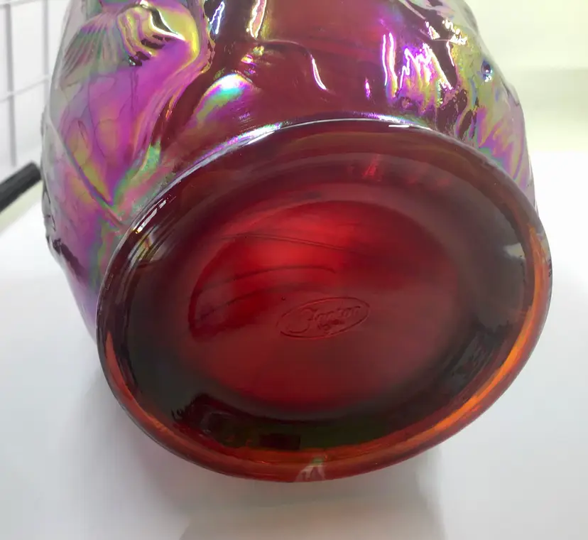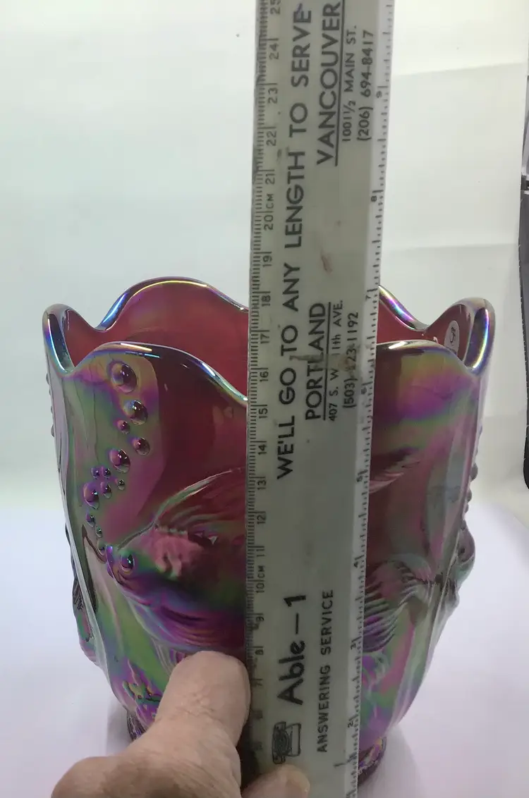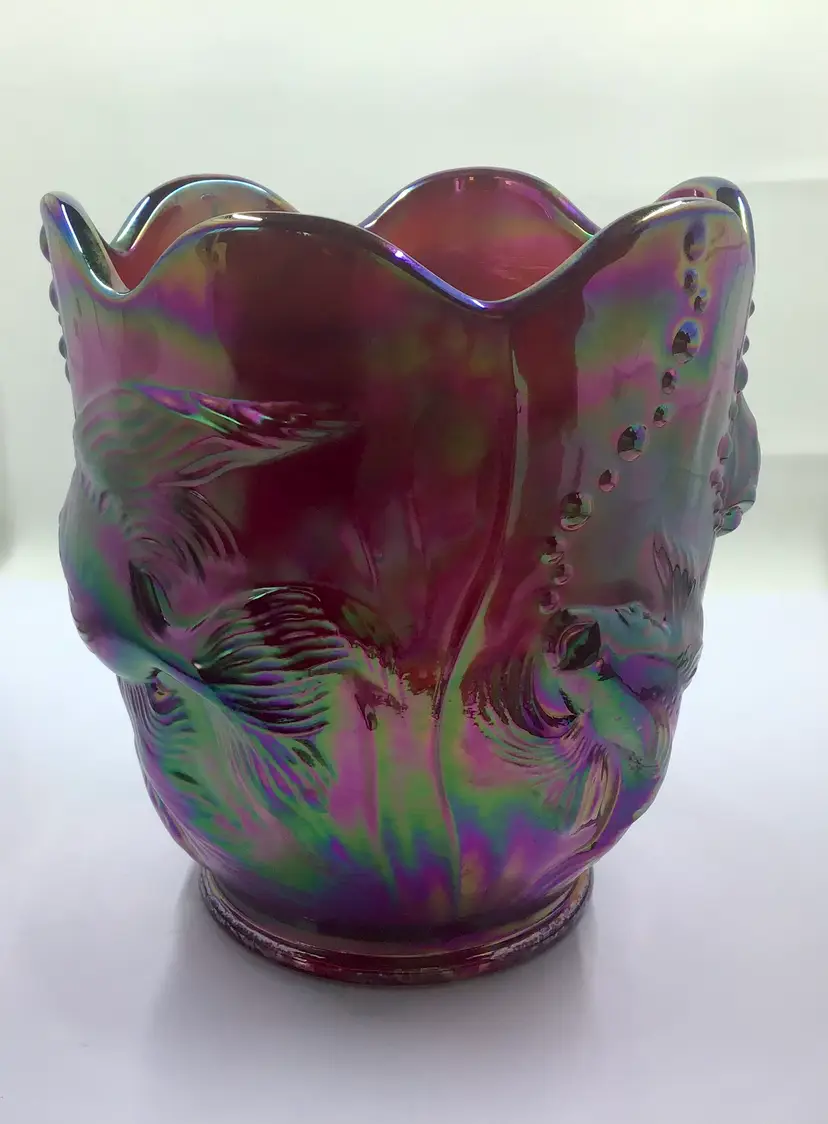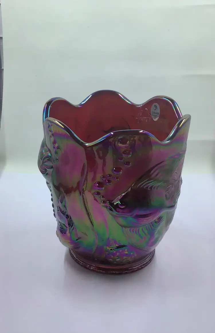 This stunning vintage carnival glass vase features an iridescent finish with intricate fish designs. A unique piece for collectors, it adds a splash of color and charm to any decor.