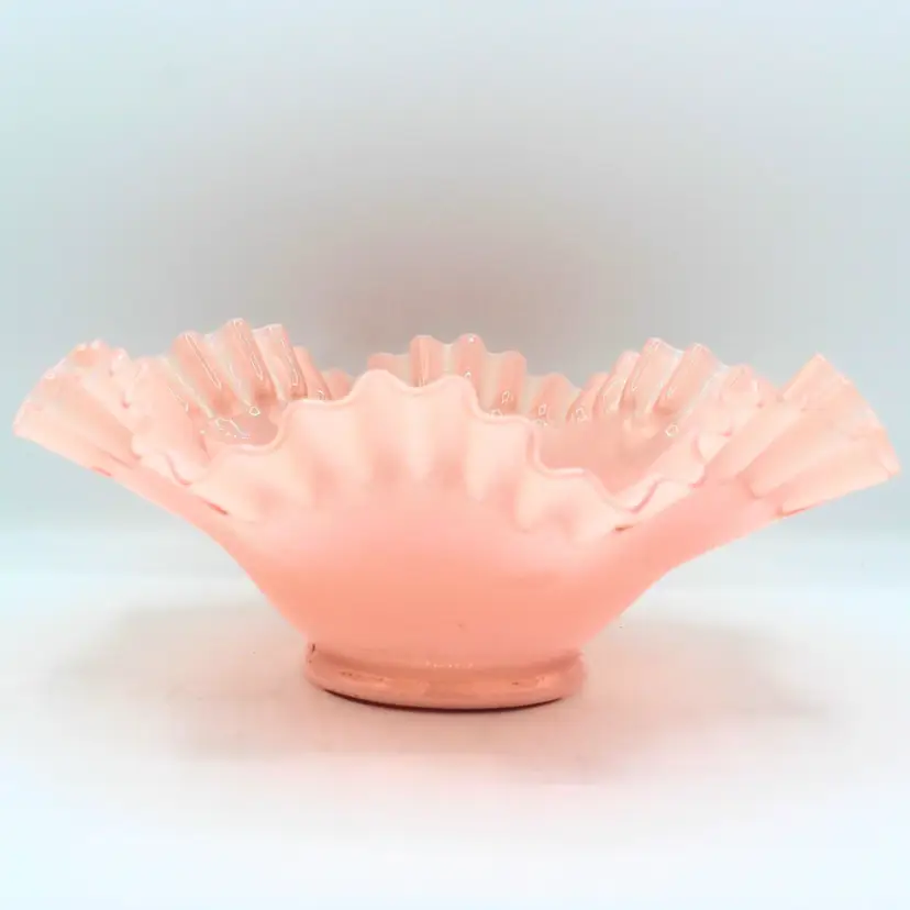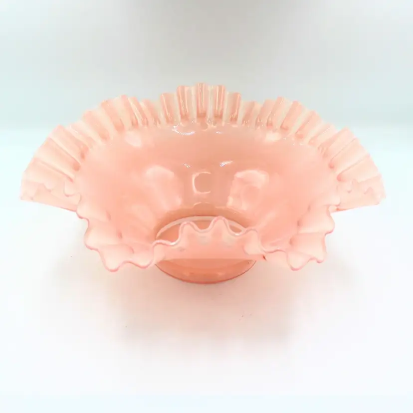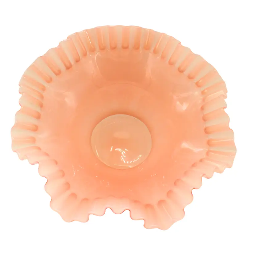 Pink Fenton pedestal bowl Beautiful rose pink pastel glass with ruffled ribbon edge Mid-century design, c. 1950s–1960s Perfect as a serving bowl, centerpiece, or collector’s display