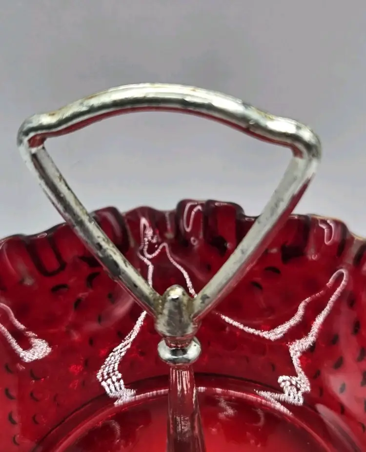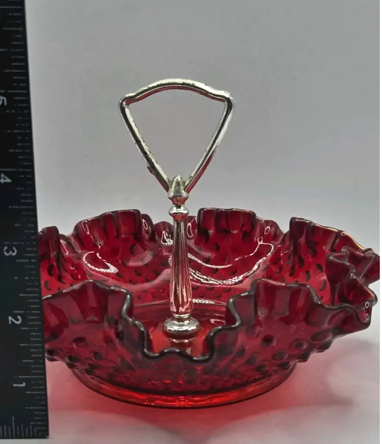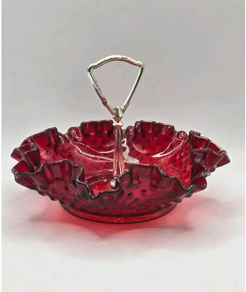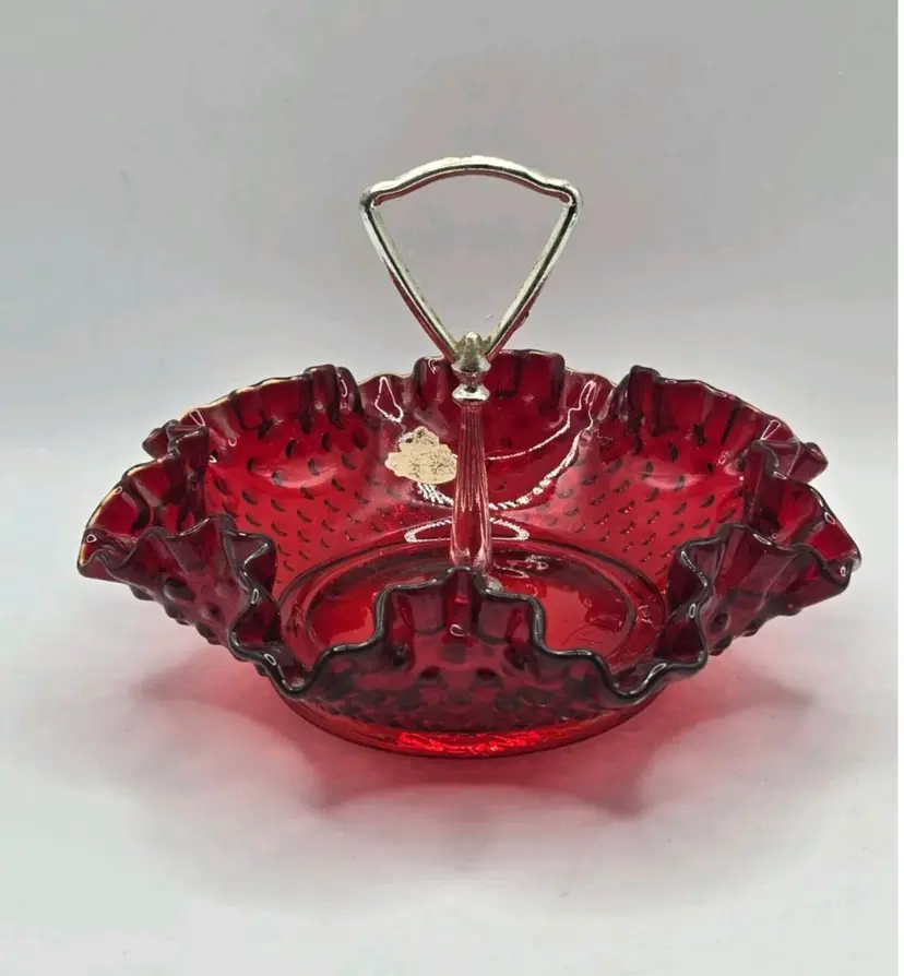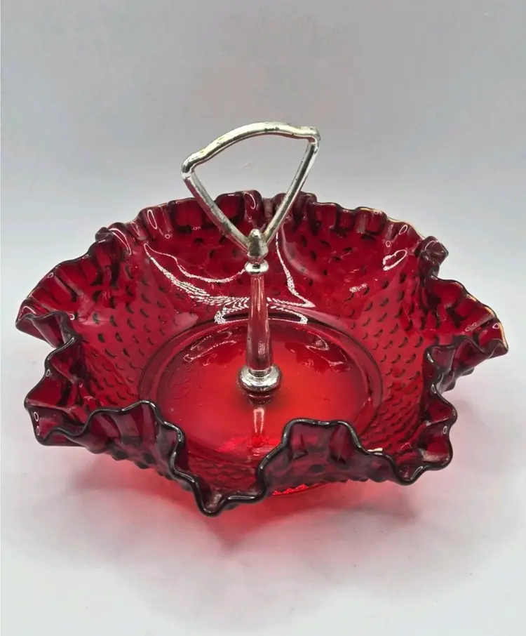 Vintage Fenton Ruby Red/Amberina Hobnail Center Handle Candy Dish • Ruffled Rim Lovely deep red with an amber yellow base, in the hobnail pattern, bearing a pretty ruffled rim. Approximately 7.25" Diameter X 2"H • 5" to handle Very good condition. No chips, cracks, or breaks. Minimal surface wear is possible due to age and handling.