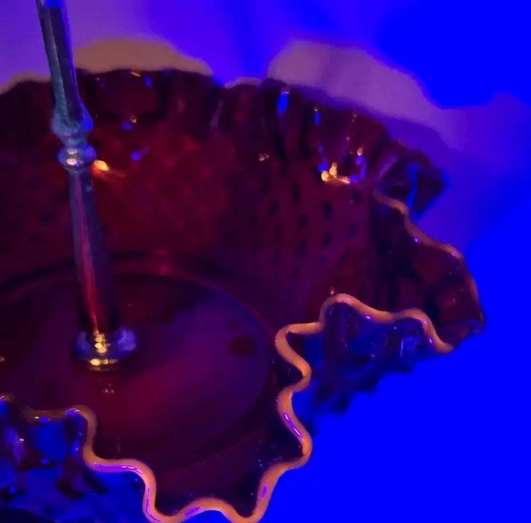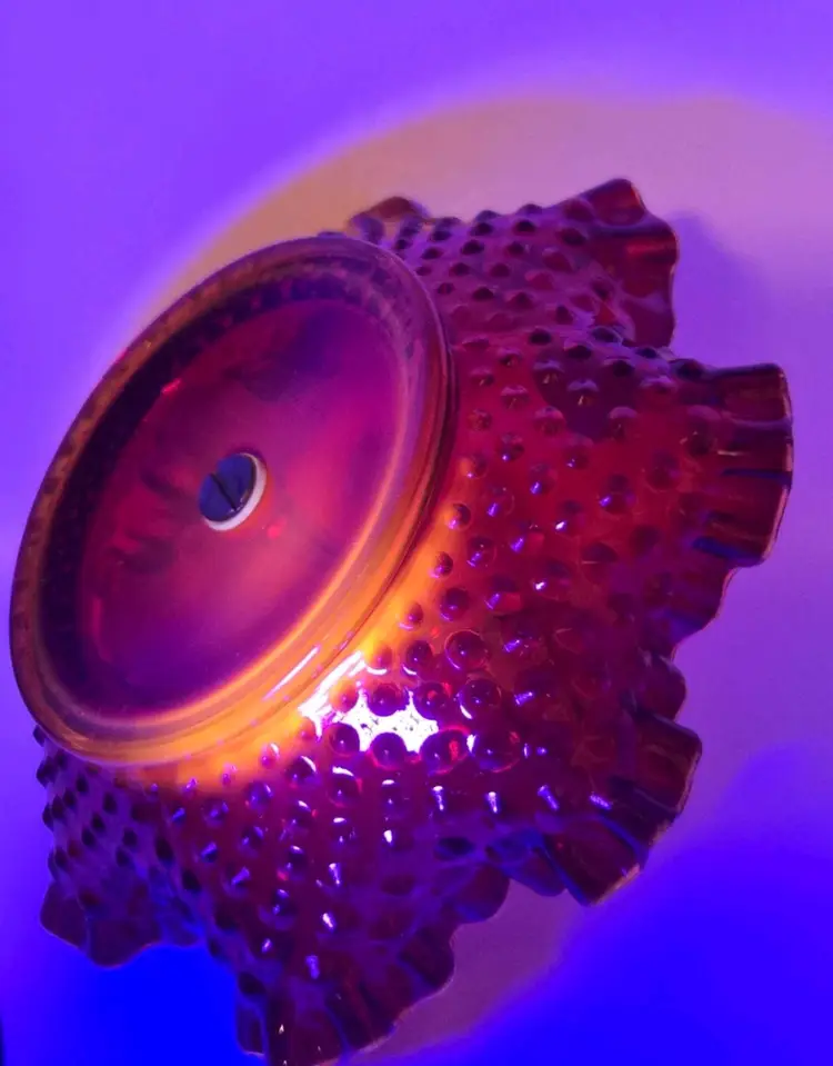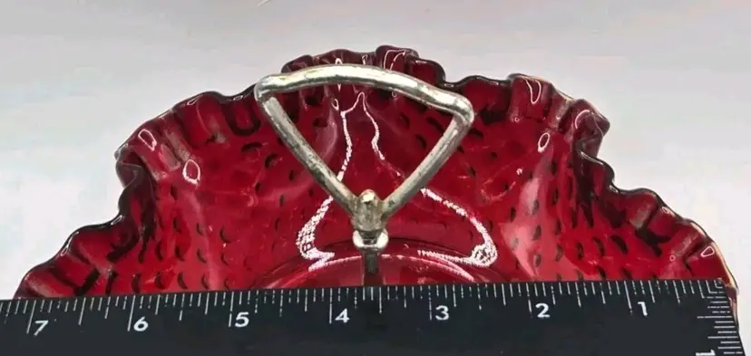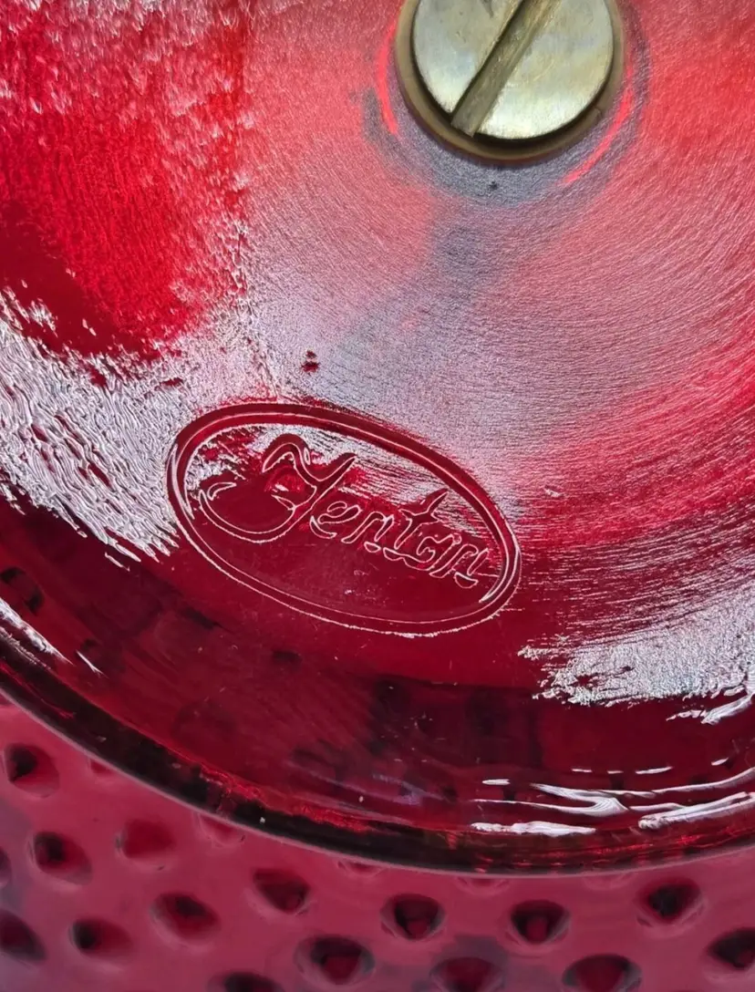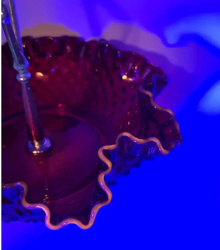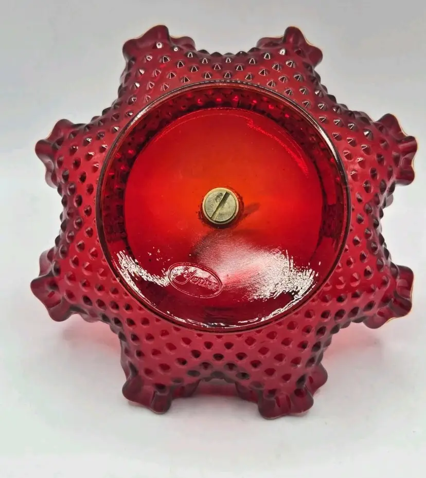Vintage Fenton Ruby Red/Amberina Hobnail Center Handle Candy Dish • Ruffled Rim Lovely deep red with an amber yellow base, in the hobnail pattern, bearing a pretty ruffled rim. Approximately 7.25" Diameter X 2"H • 5" to handle Very good condition. No chips, cracks, or breaks. Minimal surface wear is possible due to age and handling.