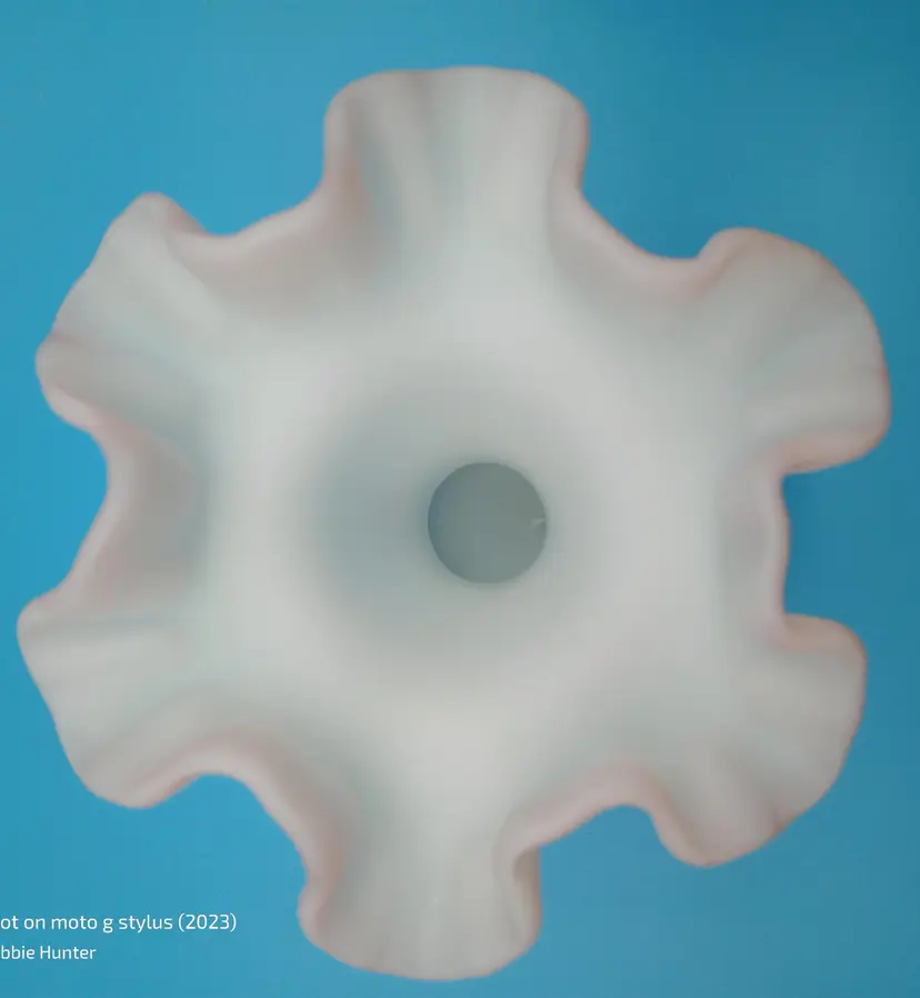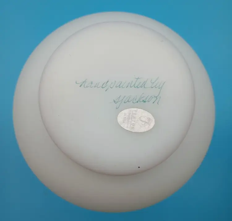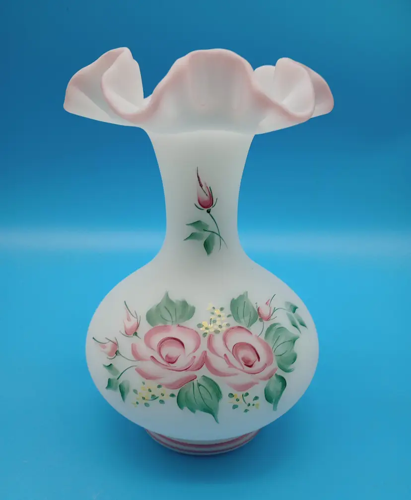 Charming vintage Fenton vase featuring a delicate pink ruffled rim and a beautiful hand-painted rose design. This elegant piece adds a touch of classic beauty to any decor. Measures approximately 8 inches tall.
