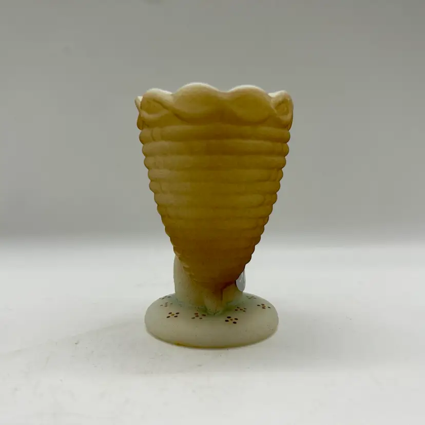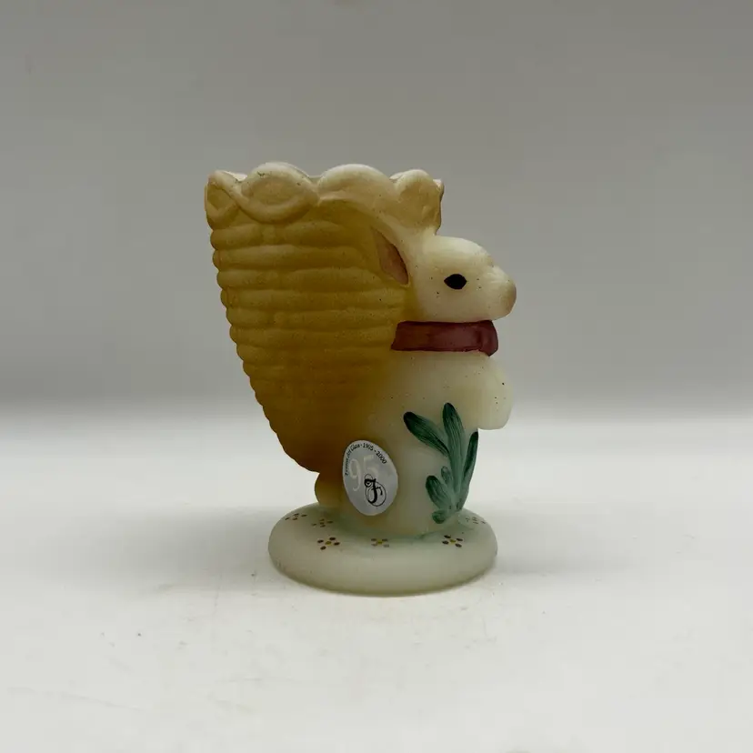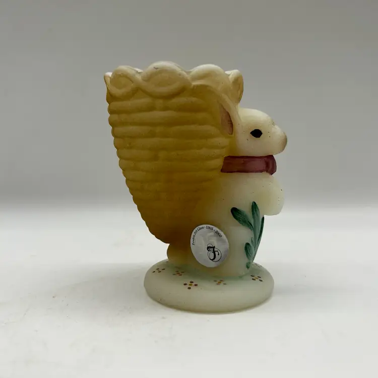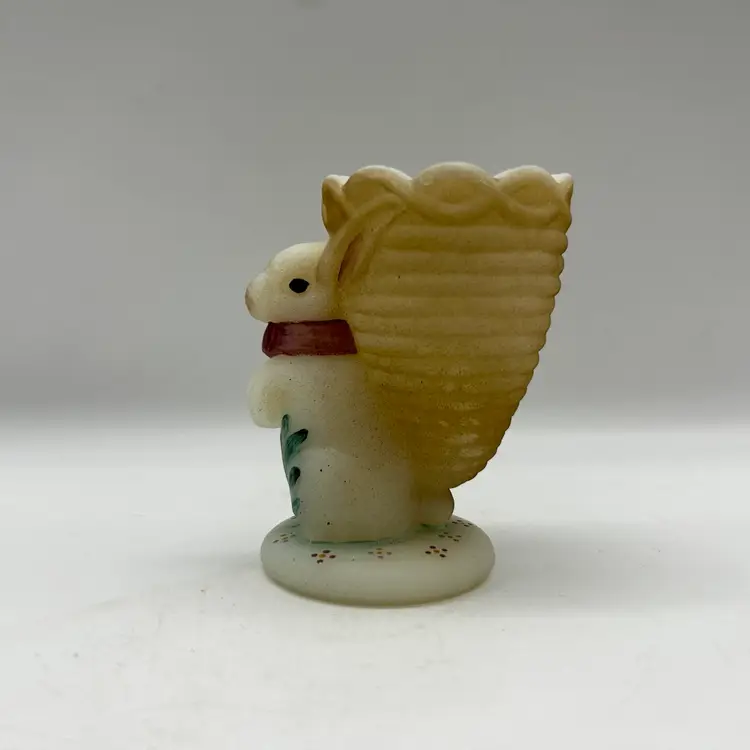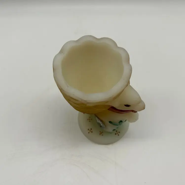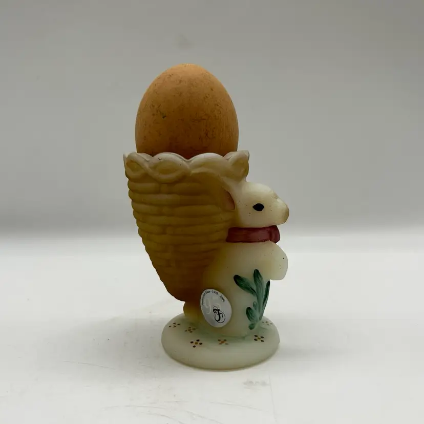 Adorable Fenton satin milk glass egg cup features an adorable bunny design that is hand-painted and signed by D. Bruun.