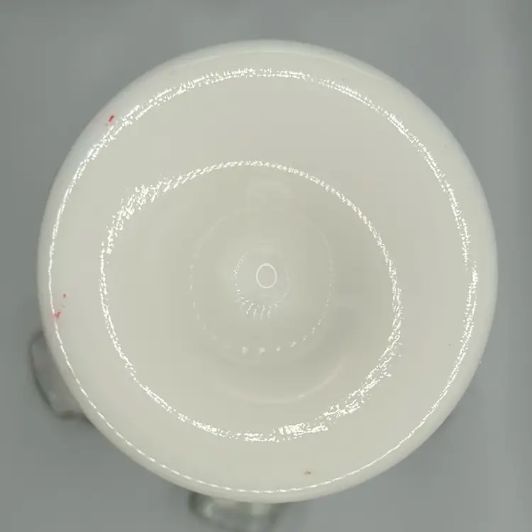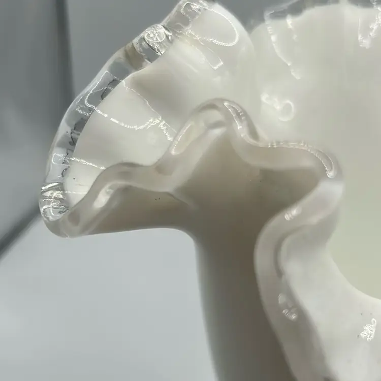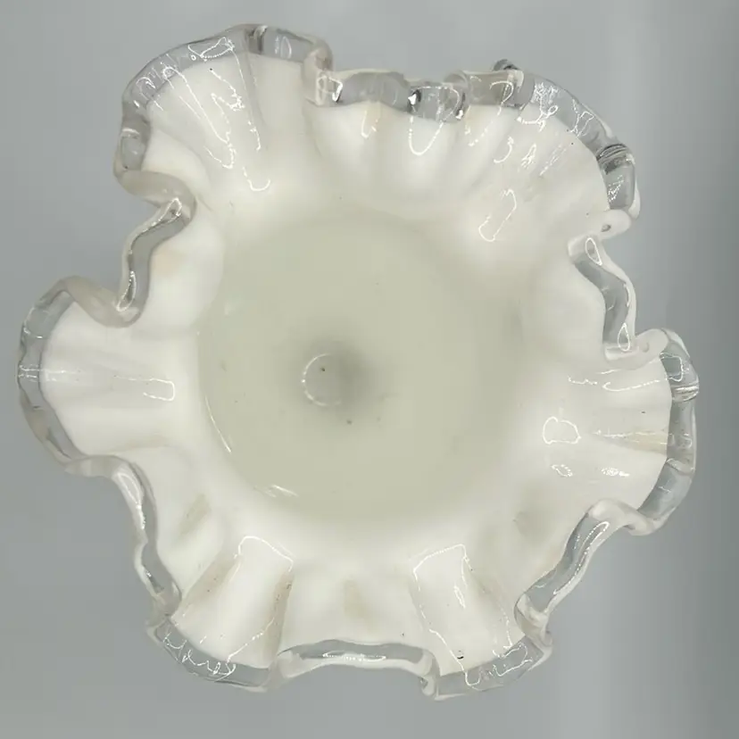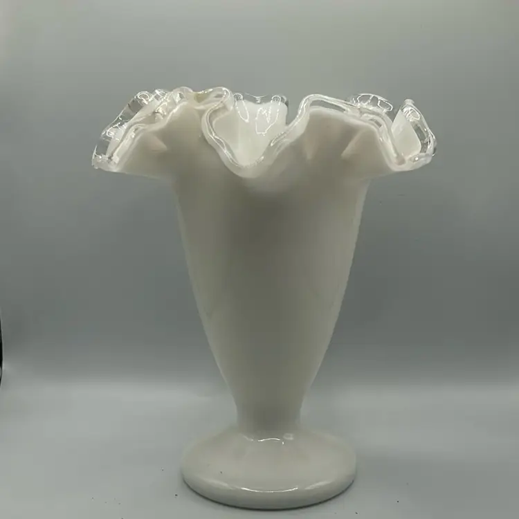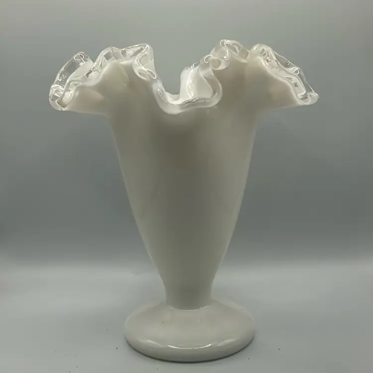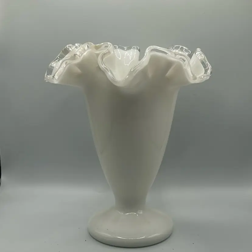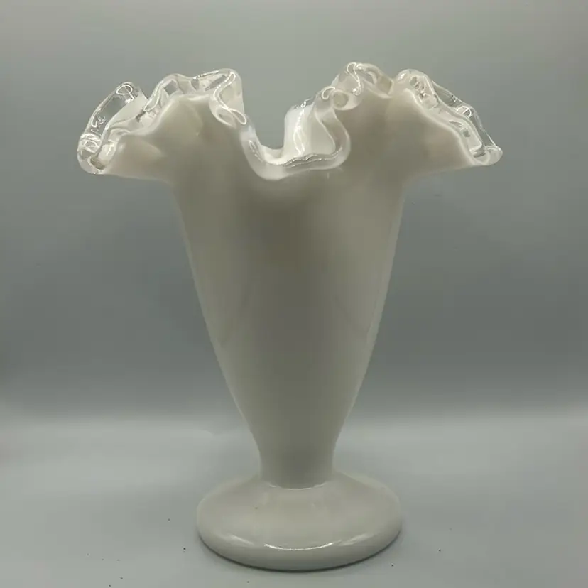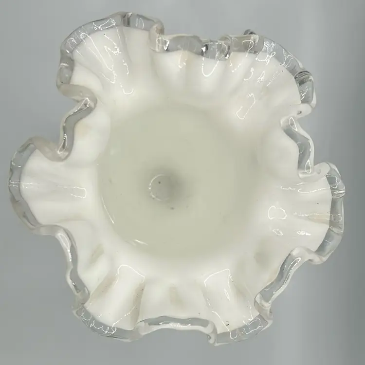 This item is a vintage fenton silver crest milk glass vase with a ruffled edge and clear translucent border. It stands 6 1/2 inches tall and 5 1/2 inches across the top. There are no chips or cracks.