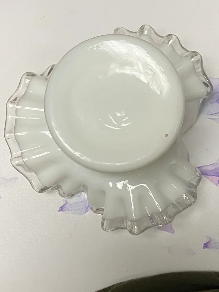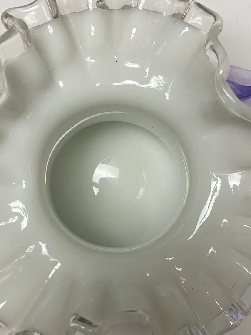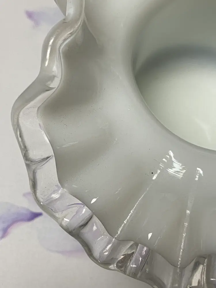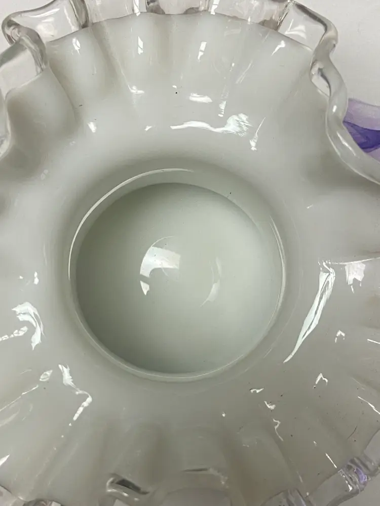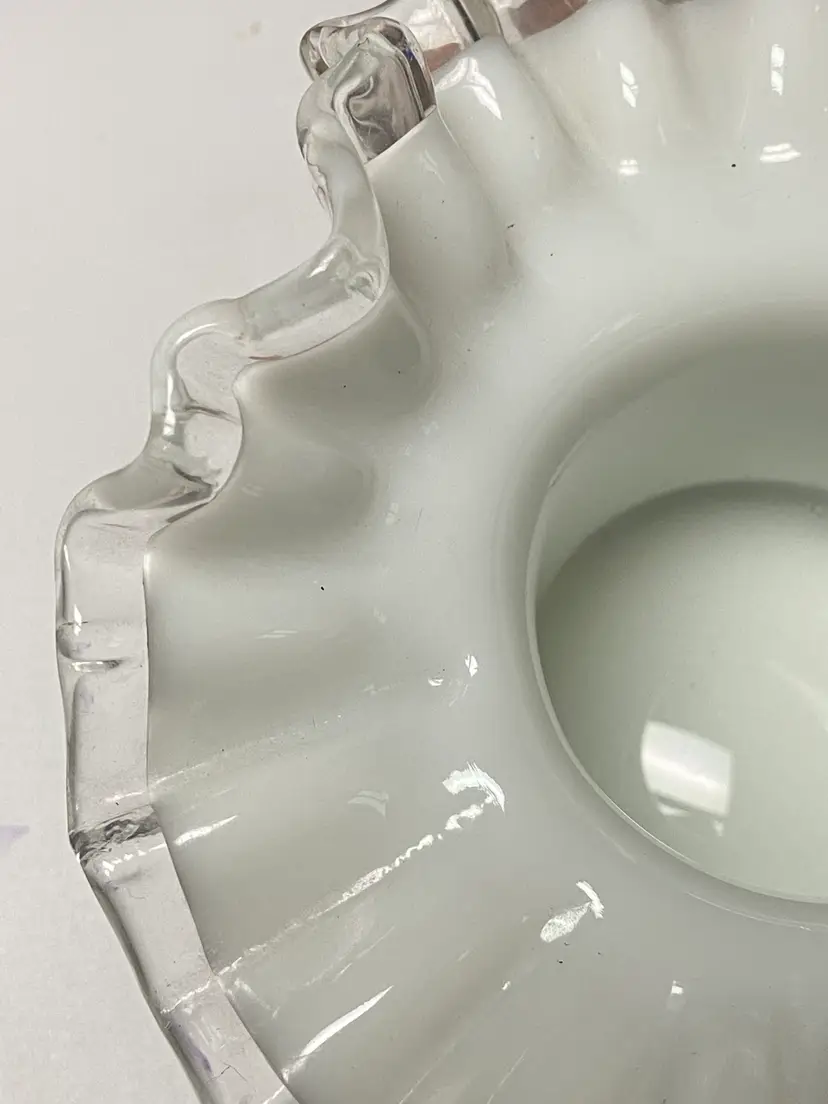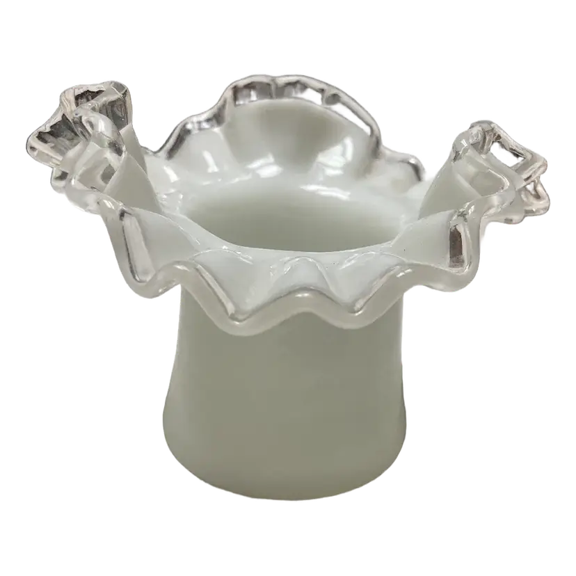 Vintage Fenton Silver Crest Milk Glass Top Hat Vase w/ Ruffled Clear Glass Rim, 3.5" Tall