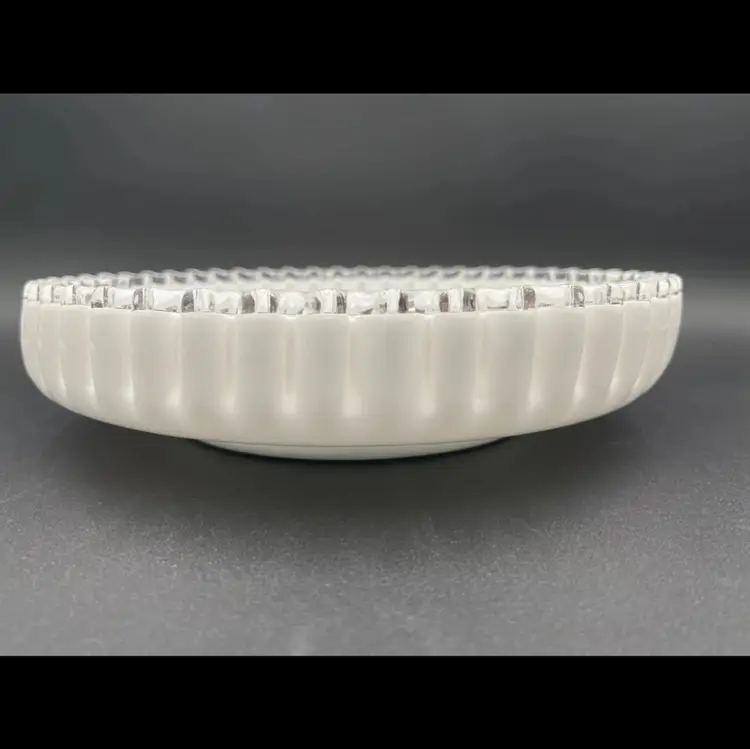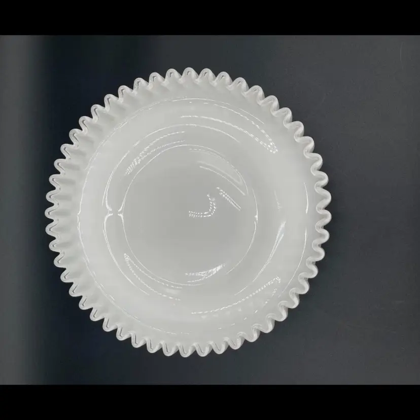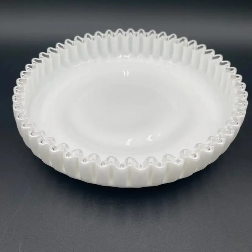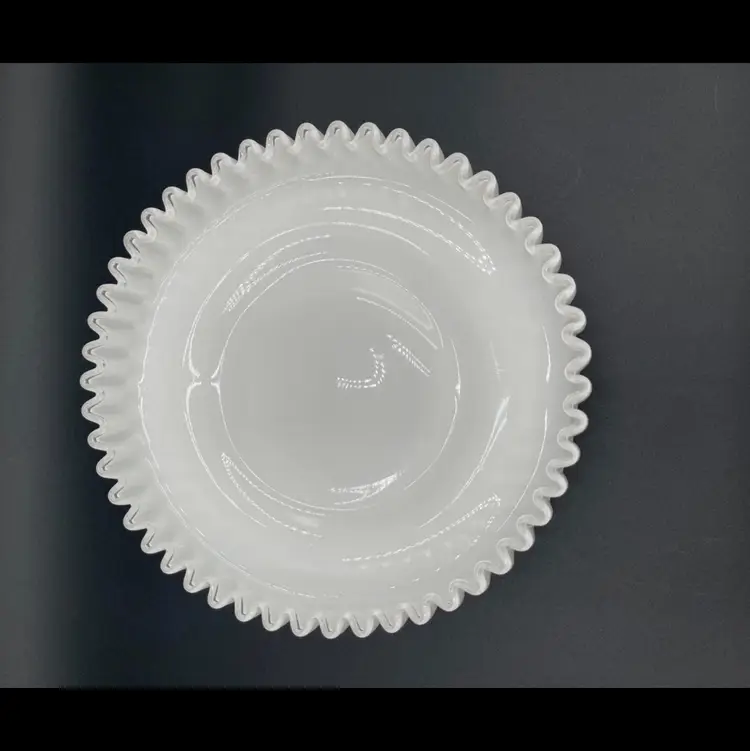 Beautiful Fenton Silver Crest milk glass serving dish. The ruffled edge and footed base give this piece a unique look. Produced 1942 to 1986. Beautiful for the mid-century modern collector as well as the vintage glass or Fenton collector. Approximately 10.25” in diameter And 2.5” high, including foot. It is suggested that this piece be hand washed only.