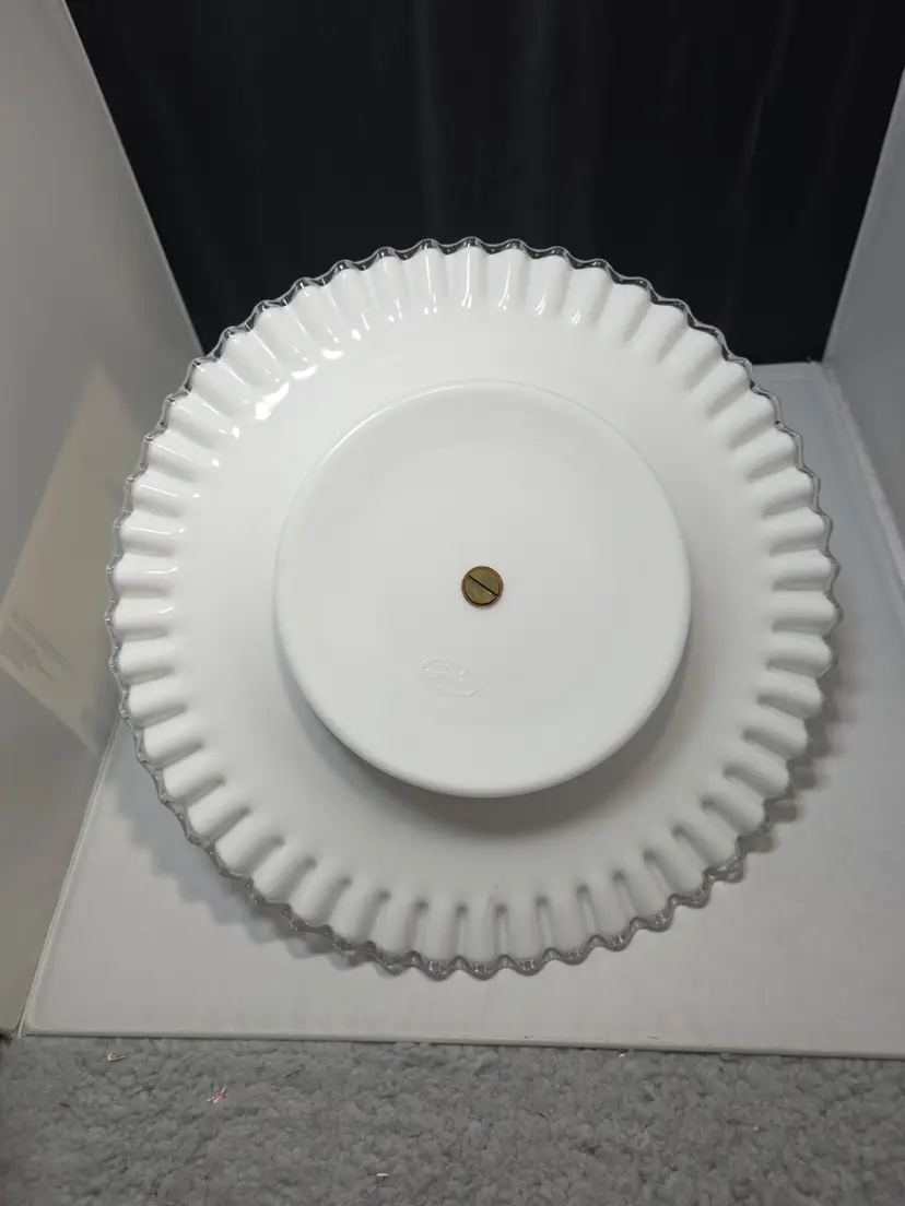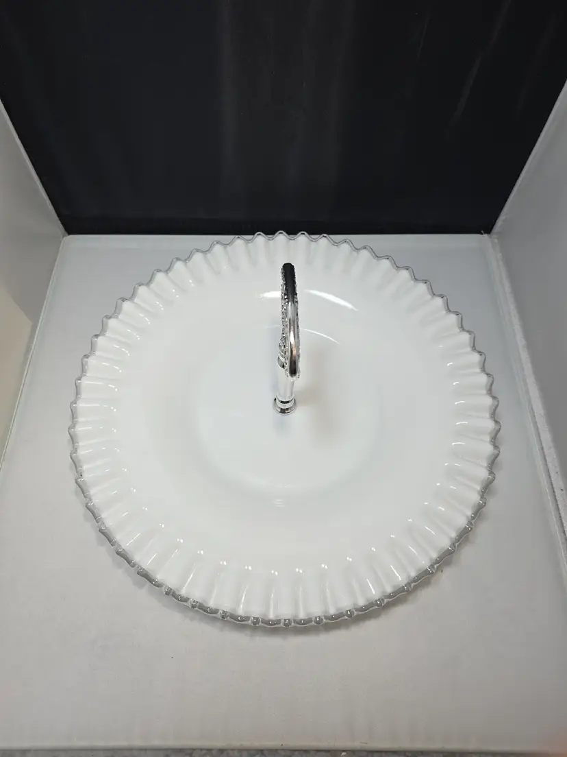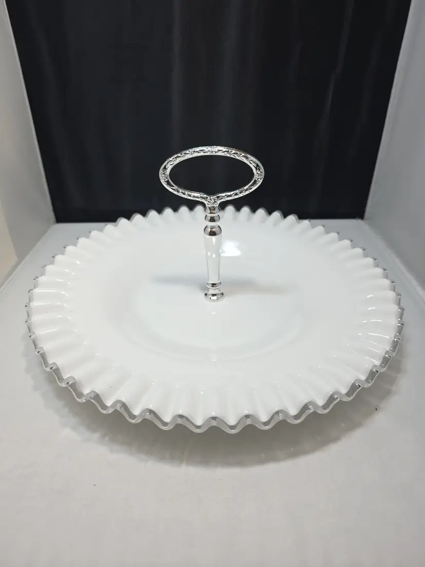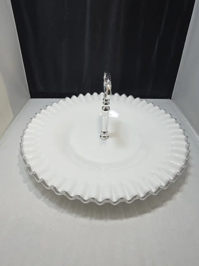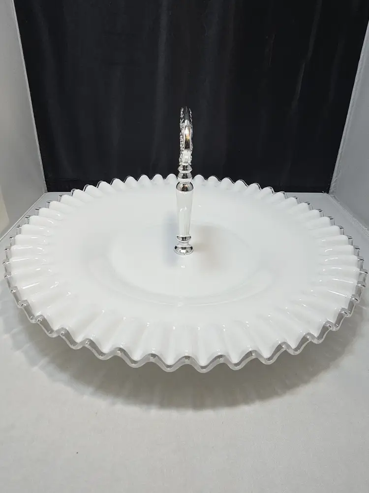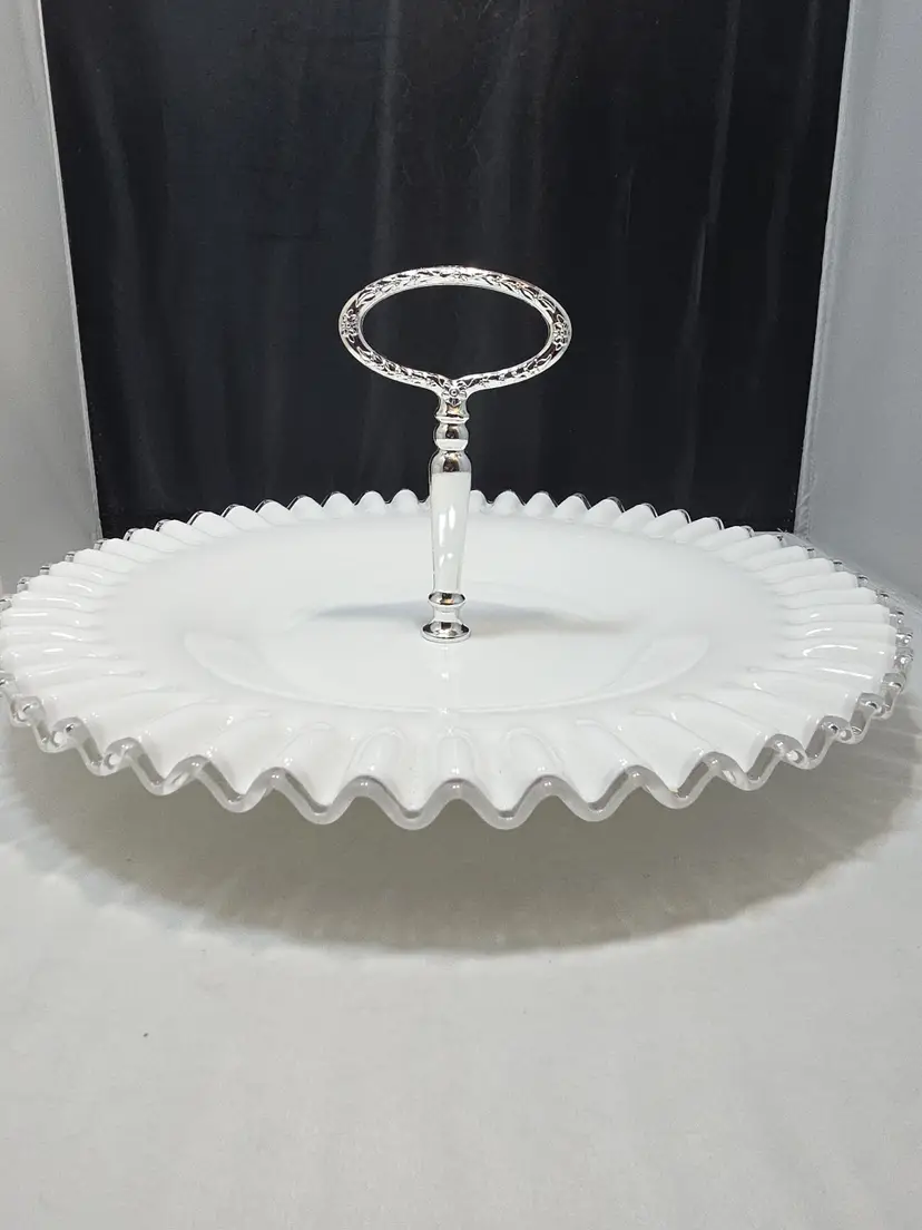 Description Vintage Fenton Silvercrest milk glass sandwich / tidbit serving tray featuring a ruffled scalloped rim and clear center handle. Glossy white milk glass with classic Silvercrest styling and an evenly fluted edge. Embossed Fenton mark on the underside.