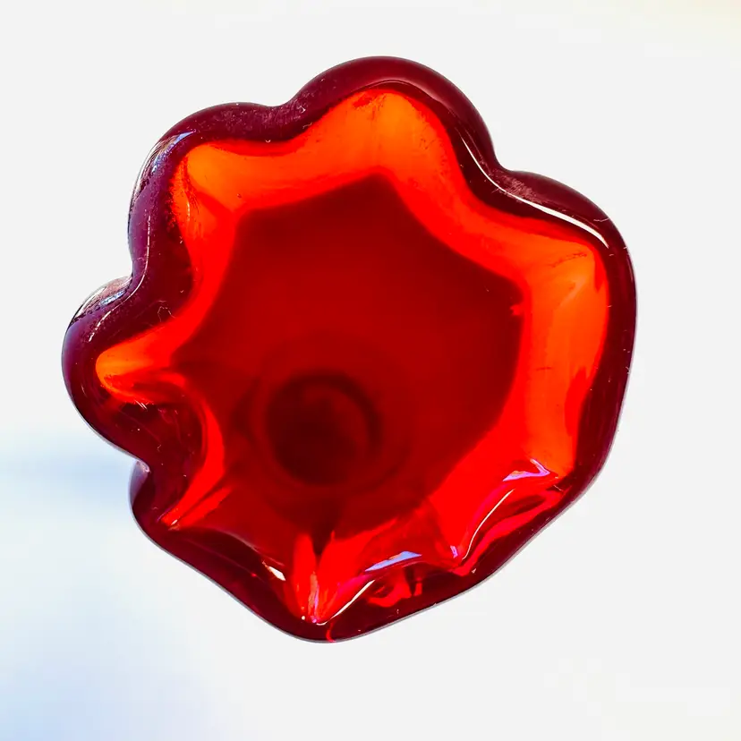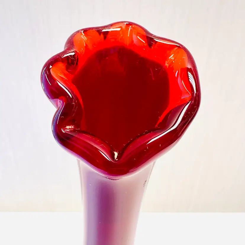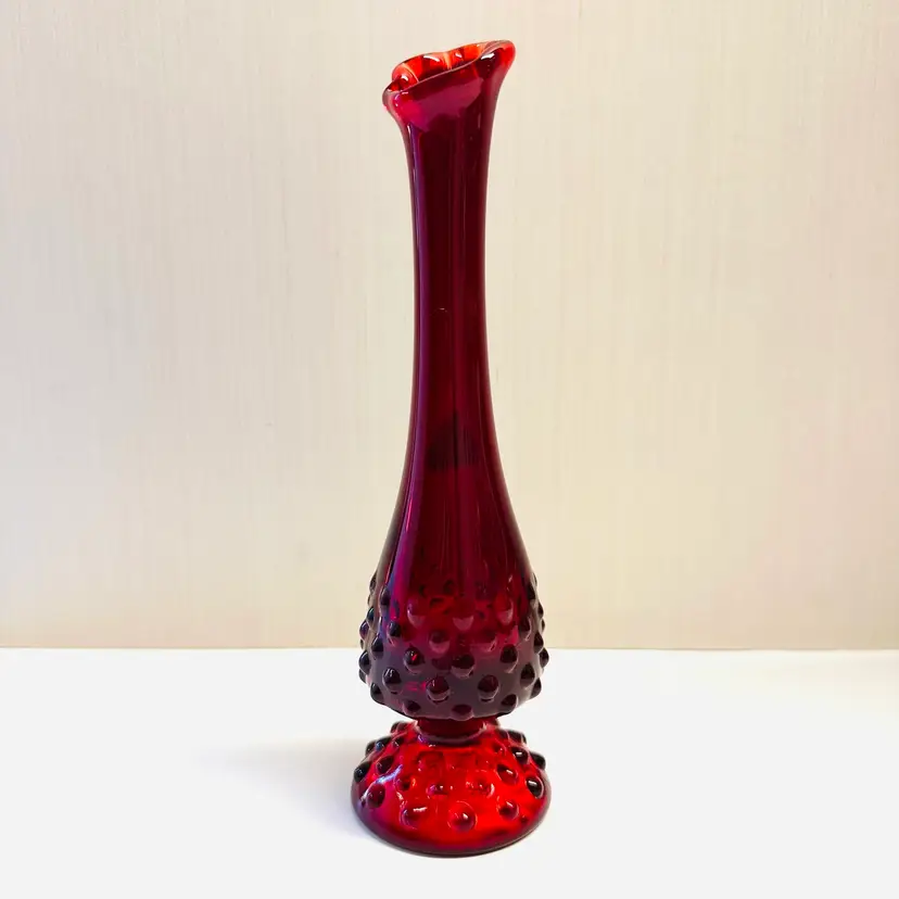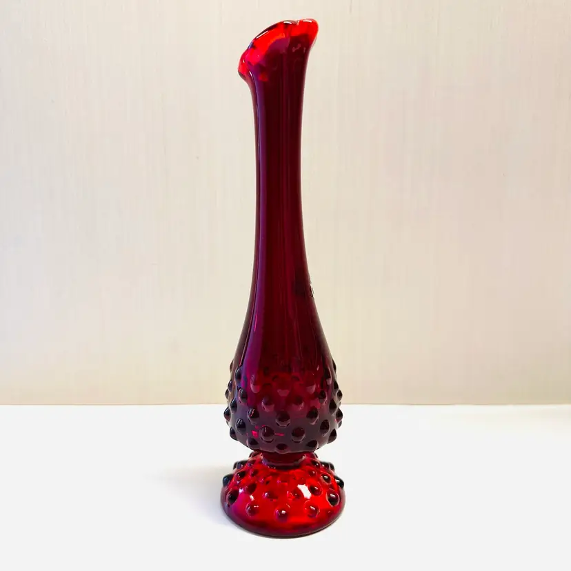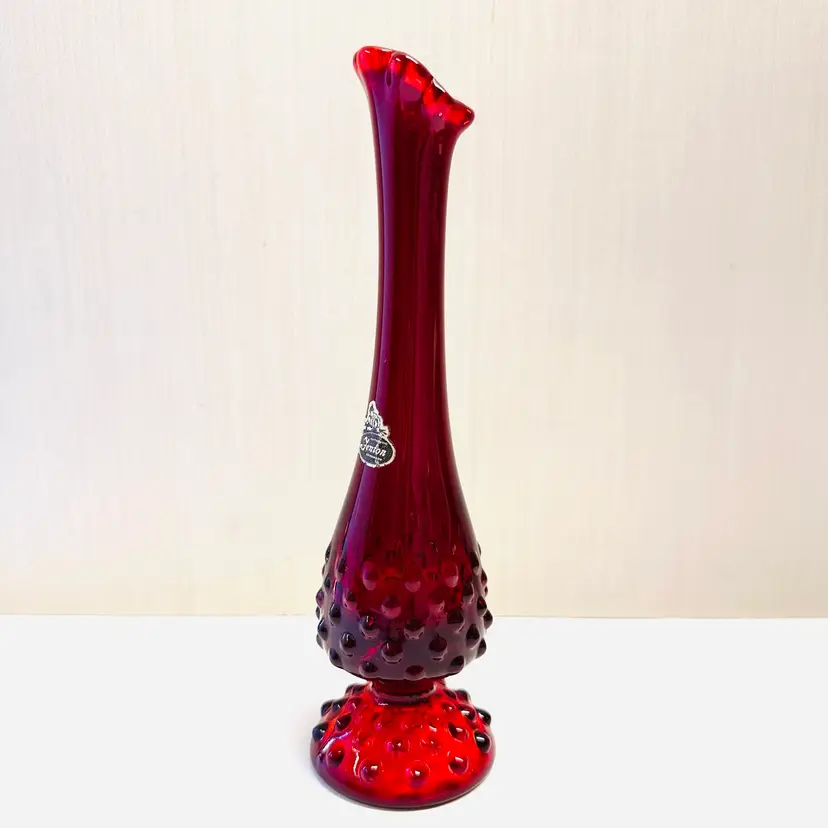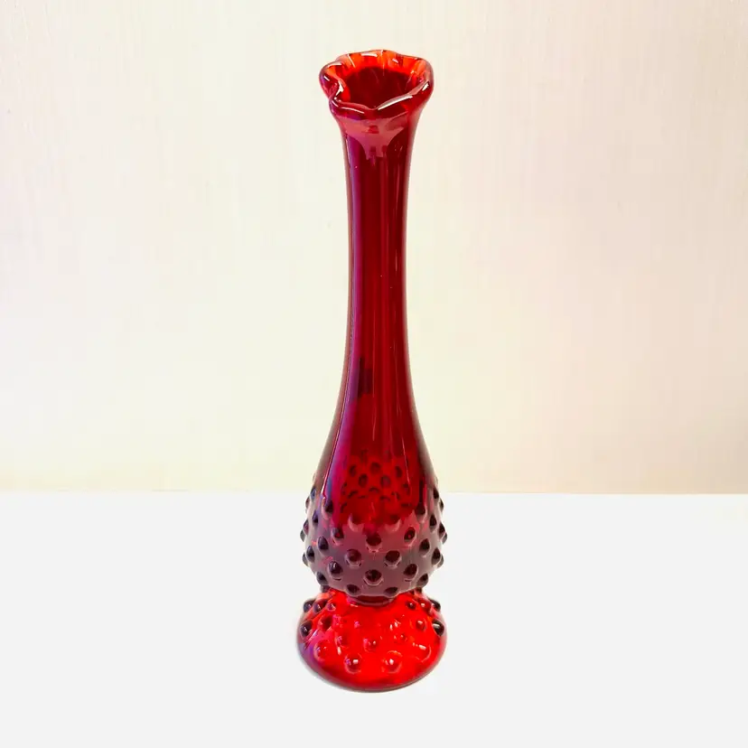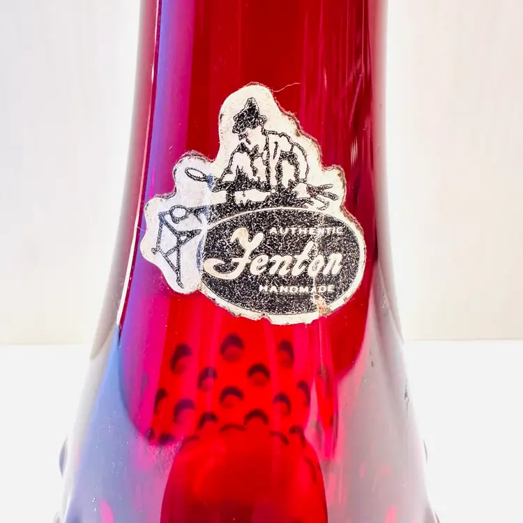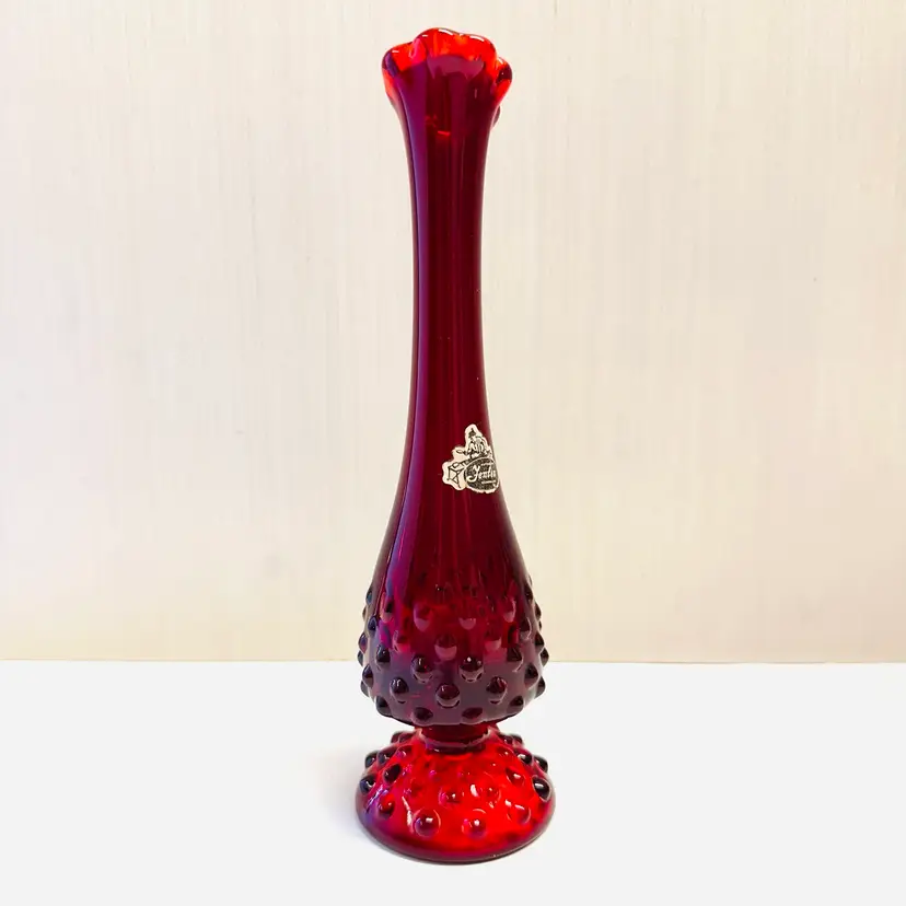 Previously owned Fenton Ruby red hobnail swung bud vase. There is a maker sticker on vase (see pictures).