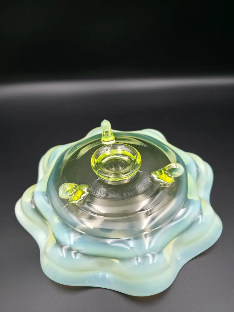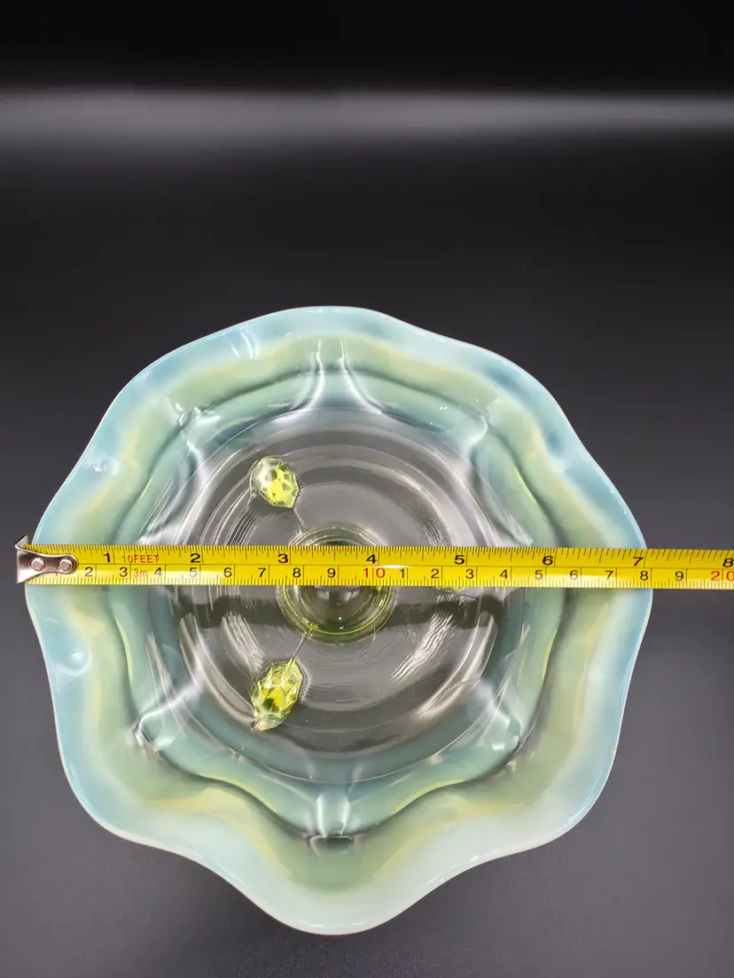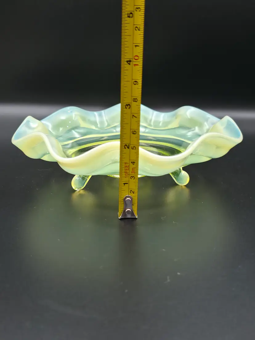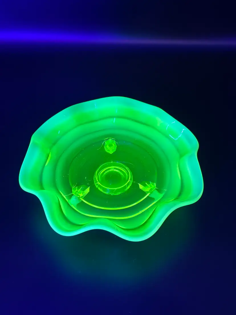 This beautiful dish has such a brilliant UV glow. no chips or cracks - but it does have manufacturing flaws/wrinkles on the bottom, not cracks (smooth to the touch). Measures inches in diameter and 2 inches tall. Thank you for looking and have a great day!
