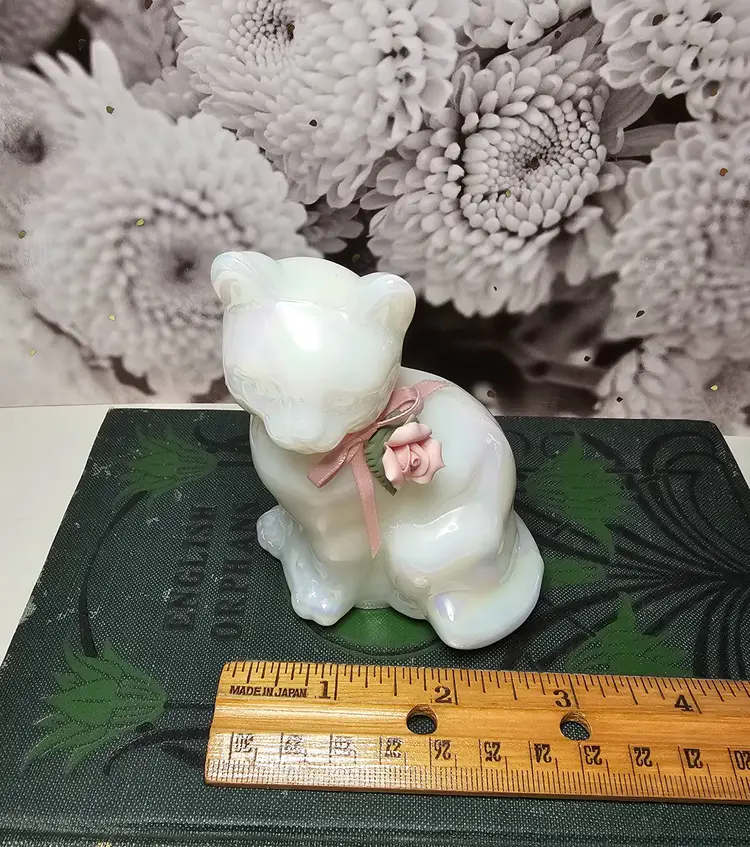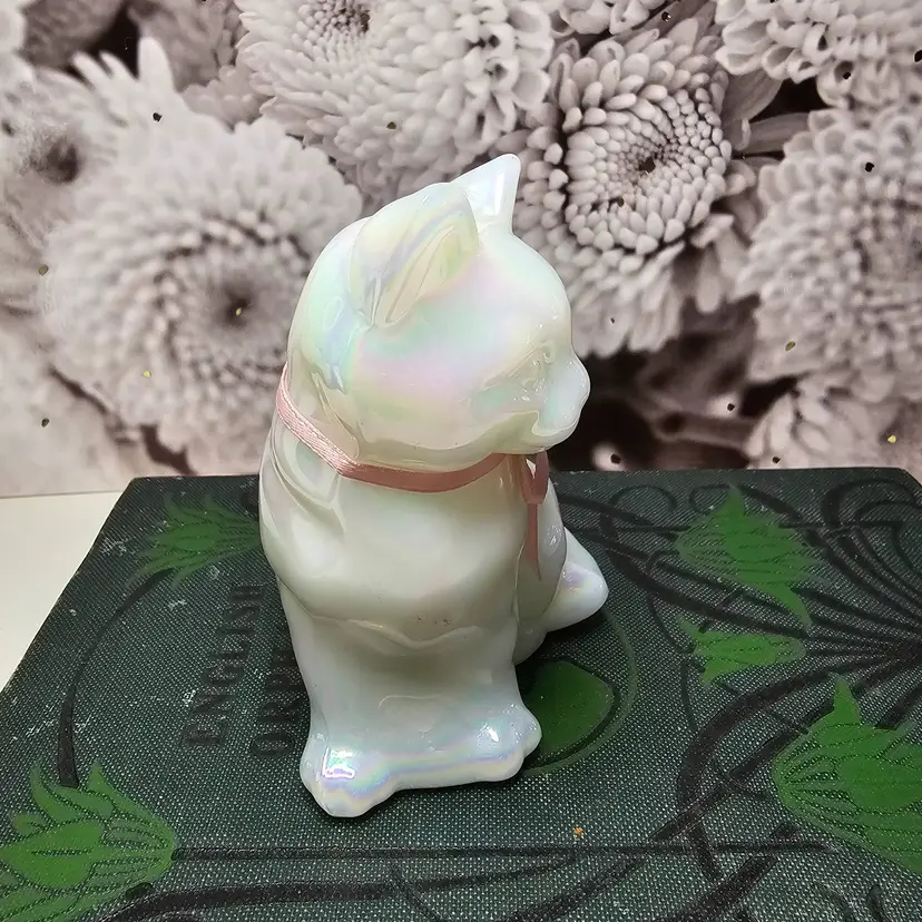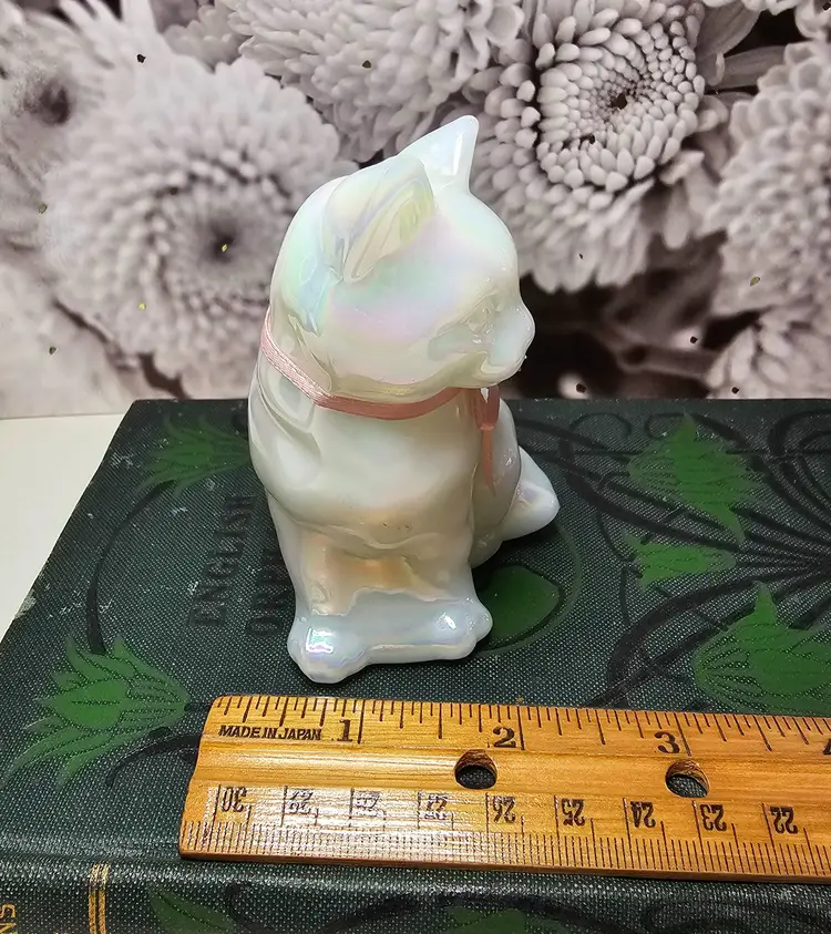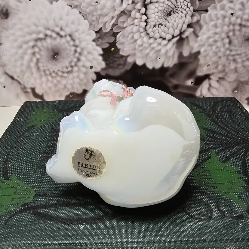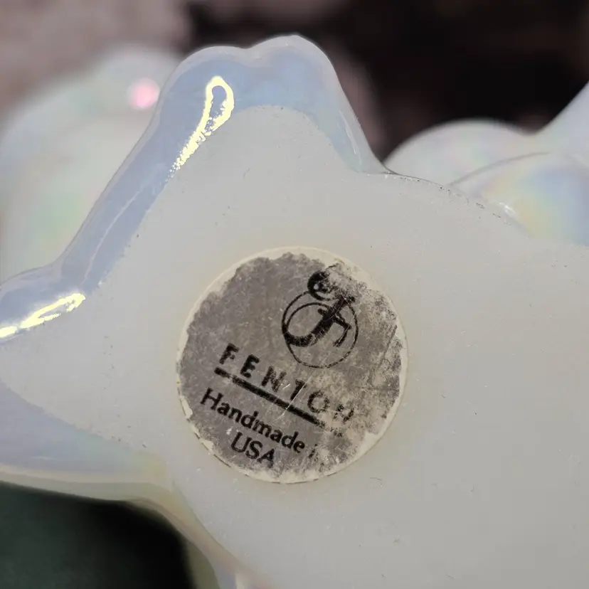 Lovely condition with no chips or cracks. Embossed with the Fenton logo. Its original Fenton sticker is attached but has some wear. Measures about 3" wide x 3-1/2" tall.