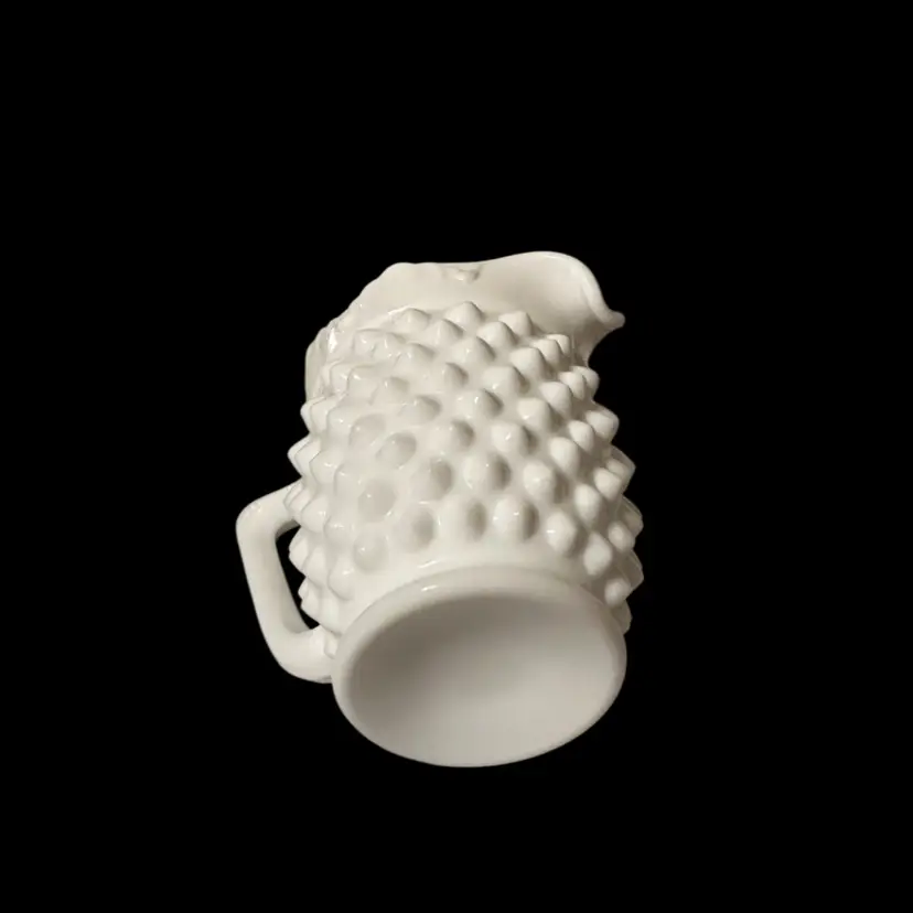 White milk glass Hobnail, featuring distinctive round projections on the surface Approximately 4 inches tall Ruffled or scalloped edge and a beaded handle