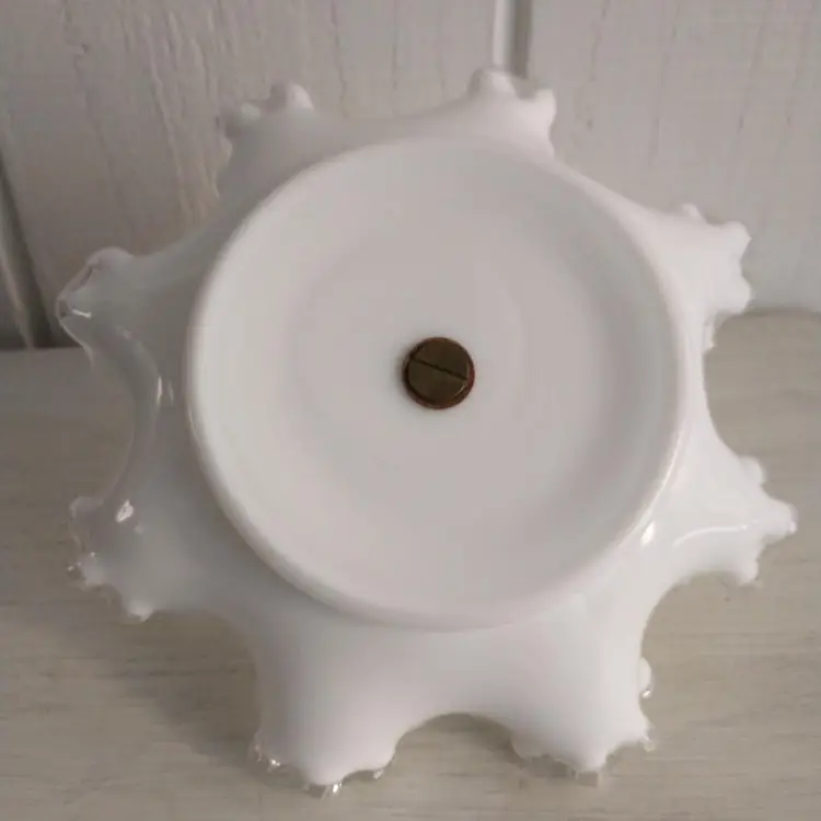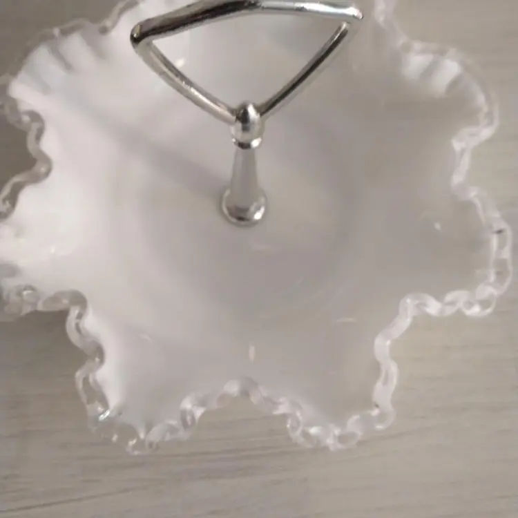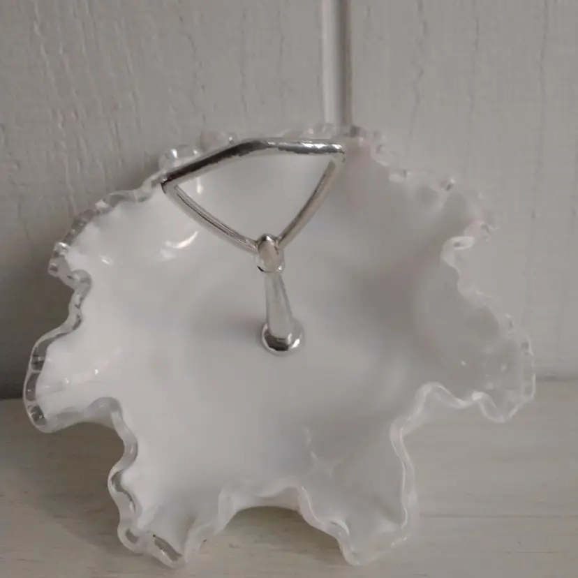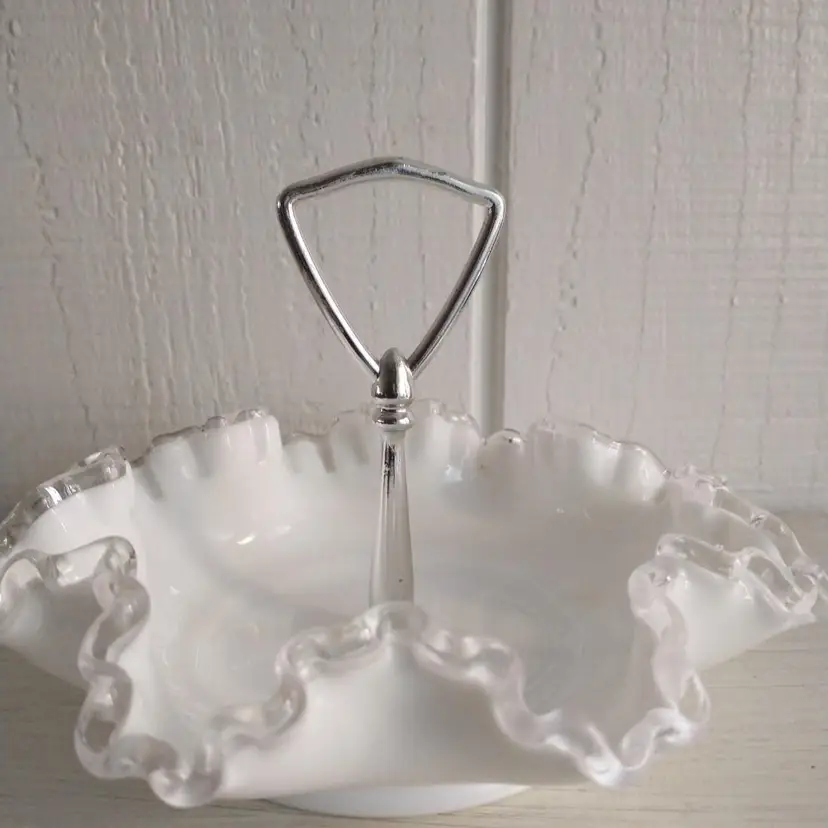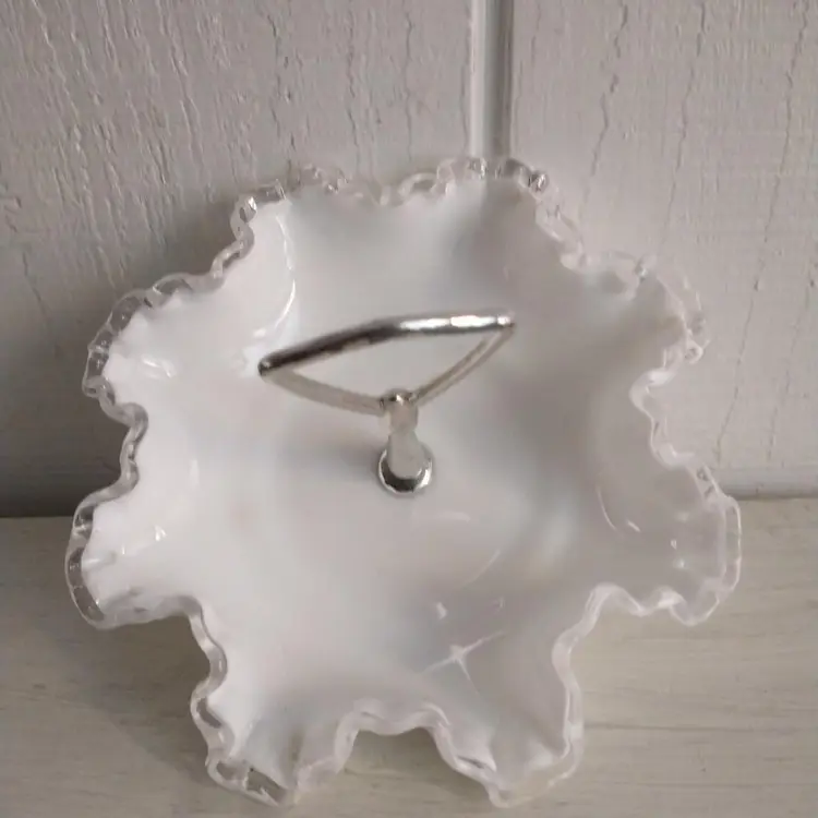 Vintage Fenton white milk glass crystal/silver crest round tidbit serve bowl with silver center handle Vintage condition No chips, cracks or repairs Approx measurement 8"W