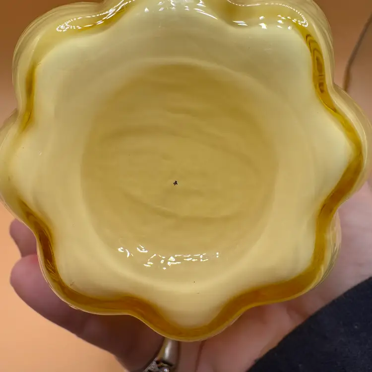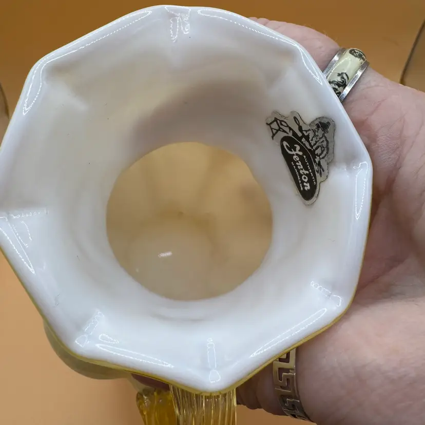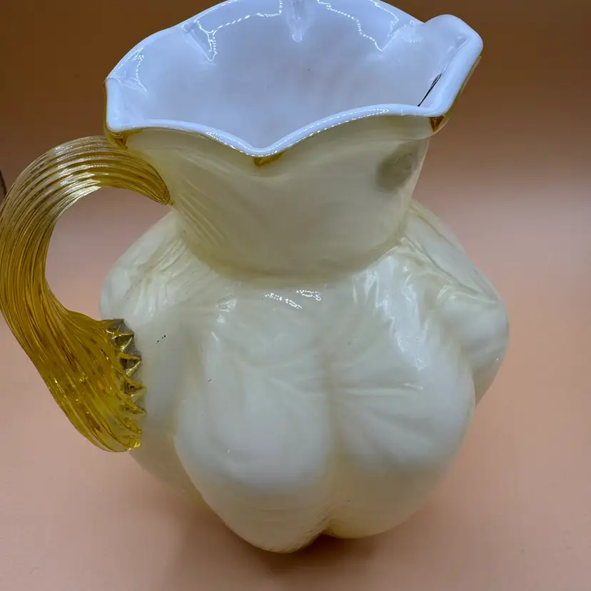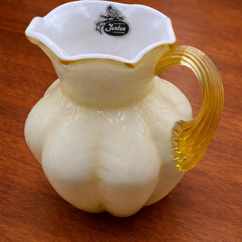 Fenton Pitcher Yellow Over White Cased Glass Fern Pattern No chips or cracks. Measures 5 1/2" H x 4" W (at widest)