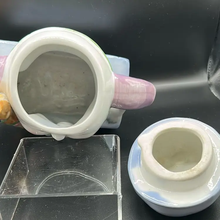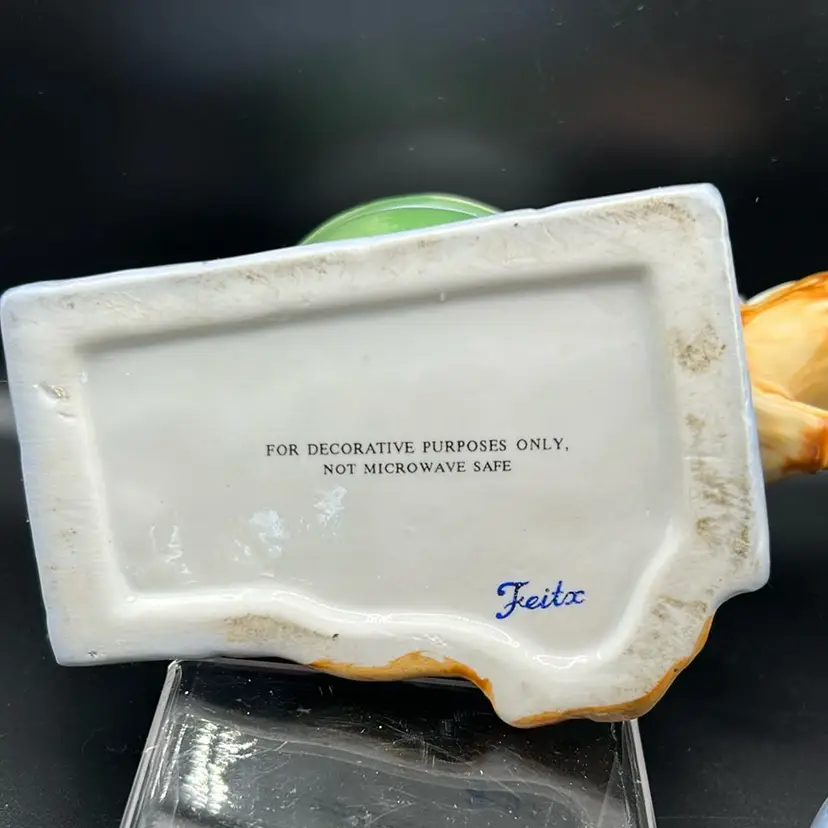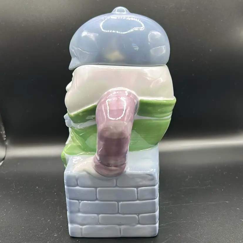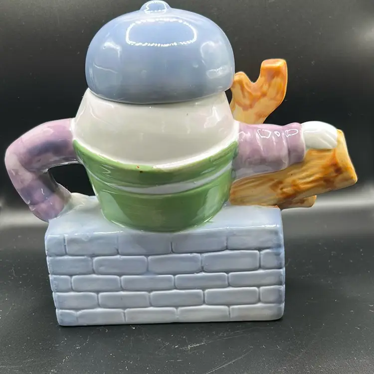 This piece is vintage collectible teapot designed by Fetix . It features a whimsical depiction of the nursery rhyme character Humpty Dumpty. It is ceramic. it stands 7 inches tall and 7 inches across. There are no chips or cracks. It is an excellent condition.
