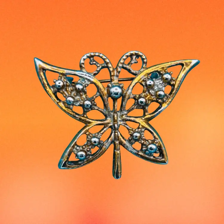 This vintage butterfly brooch features an elegant openwork filigree design with raised bead accents on the wings. Crafted in gold-tone metal with silver-tone detailing, this piece brings a touch of whimsical charm and symbolic beauty.