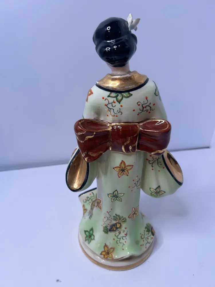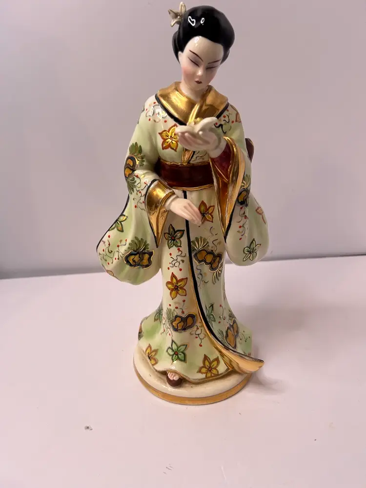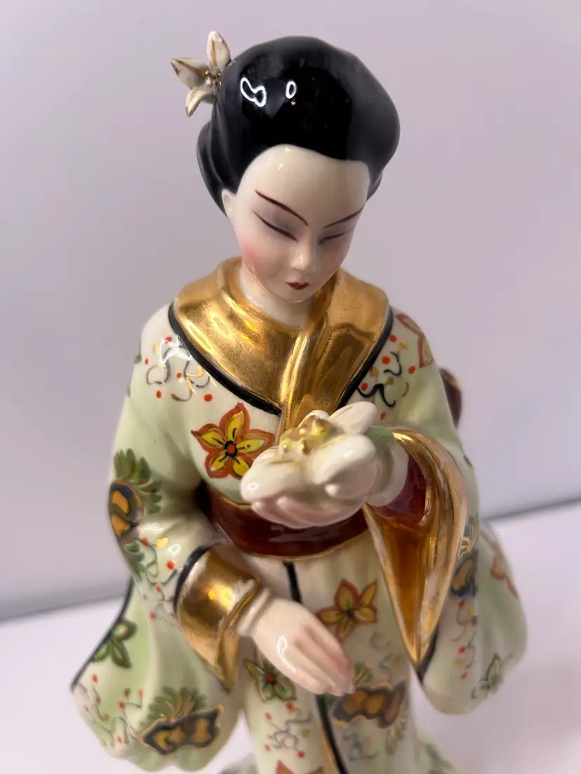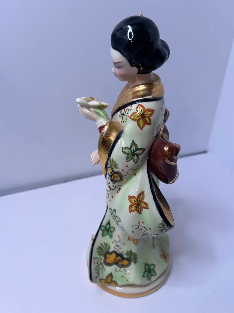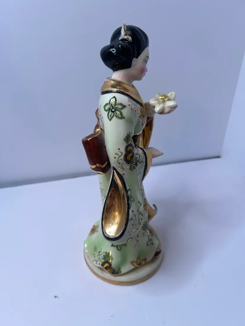 Vintage Fine China Asian Woman Figurine. Woman is holding a flower. Gold karat paint. Used, no chips or cracks.