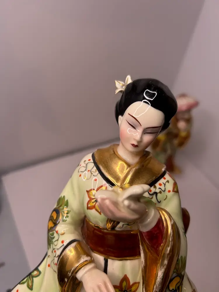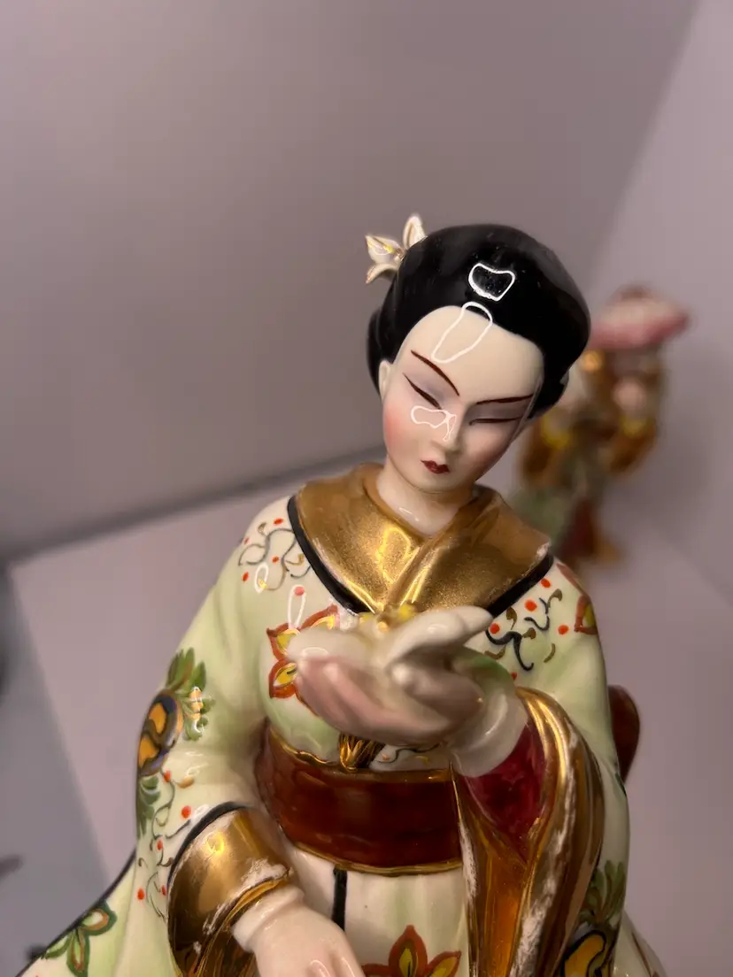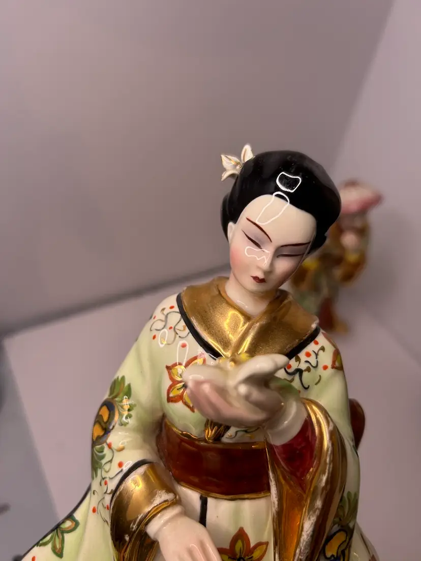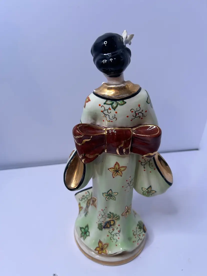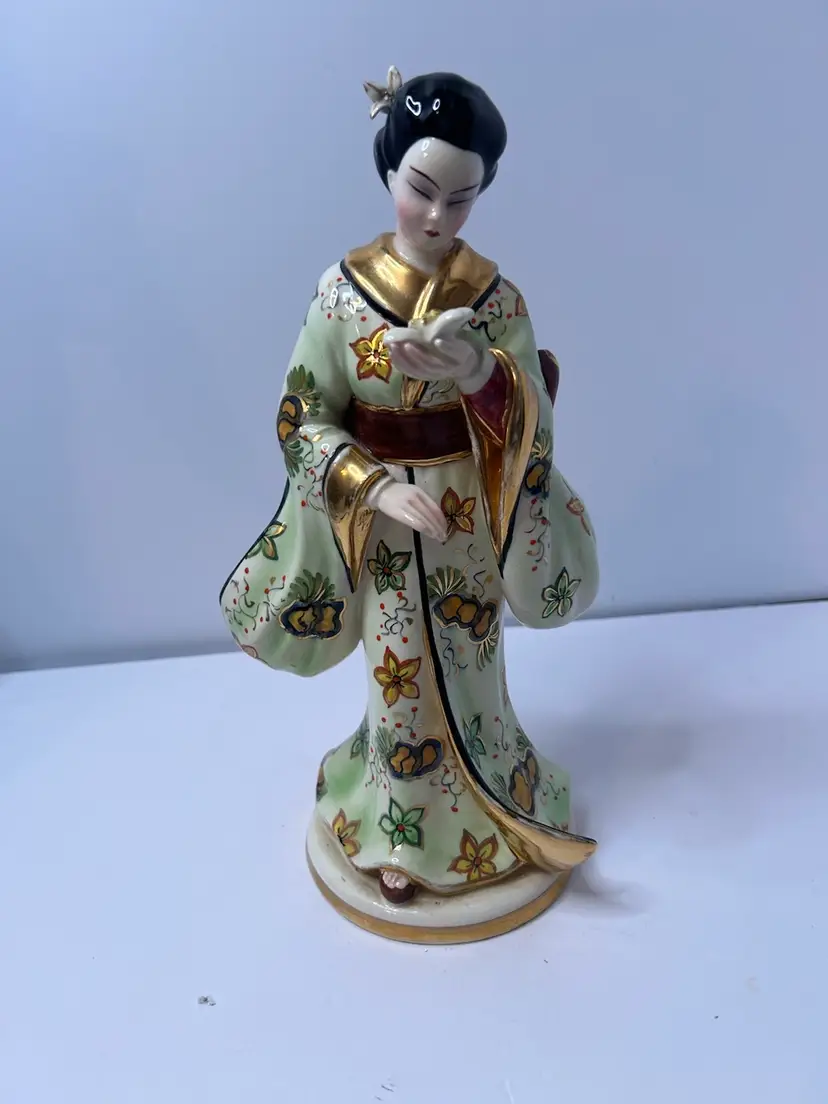 Vintage Fine China Asian Woman Figurine. Woman is holding a flower. Gold karat paint. Used, no chips or cracks.