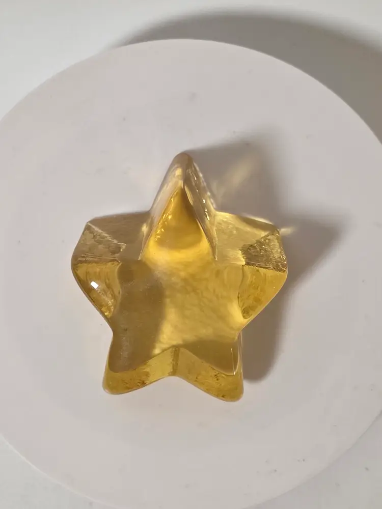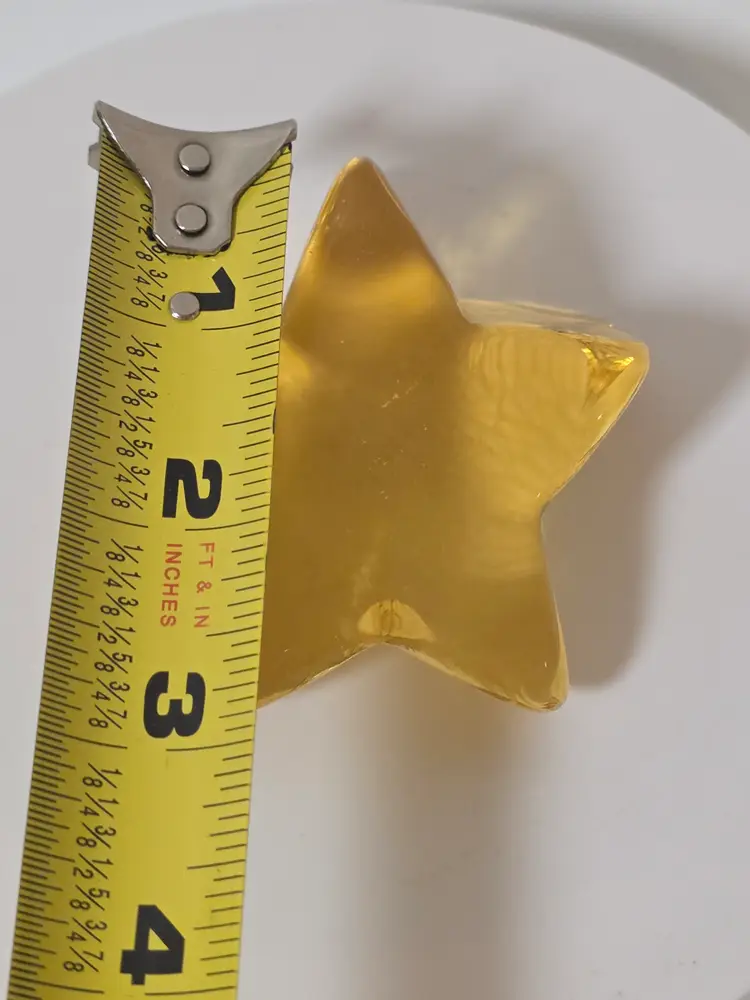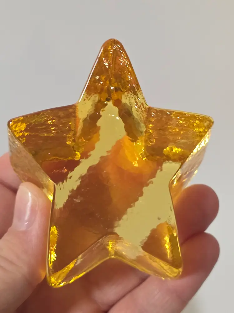 The Vintage Fire and Light Shooting Star Paperweight in yellow is a unique and decorative piece made of glass. It is a contemporary art glass creation by the Fire and Light brand, originating from California in the United States. This paperweight features a stunning shooting star design, adding a touch of vintage charm to any space. With its original production style and rare find status, this handmade piece is sure to be a standout addition to any collection.