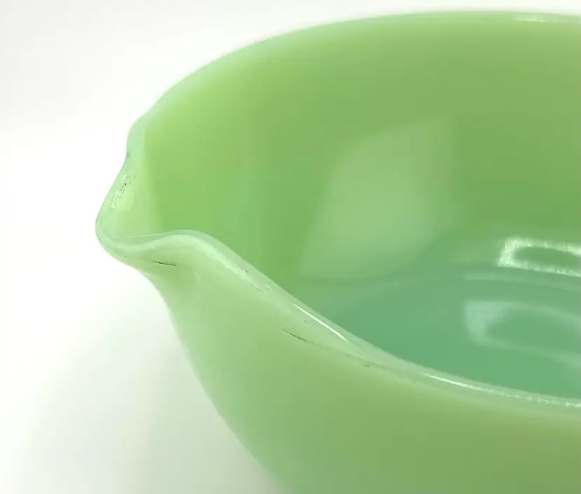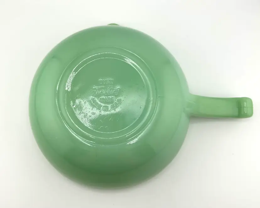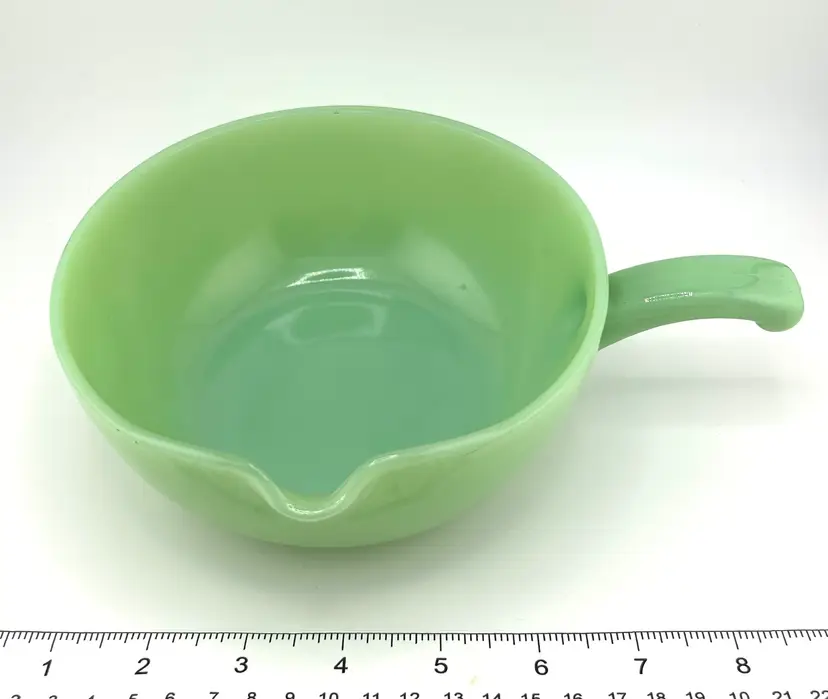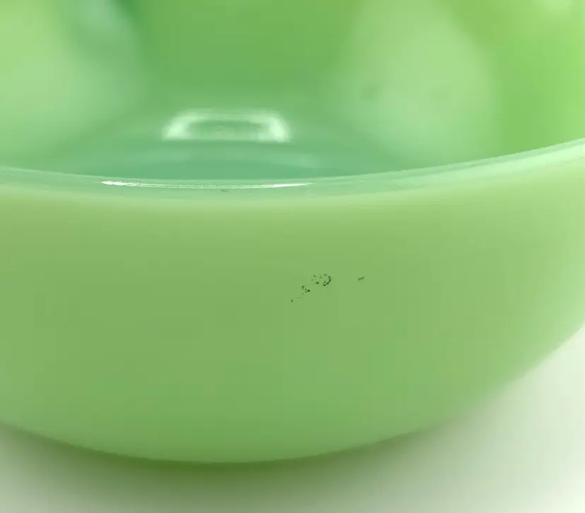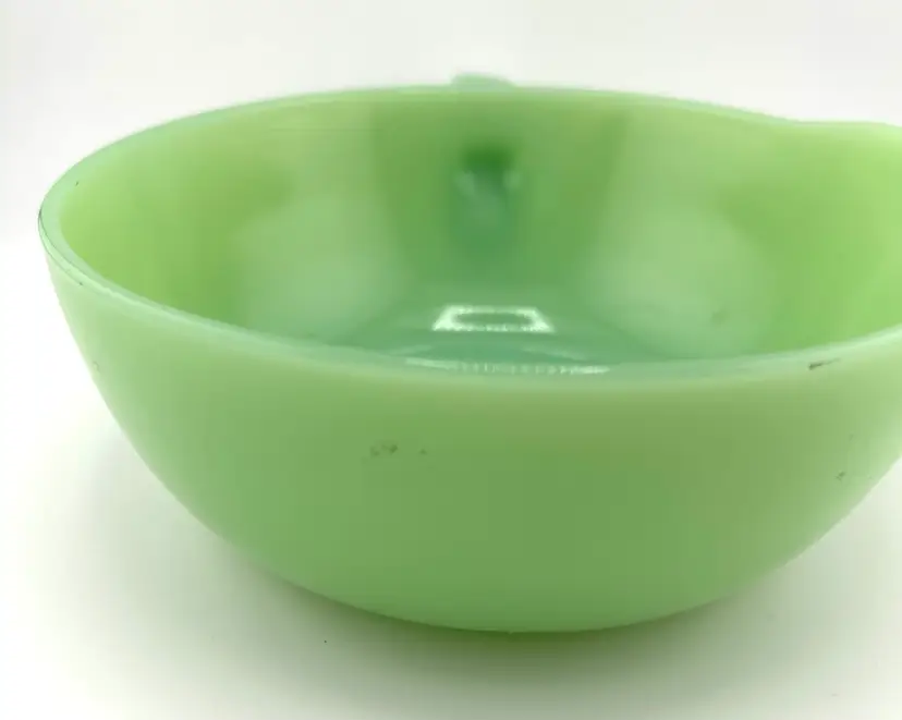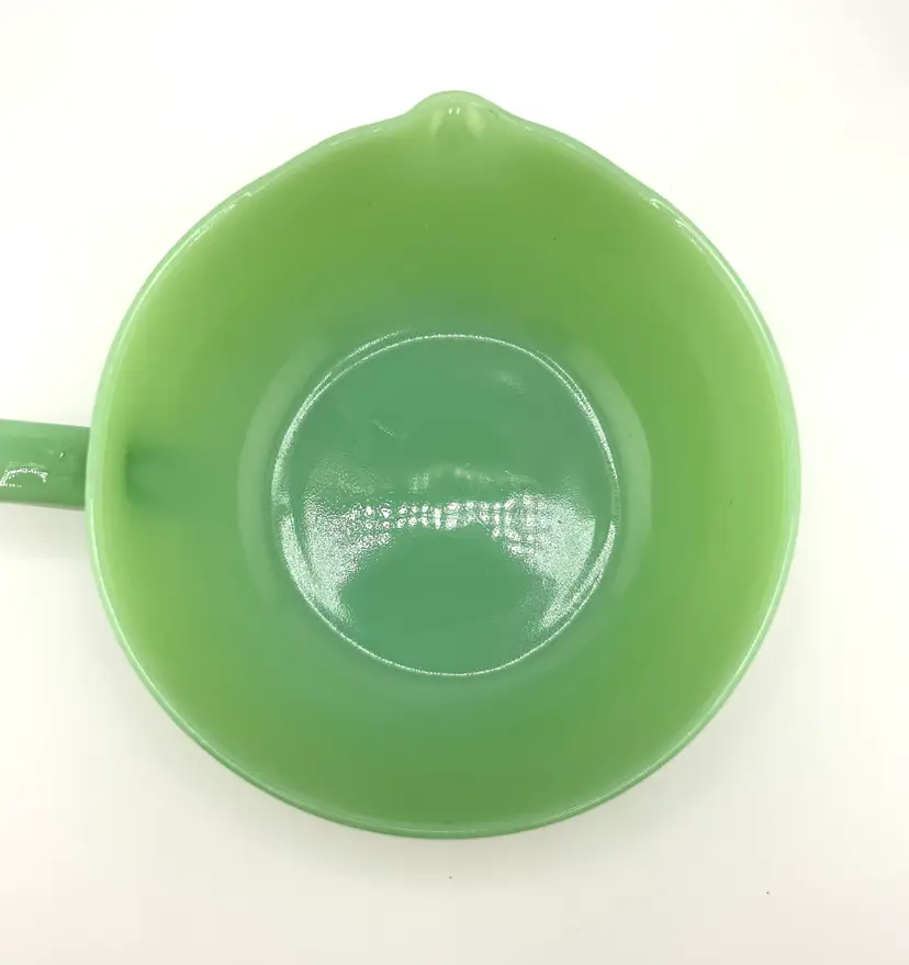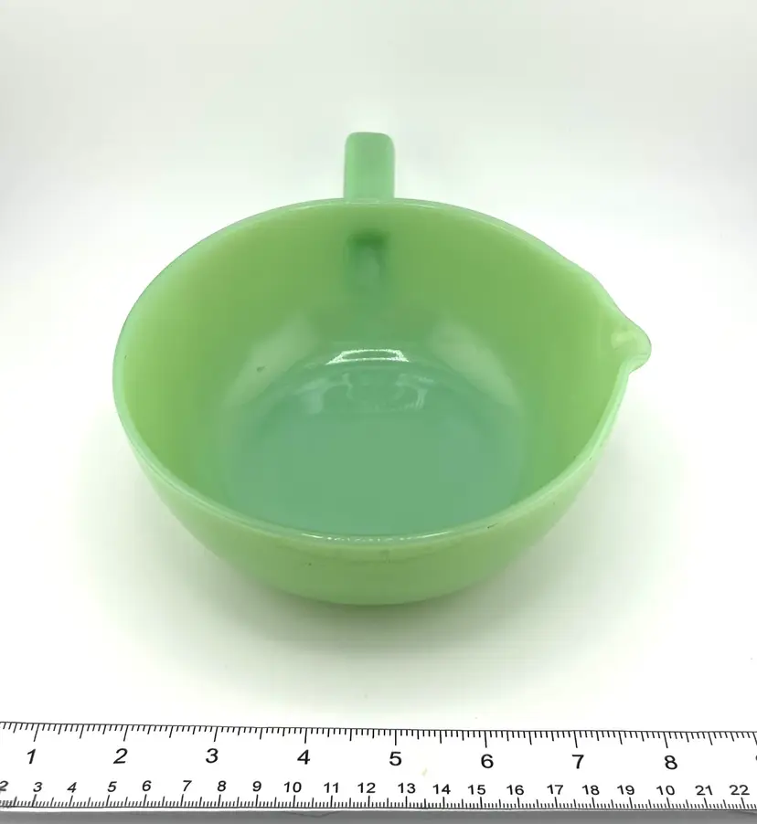 Has some scuffing. Fire-King Jadeite is a highly collectible, pale green opaque milk glass produced by Anchor Hocking from the 1940s to 1970s. Known for its durability and vintage charm, it was once inexpensive, everyday tableware often used as promotional items.