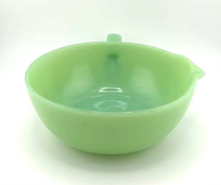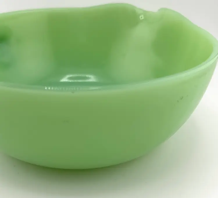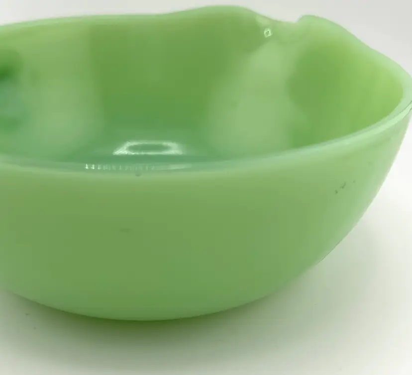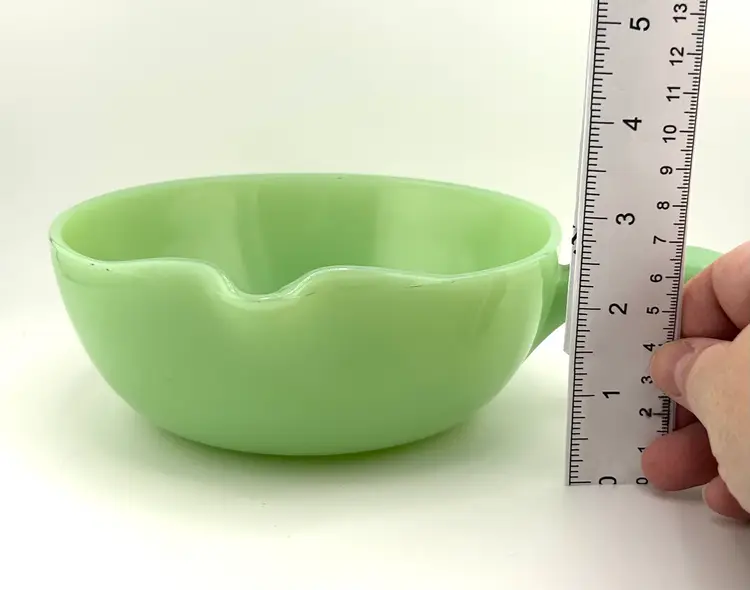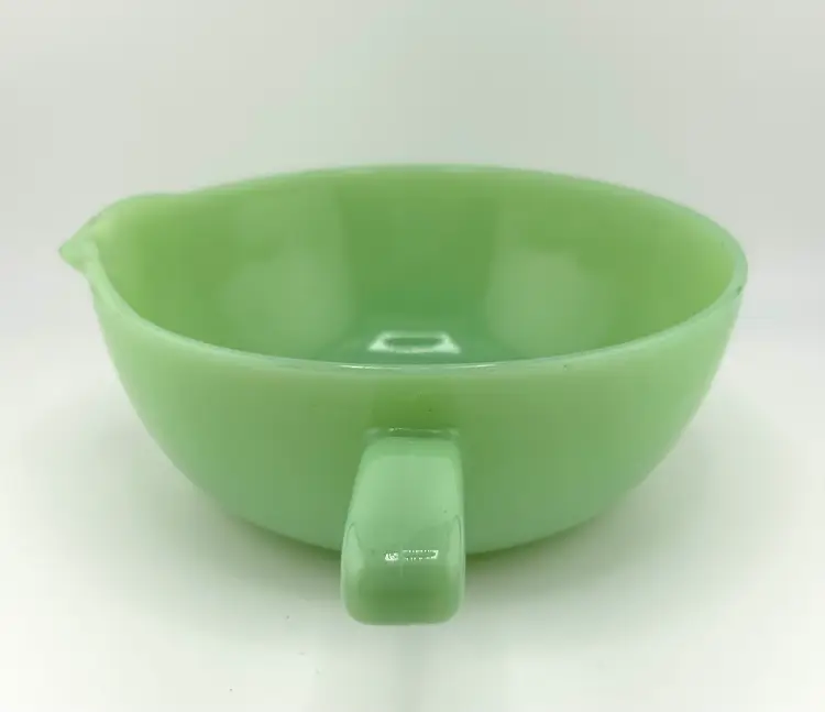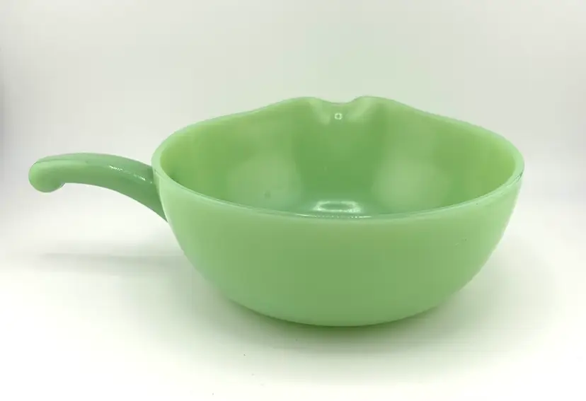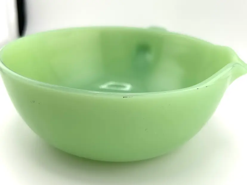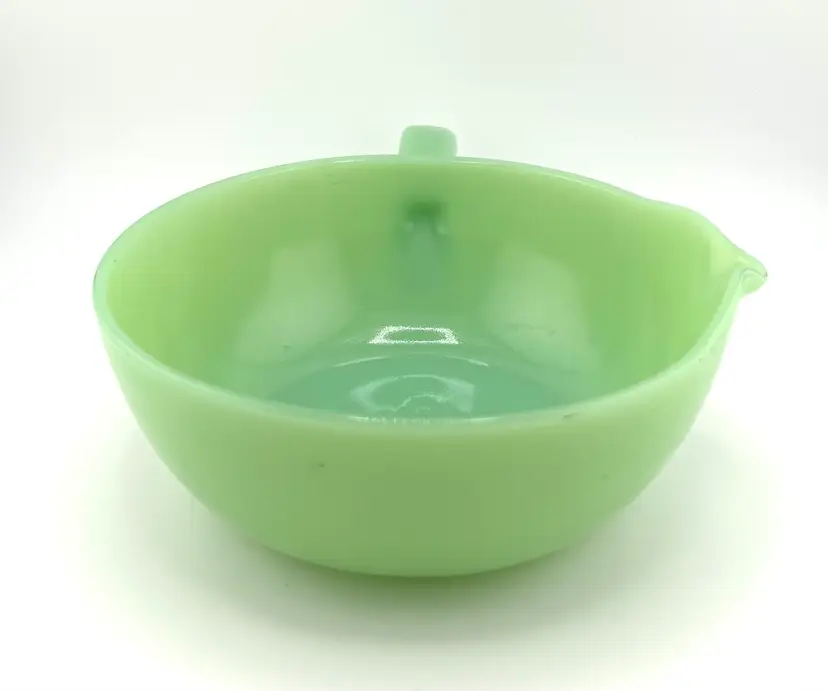 Has some scuffing. Fire-King Jadeite is a highly collectible, pale green opaque milk glass produced by Anchor Hocking from the 1940s to 1970s. Known for its durability and vintage charm, it was once inexpensive, everyday tableware often used as promotional items.