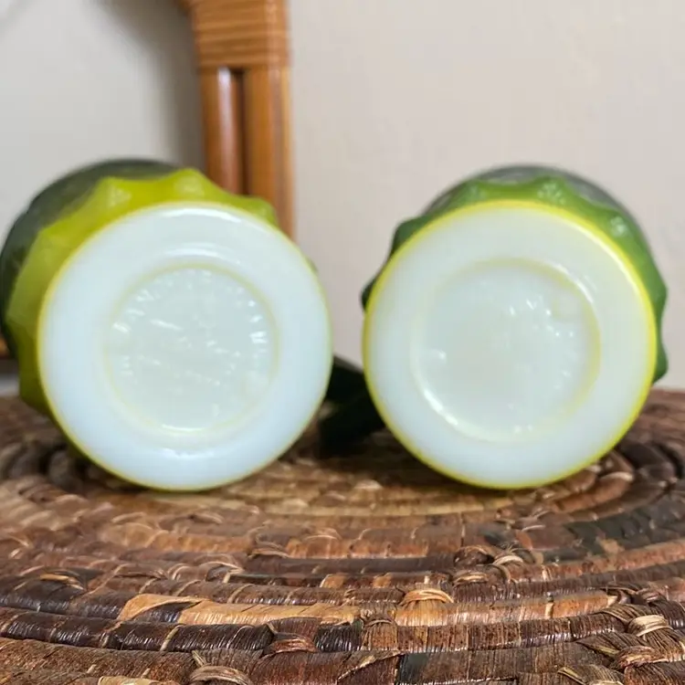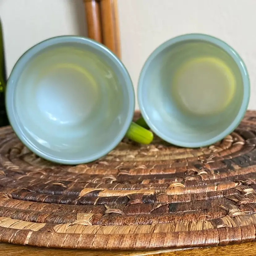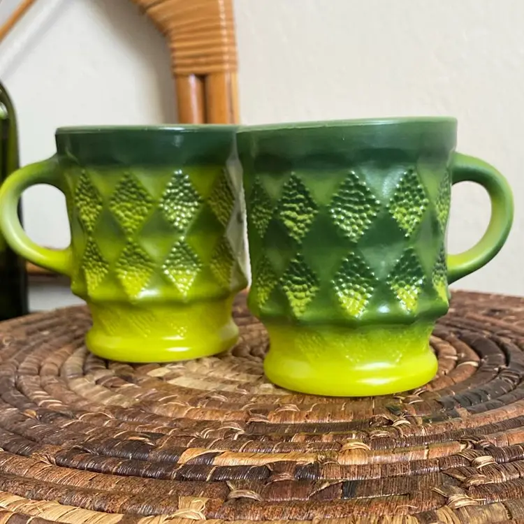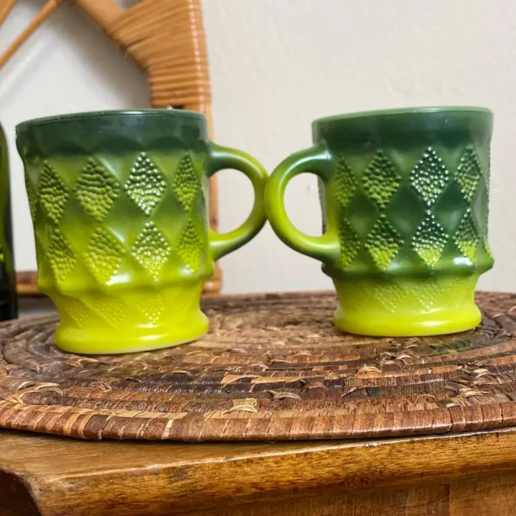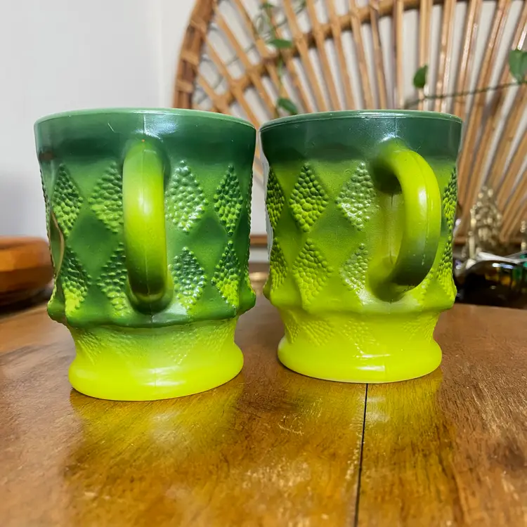 1970s Anchor Hocking Fire King kimberly mugs in chartreuse and forest green ombre over a 3D diamond print. 4” height / 3” diameter Excellent condition, no paint wear or chips.
