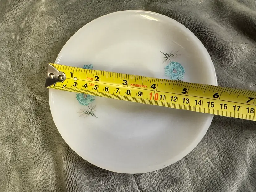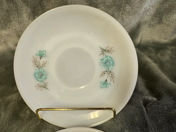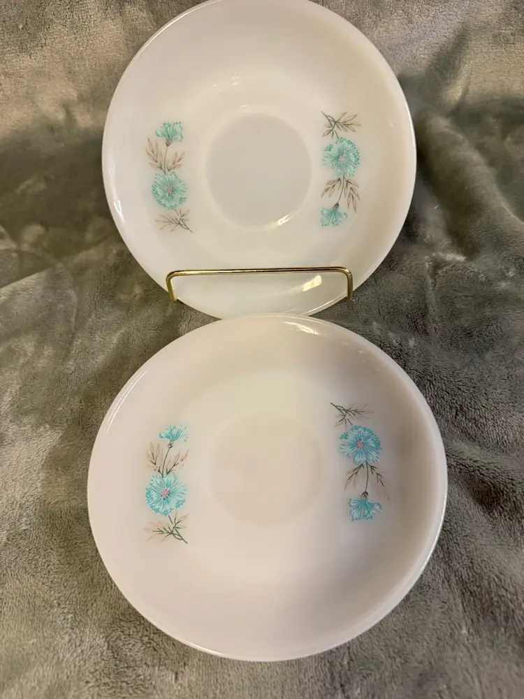 Elevate your tea time with a touch of vintage charm using this pair of Fire King ovenware saucers. Crafted from durable milk glass, these saucers feature a delightful Bonnie Blue Corn Flower pattern that adds a quaint, floral touch to any table setting. The classic round shape and 6" diameter provide ample space for your favorite tea cups, making them an ideal choice for both casual and formal occasions.
