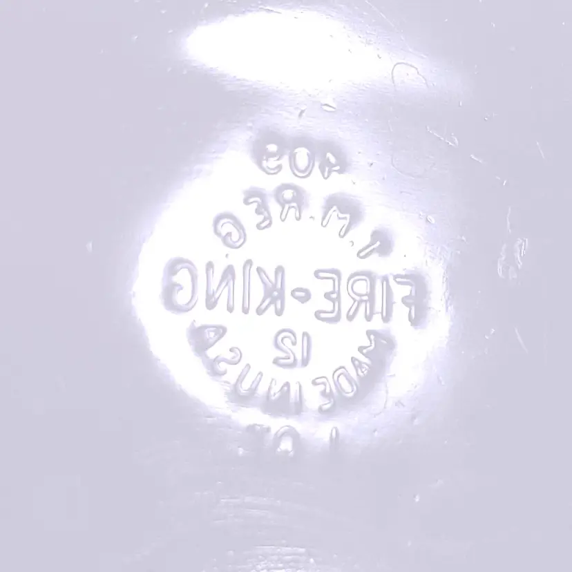 - "409, T.M. , REG, FIRE - KING, 12, MADE IN U.S.A. , 1 QT"