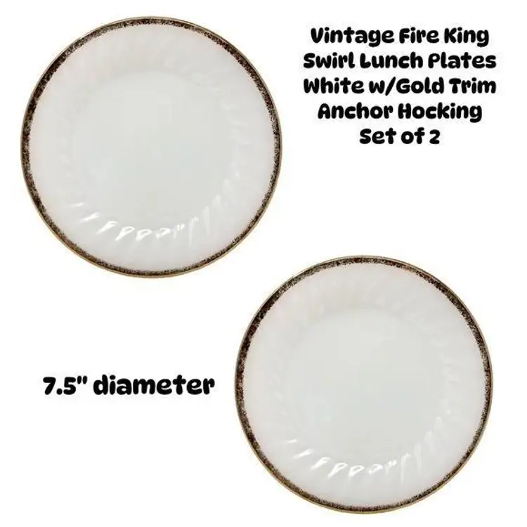 Set of 2Vintage 50's Anchor Hocking Fire King Swirl Pattern White with Gold Trim Salad/Lunch Plate. Each Measures 7.5" diameter Some fading of the gold trim to be expected with the age of the plate