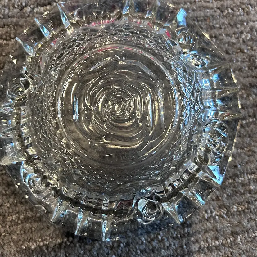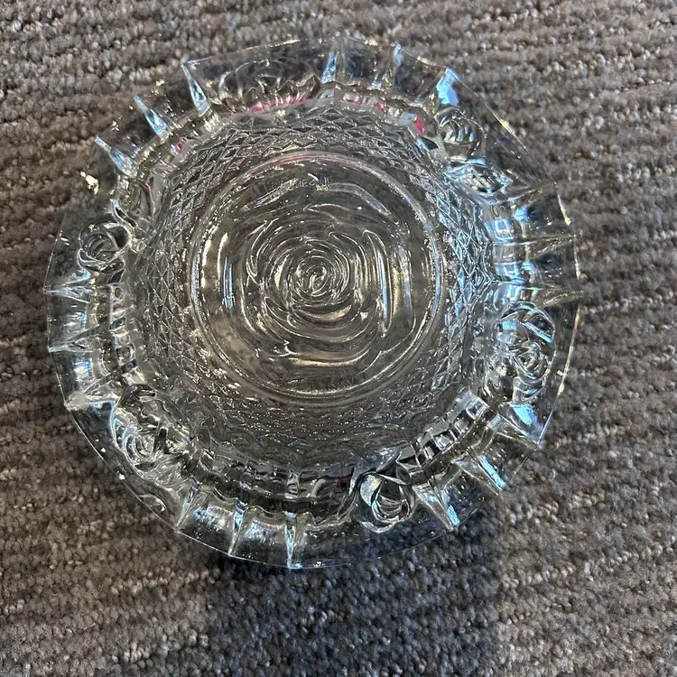 Vintage ashtray in good used condition. No chips or cracks. Rose floral pattern. Six inch diameter x two inch height.