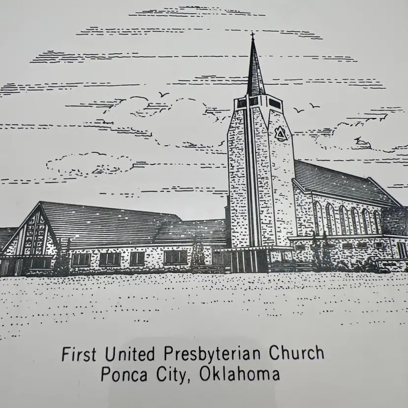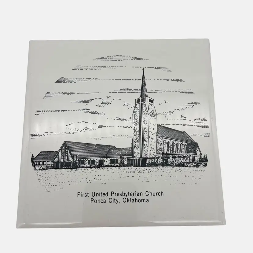 Vintage decorative tile from First United Presbyterian Church in Ponca City, Oklahoma. Don't know the exact date of the tile but it would be prior to 1983 which is when the reunification of the Presbyterian Church took place to form the Presbyterian Church (USA). The current church is still in the same location and building. The tile measures approximately 6" square.