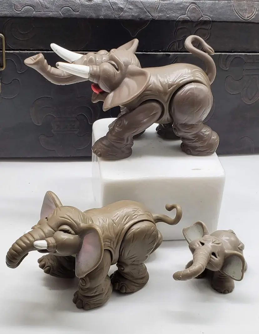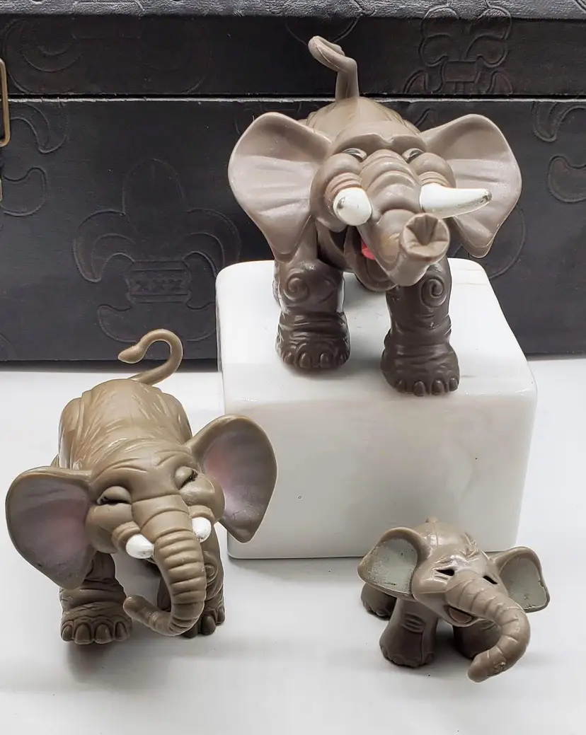 These figures are in great gently played with condition. Please see pictures as they give a detailed idea of condition. They come from a smoke-free home. The largest elephant measures 5" from trunk to tail and is 2.75" tall.