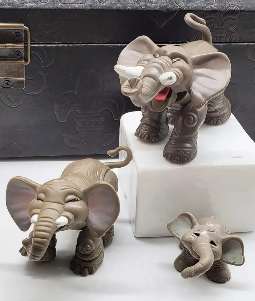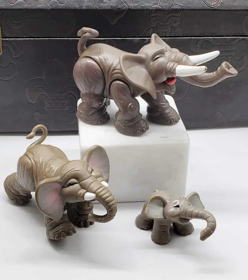This set of vintage Fisher price animals is the family of elephants. Mom and dad are posable, dad's mouth even opens for a trumpet!